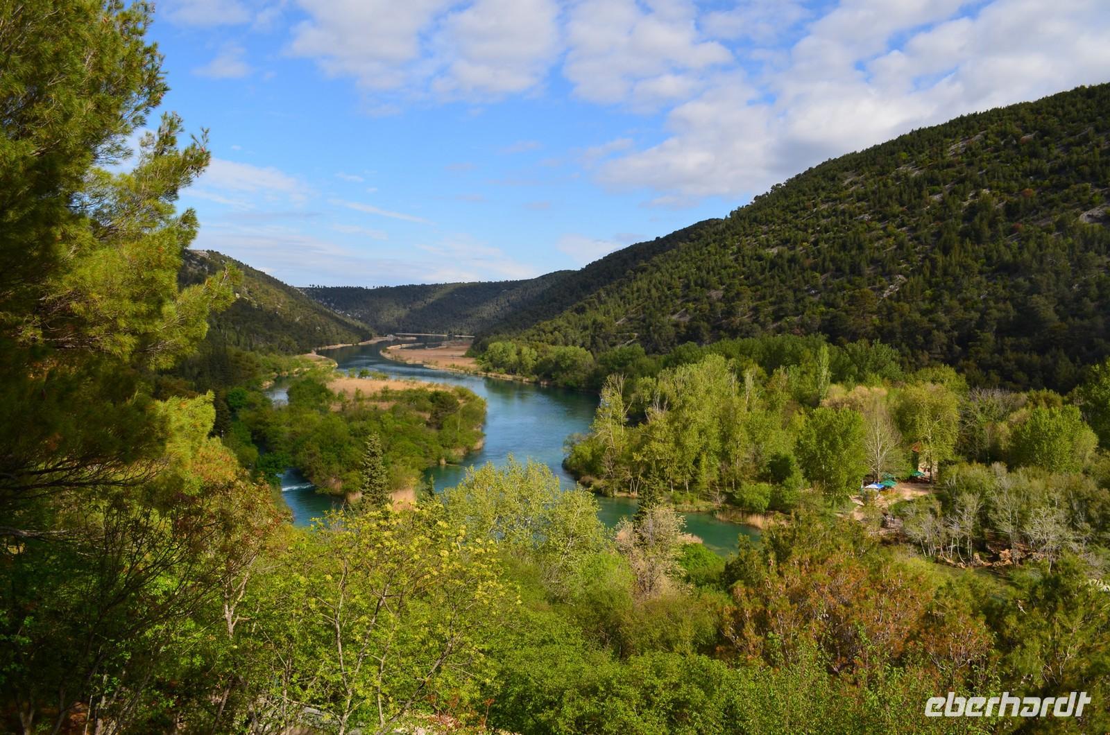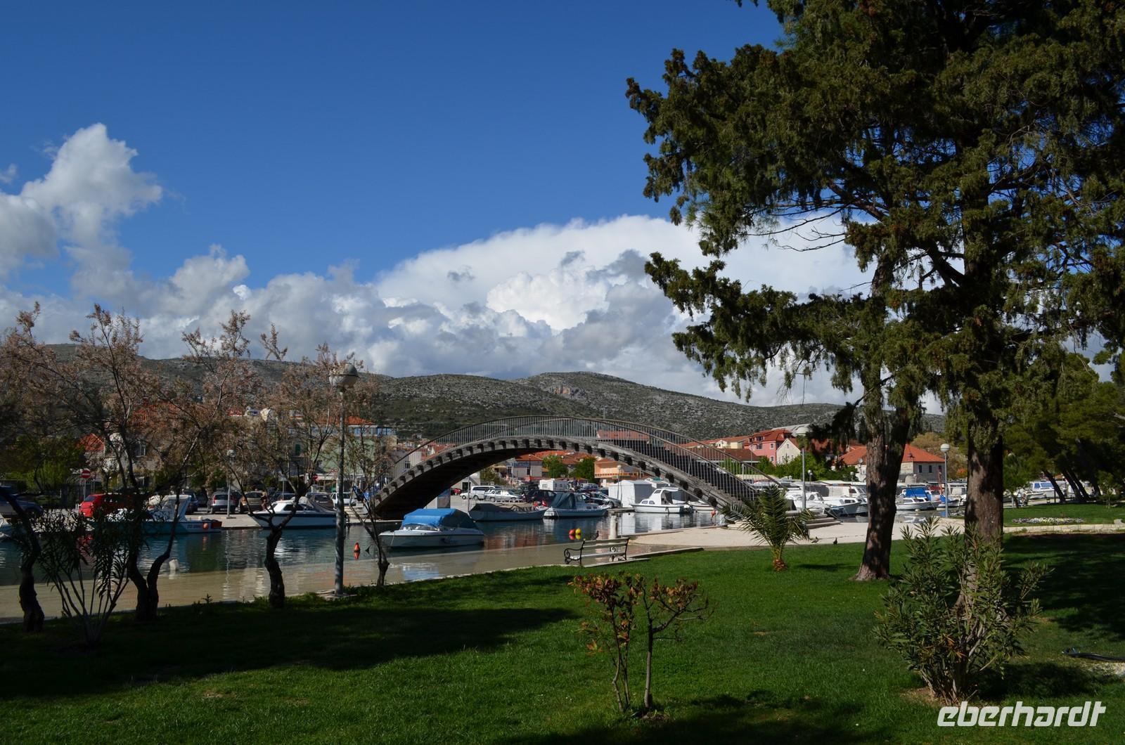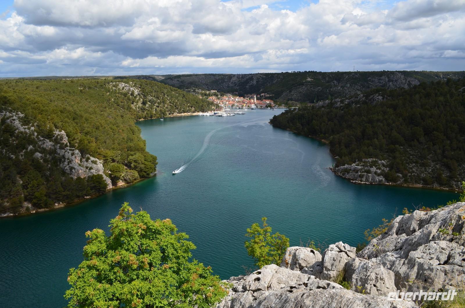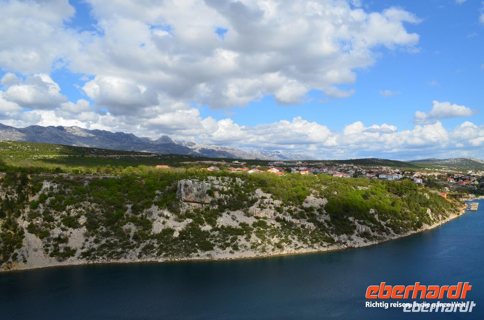Bei der Weiterfahrt nach Zadar stoppen wir an der Krka-Brücke und genießen das Panorama von Brücke, Fluss und der alten Stadt Skradin.