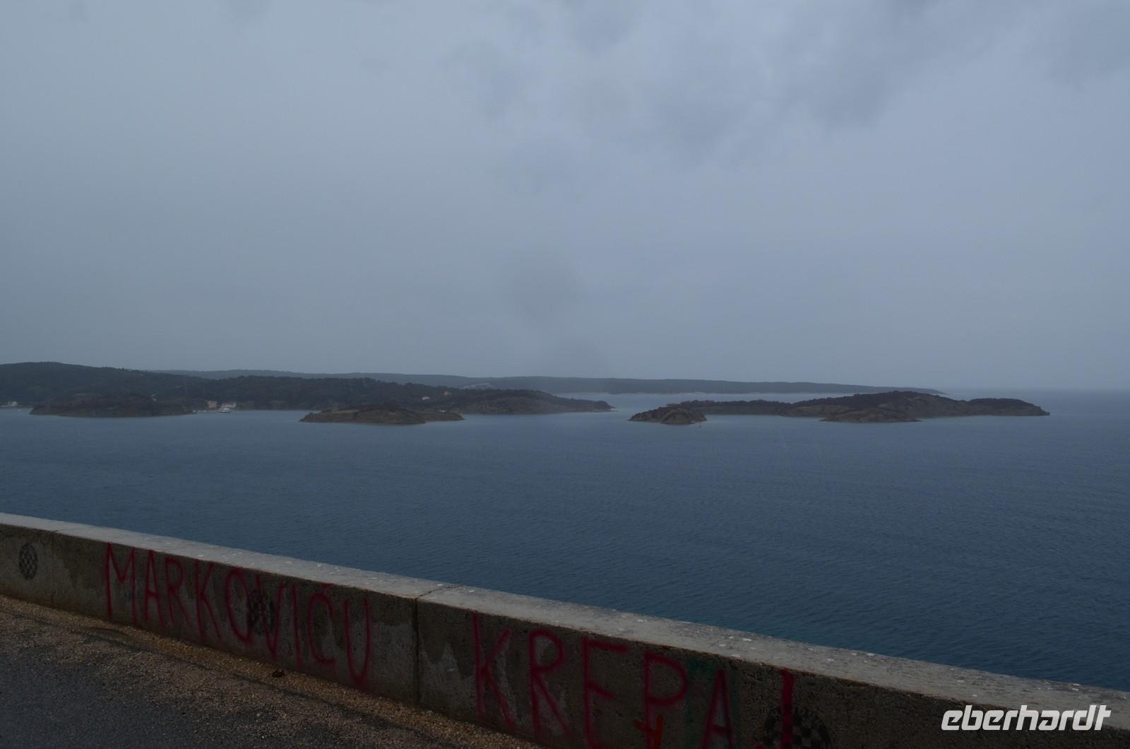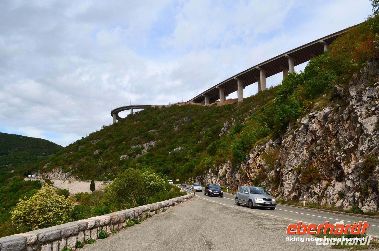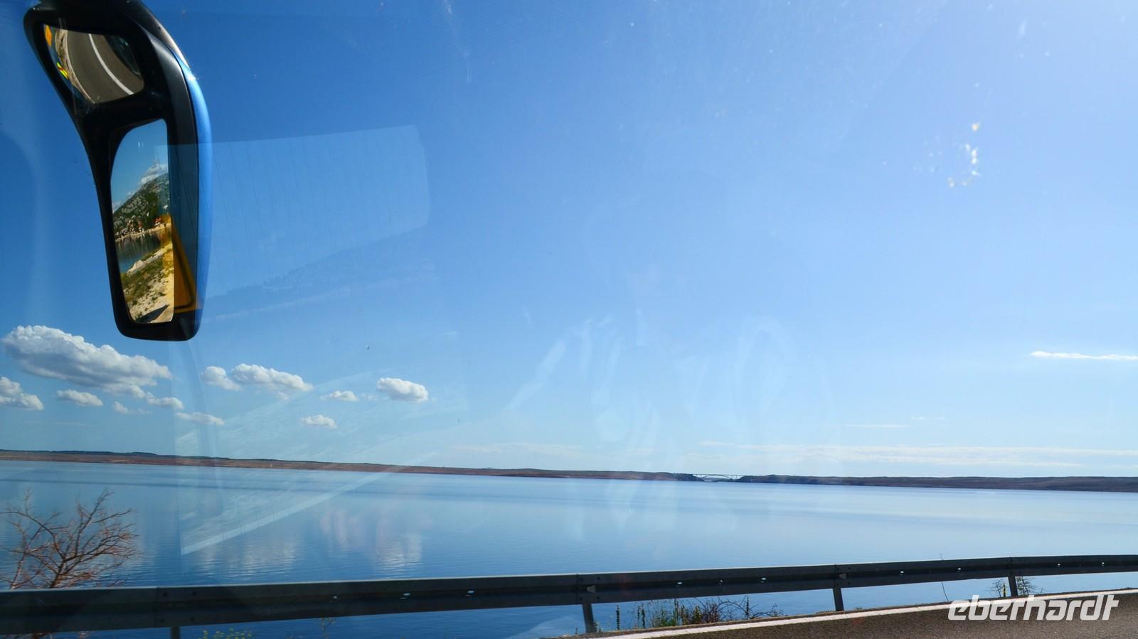 Am Montag starten wir wieder zur Fähre und hinauf geht es nach Rijeka und der Kvarner Bucht. Bei einem schönen Blick auf die Brücke zur Insel Krk halten wir kurz inne. Ebenso in der Kvarner Bucht. Mittag ist an einer Autobahnraststätte, dann erreichen wir die kroatisch-slowenische Grenze.