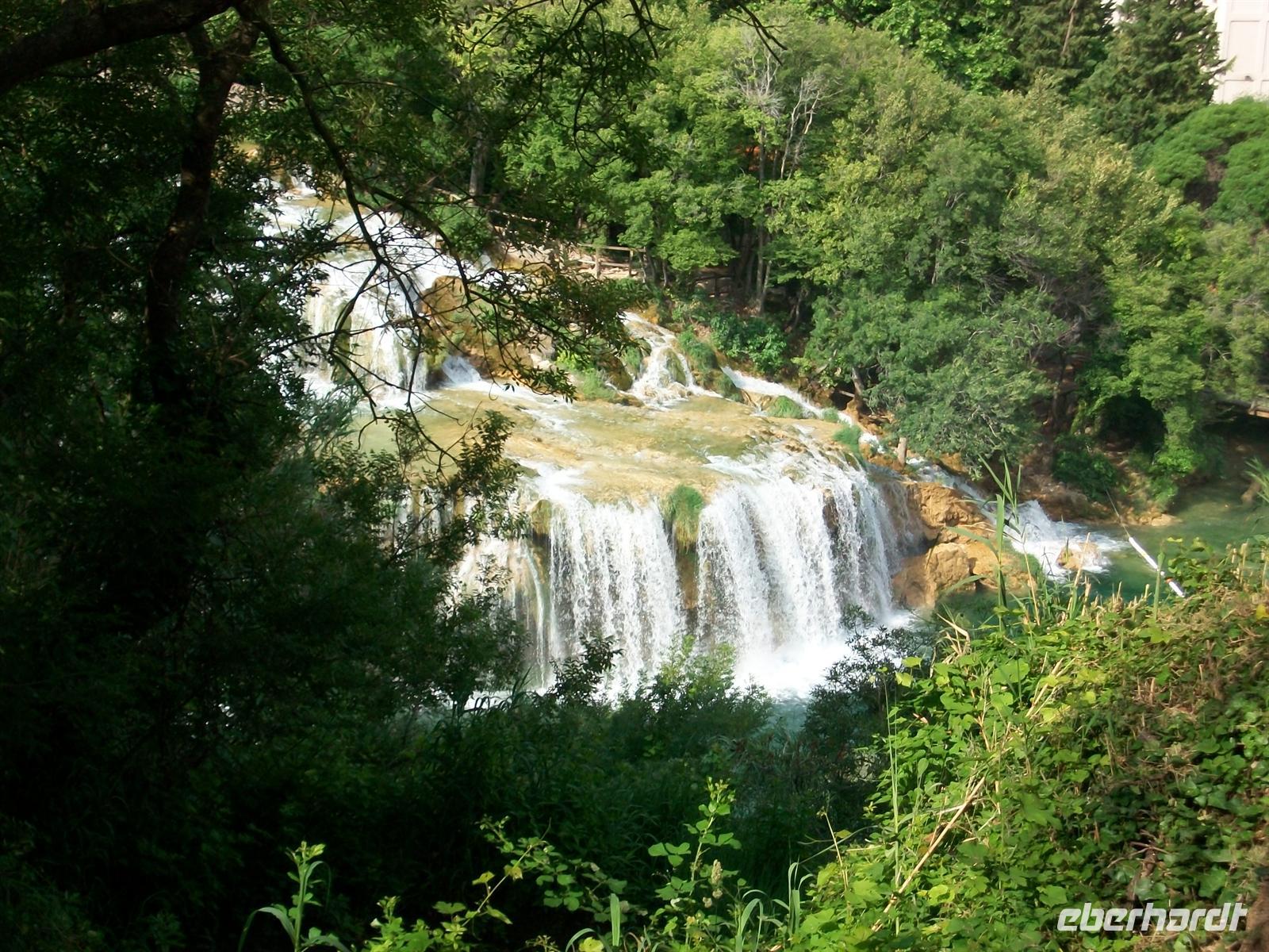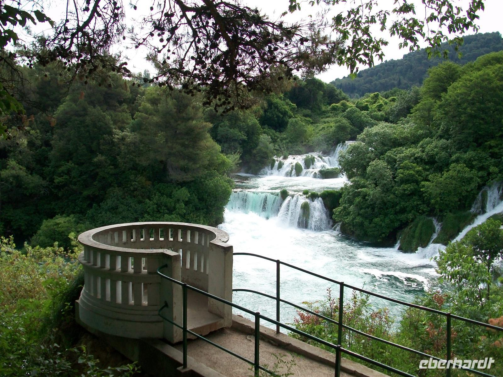 2.6.2012. Als wir kurz nach acht wieder unterwegs sind hat sich der Himmel umwölkt und es ist schon jetzt sehr schwül; droht ein Gewitter? Unser Weg ist nicht lang bald sind wir am Park angelangt. Beim Hinunterfahren über die Serpentinenstraße weitet sich der Blick auf die Krka die an dieser Stelle einen See bildet und mit ihrer grünlichen Farbe schon von hier das Auge erfreut. Dann sind wir zu Fuß unterwegs, mächtig brausend hören wir den Wasserfall der gerade von den oberen Aussichtspunkten besonders grandios erscheint.