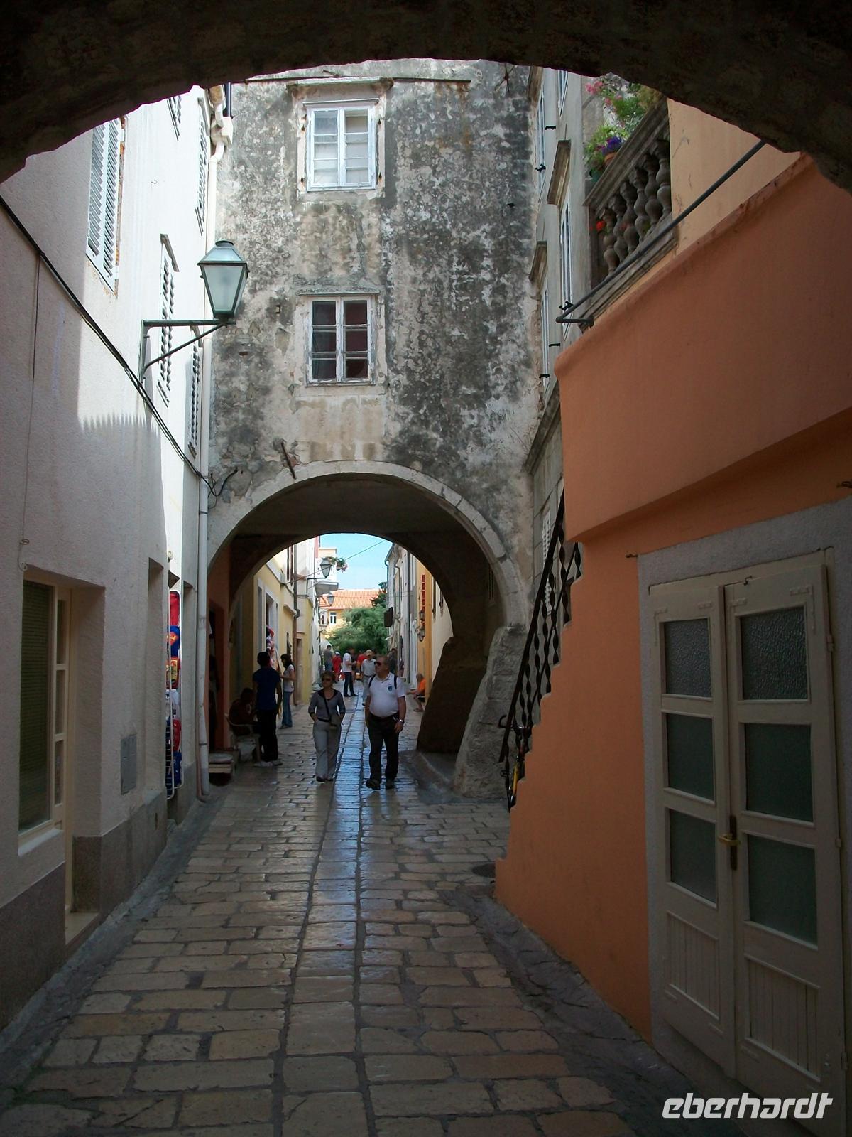 3.6.2012. Es war etwas windig über Nacht aber in das Restaurant des Hotels lacht die Sonne hinein; hier ist die erste Labung des Tages vorbereitet: das leckere und reichhaltige Frühstücksbüffet. Am heutigen Tag wird alles sehr ruhig verlaufen. Um neun werden wir schon von Viktor unserem örtlichen Führer erwartet, er wird uns nun eine wahre Perle der Nordadria zeigen- Rab. Ich habe schon des Öfteren über diesen Ort geschrieben, er zählt zum Schönsten was ich auf meinen bisherigen Reisen schauen durfte. Durch den Park der unser Hotel umgibt kommt man direkt zum Hafenbecken. Im Hintergrund ist das Velebitgebirge zu sehen und rechts dehnt sich, wie auf einem schmalen Bootsdeck, die Altstadt von Rab aus. Dann sind wir schon in den schmalen Gassen unterwegs und entdecken die pittoresken Häuser und andere reizvolle Dinge dieser Siedlung aus vergangenen Jahrhunderten. Wir schlendern die untere Hauptgasse entlang