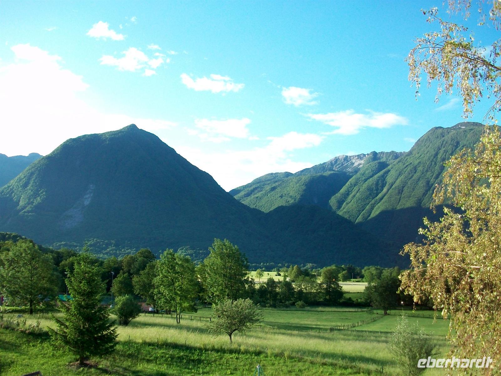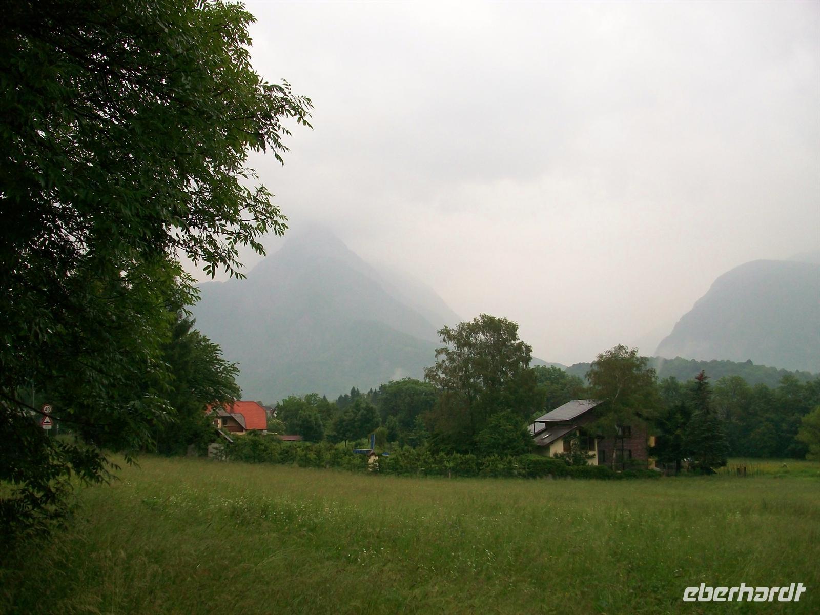 Dann sind wir im Hinterland unterwegs, hier hat sich nun der Himmel bezogen, wird Petrus seine gute Laune verlieren? Nach der Grenze zu Slowenien geht es am bekannten Gestüt Lipica vorbei und später dann hinunter ins Wippachtal. Vorbei an den Hängen des Nanosgebirges durchfahren wir Nova Gorica um etwas später im Soatal unterwegs zu sein. Dieses Tal ist sehr malerisch, der Fluss bringt die eigenartig grünen Fluten aus den Bergen um sie der Adria zuzusenden. Wir folgen der Soa aufwärts und durchfahren dabei so manch schönen Ort. Hinter Kobarid sind wir dann im Hochgebirge angelangt; leider haben sich die oberen Spitzen heute mit Wolken bedeckt. Nun fängt es auch noch an zu regnen, mächtige graue Wolkenfronten ziehen wabernd durchs Tal und entledigen sich ihrer nassen Last. Der schöne Spaziergang durch Bovec fällt leider ins Wasser aber es ist trotzdem interessant dem Tun der Elemente zuzuschauen.