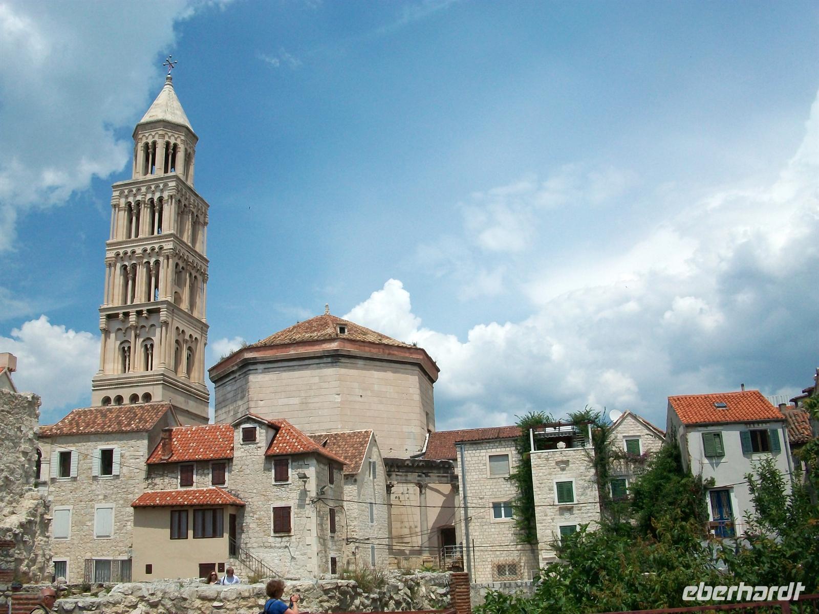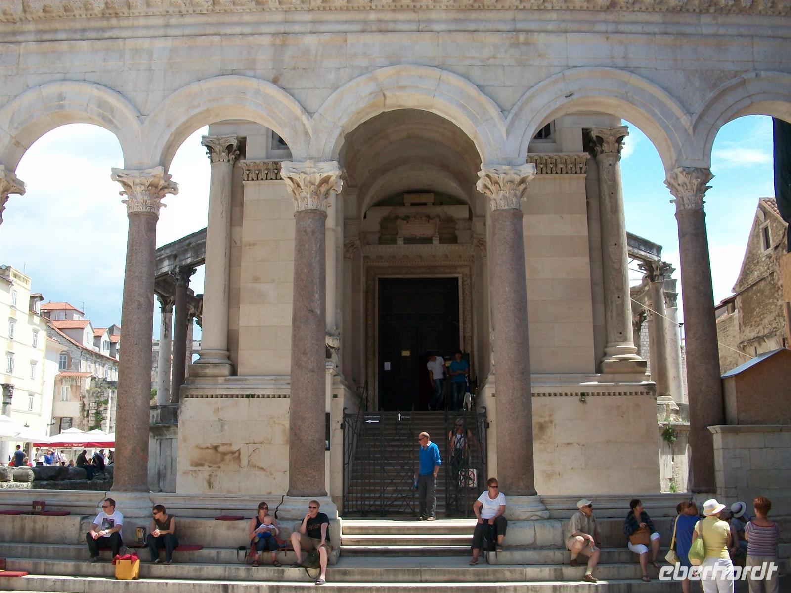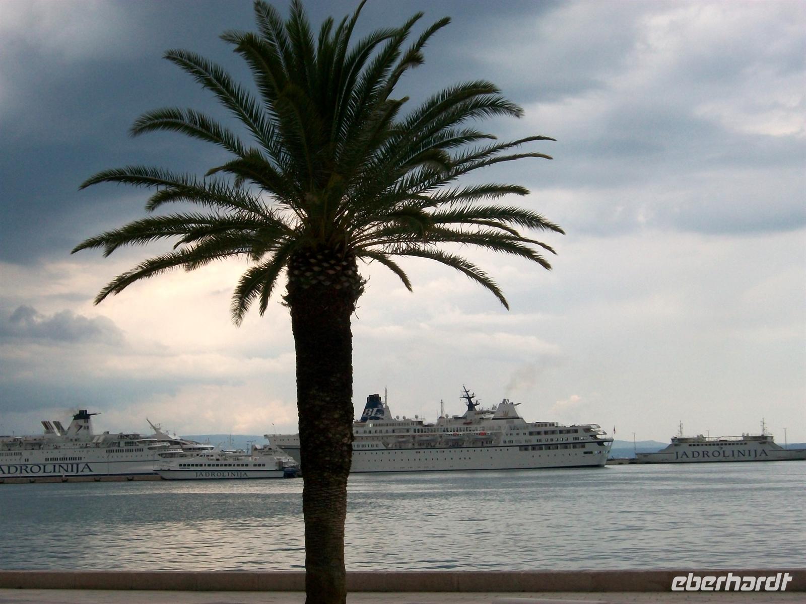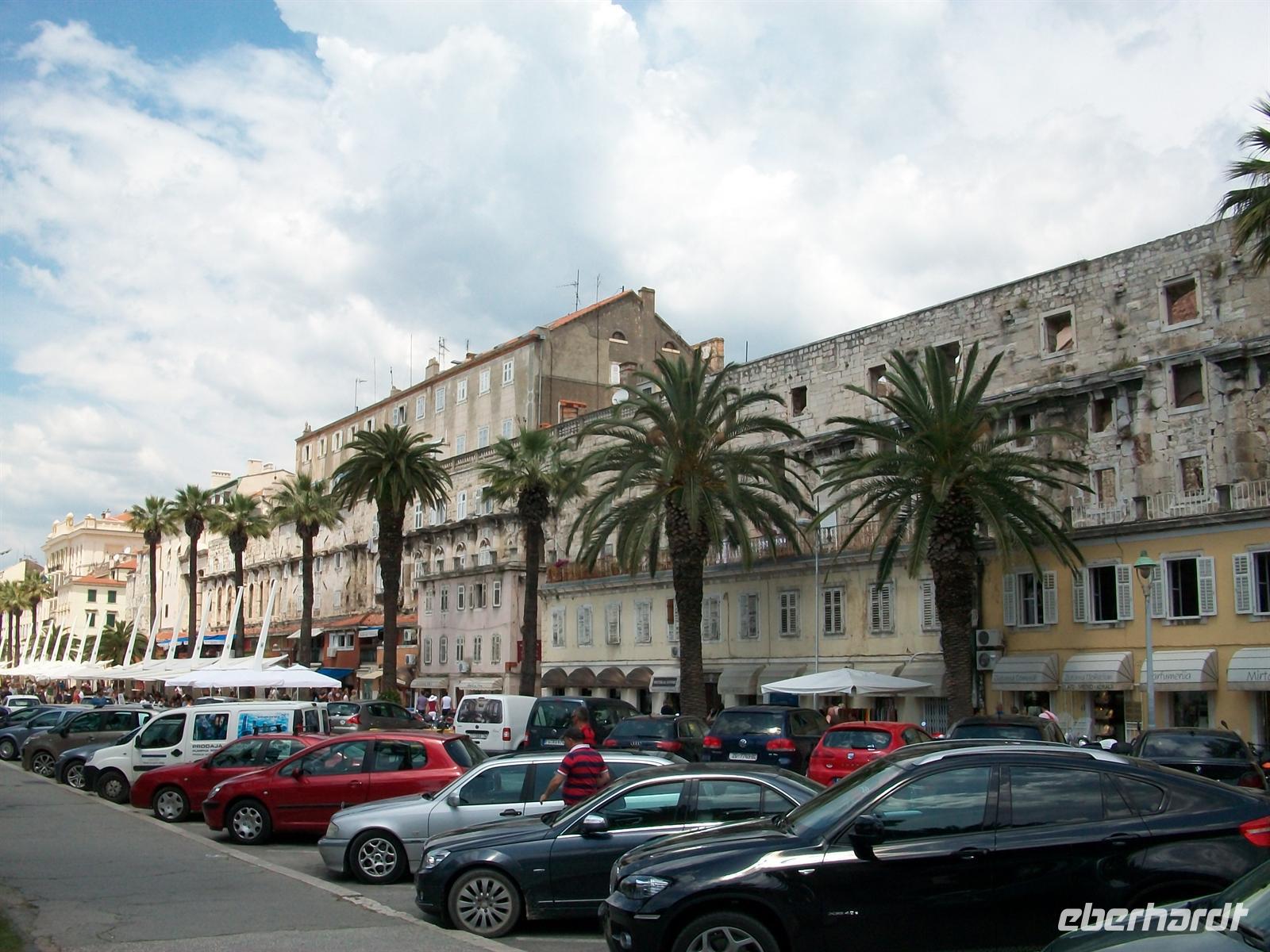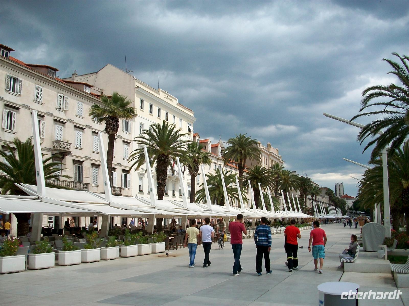 Beim Aussteigen ist eine drückende Gewitterschwüle zu bemerken, noch aber ist kaum eine Wolke zu sehen als wir die Führung beginnen. Sie startet auf der Riva unter Palmen, der schönen Uferpromenade von Split. Früher ging das Wasser bis zu den Mauern des Palastes des Diokletian; es war der Römische Kaiser der sich seiner Zeit dieses Bauwerk erschaffen lies. Gewaltig sind heute noch die Mauern anzuschauen, die im Innern liegenden Gebäude sind im Mittelalter und später entstanden- ein interessanter Mix.