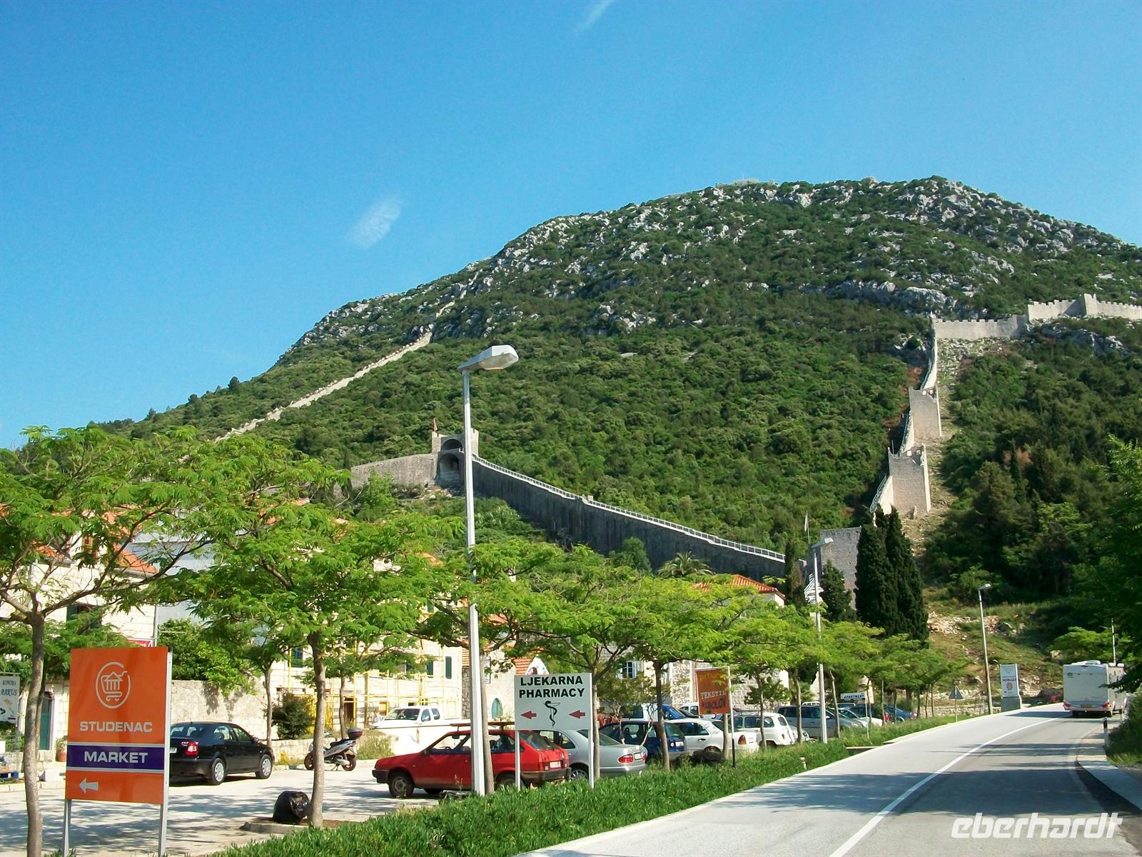 Eine Stunde nach Abfahrt haben wir unser erstes Ziel erreicht. Nachdem wir die Verbindungsstraße die Halbinsel Pelješac befahren haben, stehen wir nun staunend vor den mächtigen Schutzmauern die einst den Salzabbau der Republik Ragusas beschützten. Bis in den Berg hinein verlaufen die Mauern- immer wieder ein gigantischer Anblick.