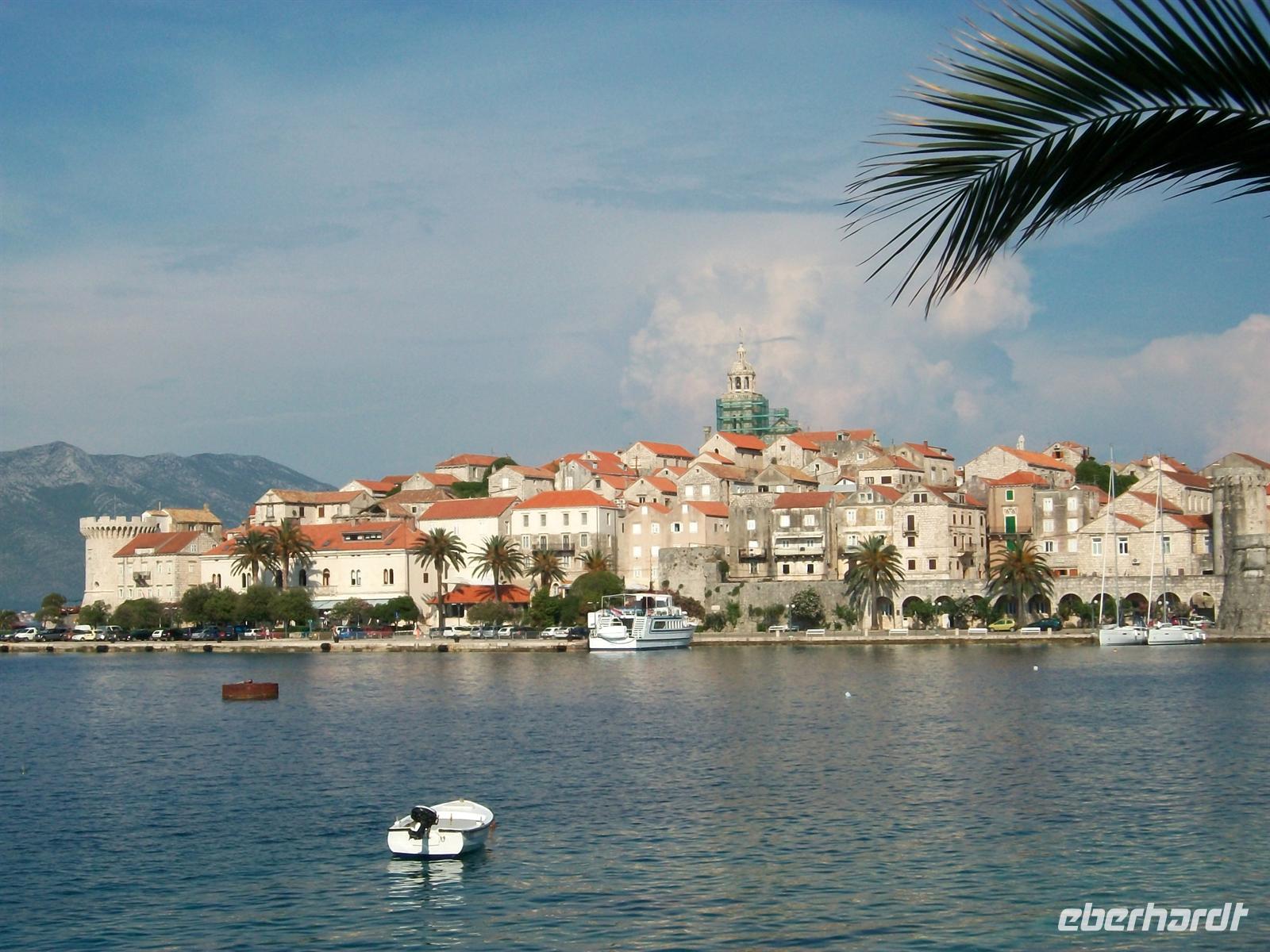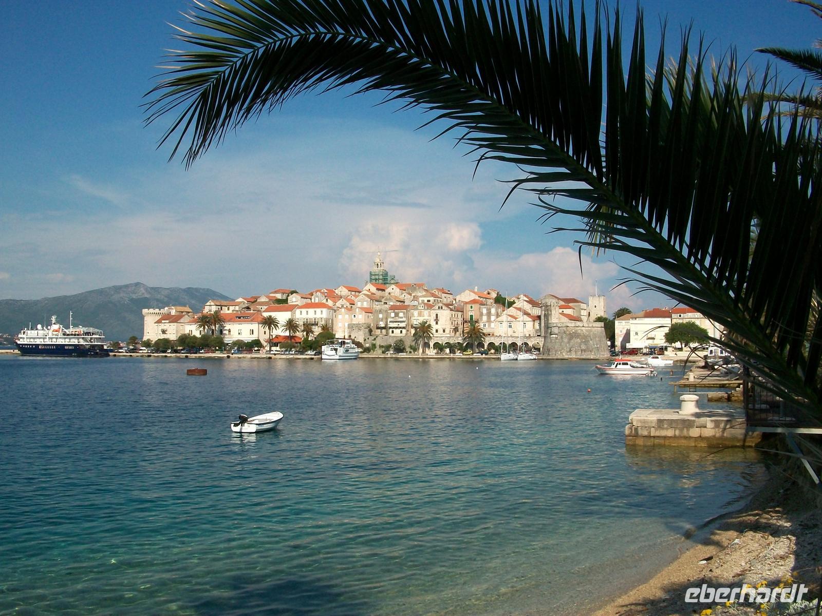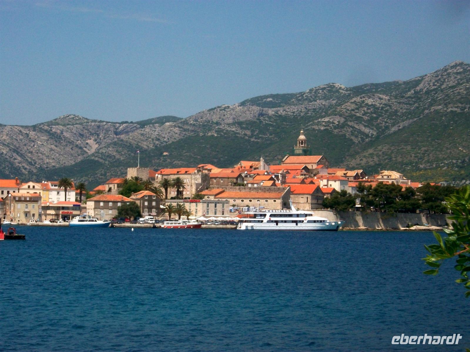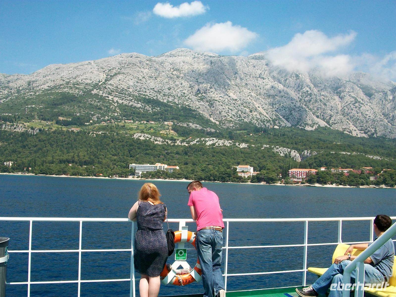 Dann geht es hinunter auf das Meeresniveau, im Ort Orebi besteigen wir halb zwölf die Autofähre und sind dann unterwegs zur Insel Korula. Langsam zieht auch der mittelalterliche Ort vorbei, von hier aus ist er besonders gut zu sehen mit seiner malerischen Lage auf einer felsigen Anhöhe.
