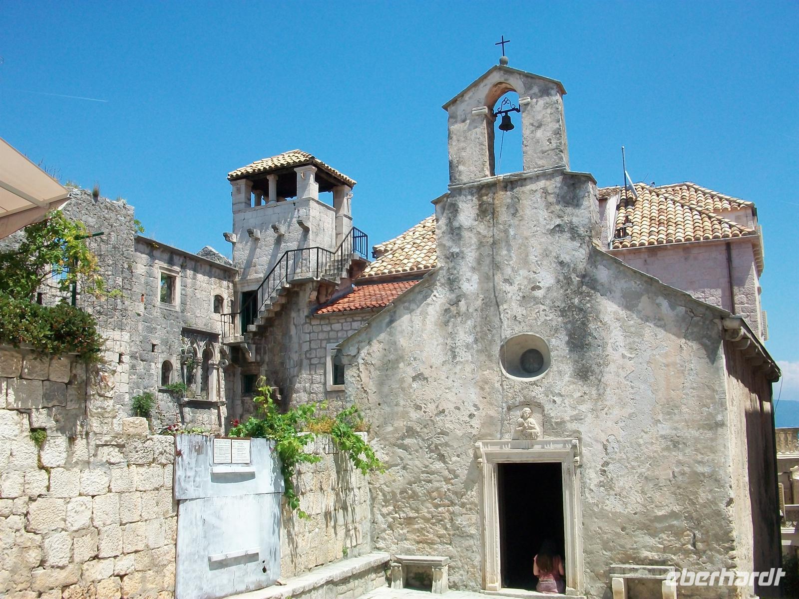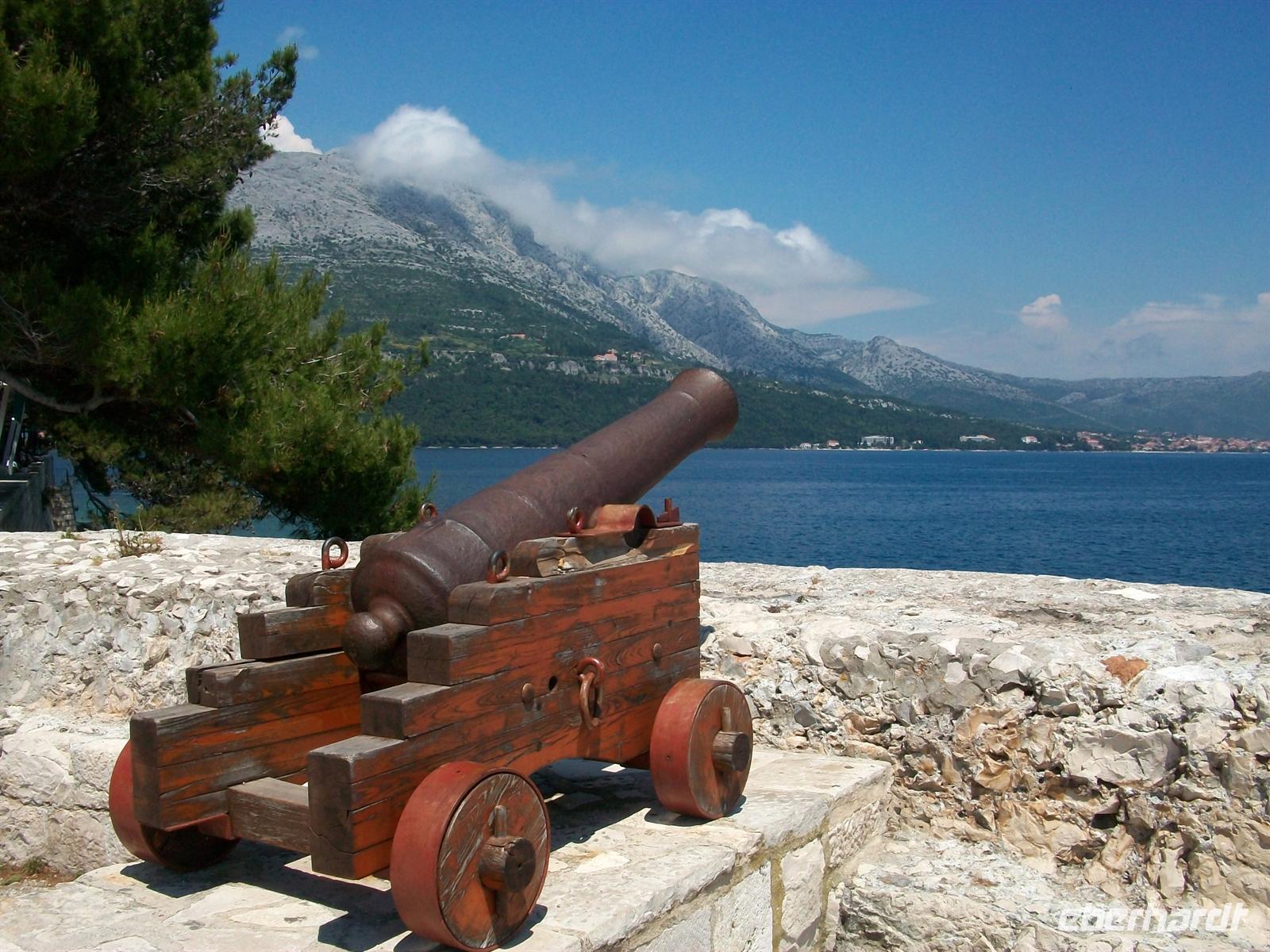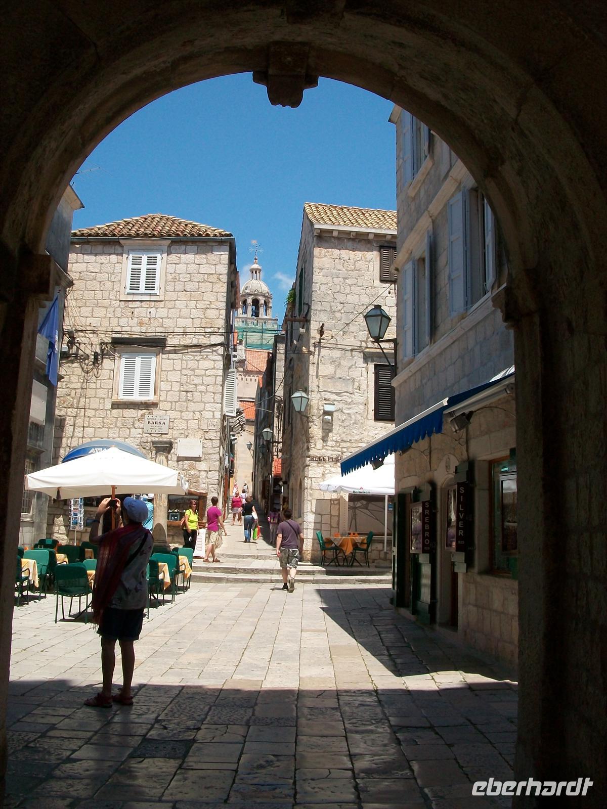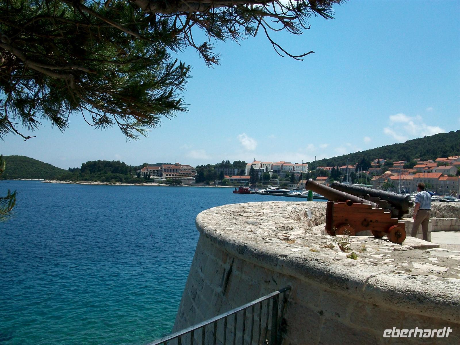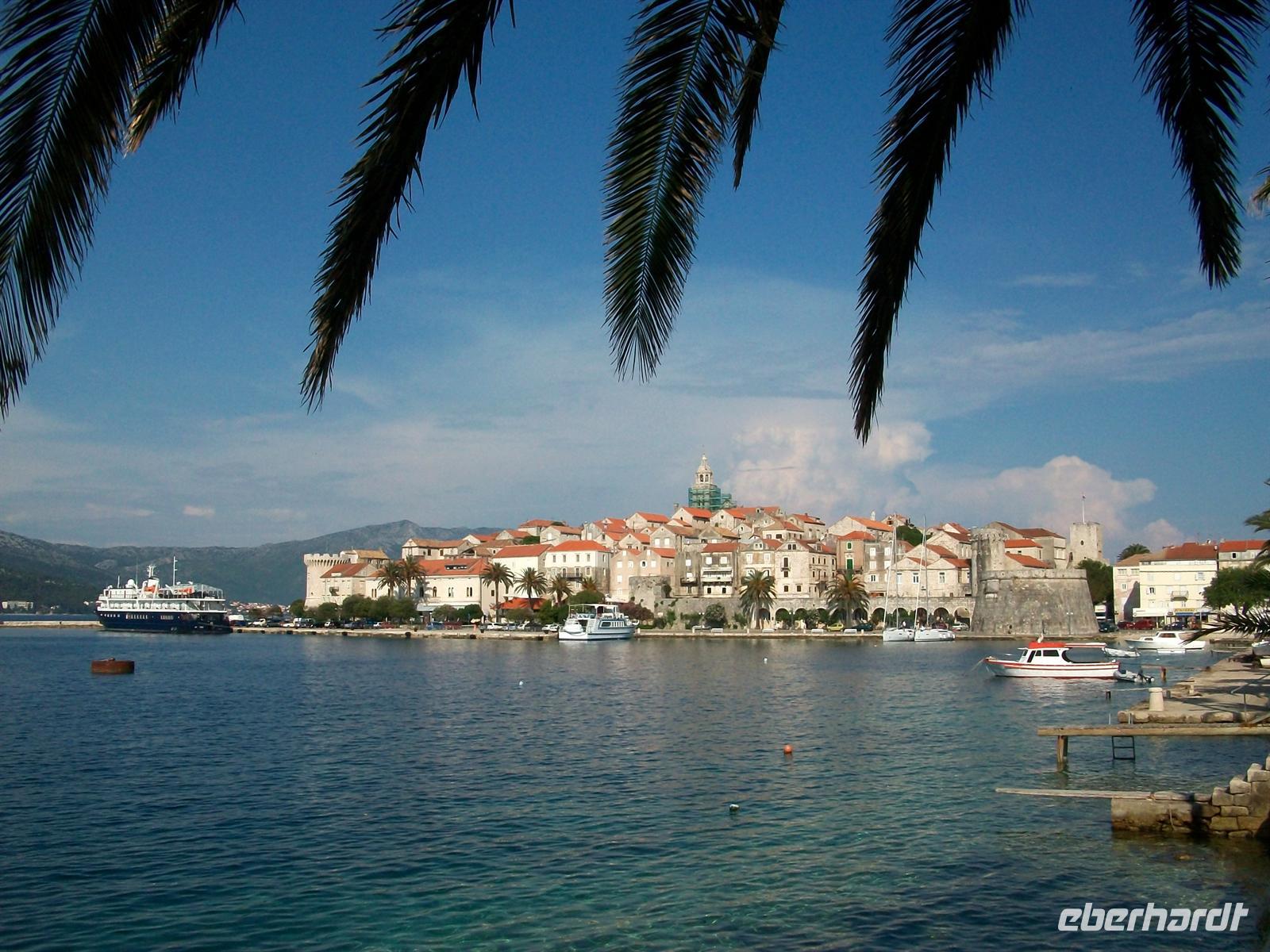 Dann geht es hinunter auf das Meeresniveau, im Ort Orebi besteigen wir halb zwölf die Autofähre und sind dann unterwegs zur Insel Korula. Langsam zieht auch der mittelalterliche Ort vorbei, von hier aus ist er besonders gut zu sehen mit seiner malerischen Lage auf einer felsigen Anhöhe.
