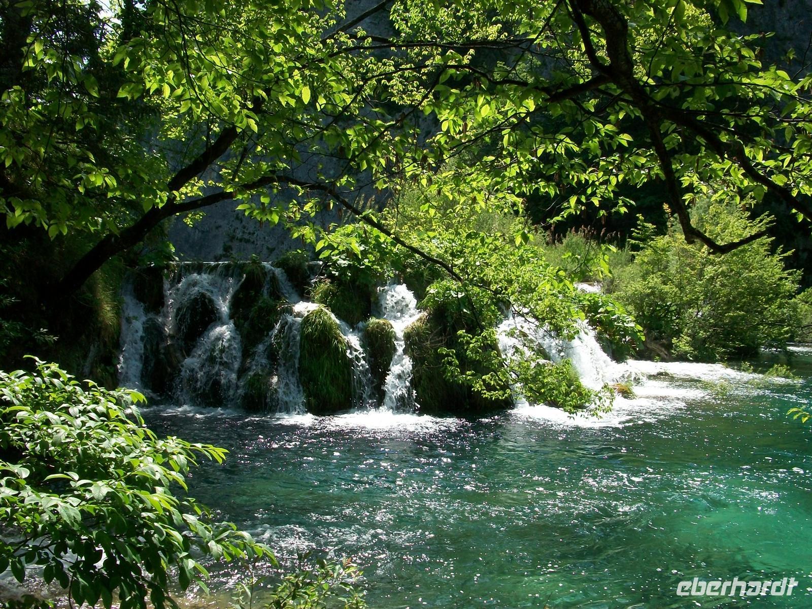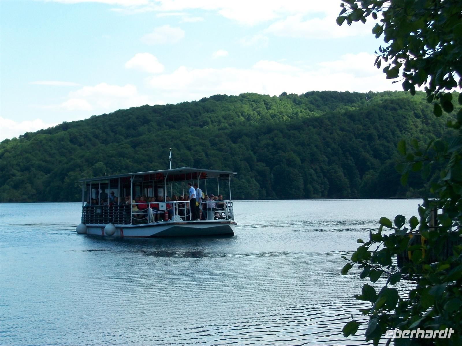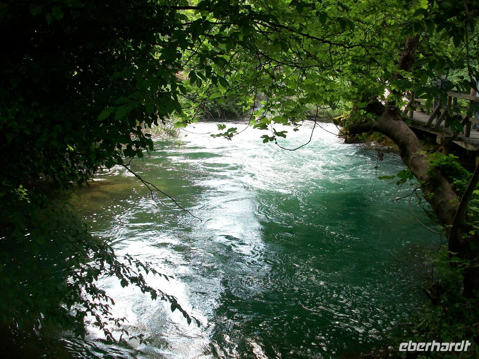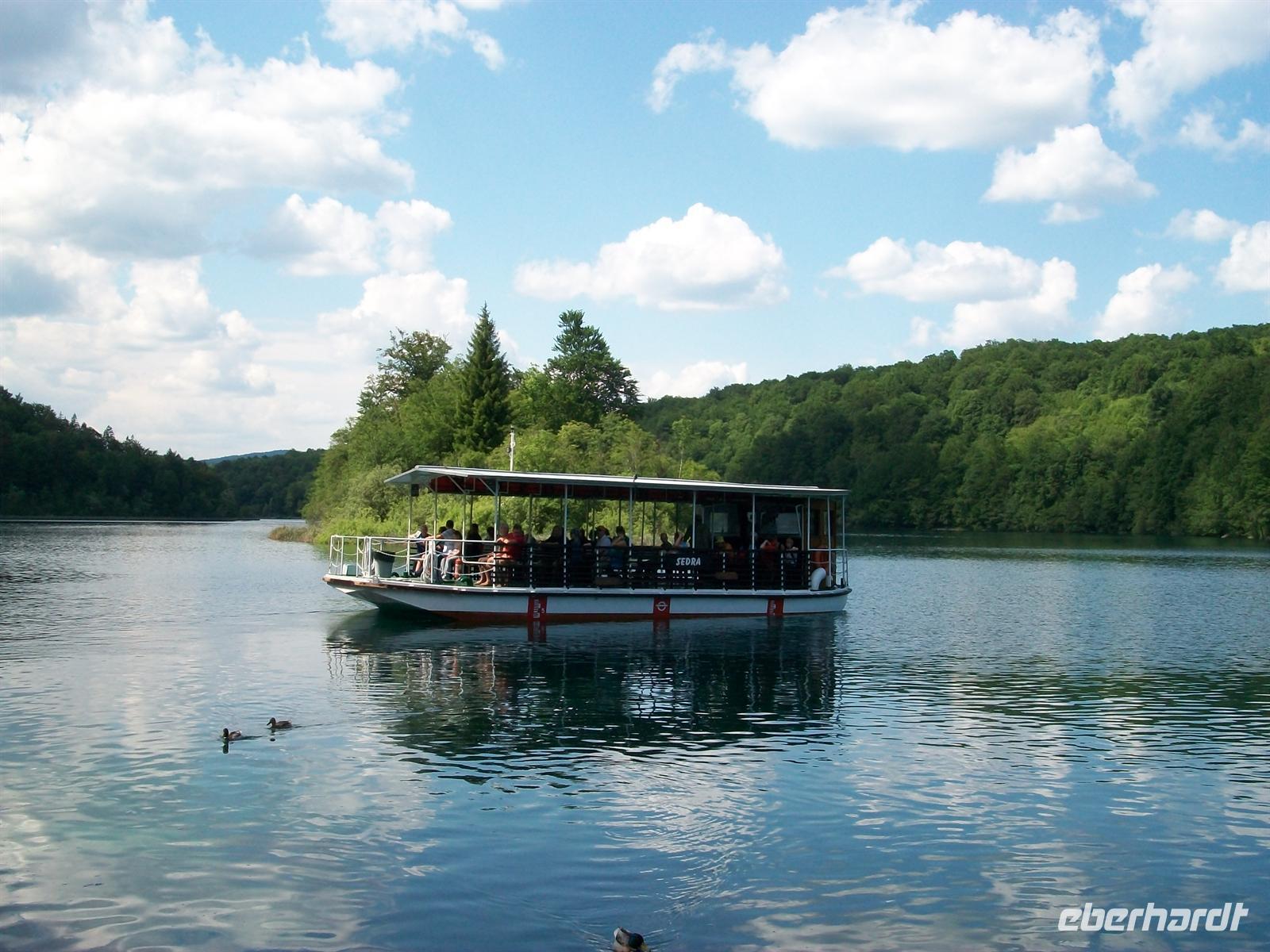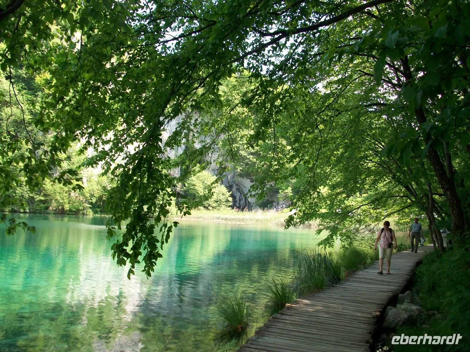 Dann führt uns der Weg aufwärts, wir überqueren auf einem Knüppeldamm den See der im Karl- May- Film der Silbersee war und sehen auch die Schatzhöhle. Wir gelangen entlang der zahlreichen Kaskaden immer höher, sind mitten drin im rauschenden Element, dann wieder an den Seen unterwegs wo es eine himmlische Ruhe gibt. Im Wasser stehen die zahlreichen Saiblinge mit ihrer golden glitzernden Haut, sie genießen wie wir diesen schönen sonnigen Tag. Dann sind wir am Schiffsanleger angekommen und es beginnt die geruhsame Fahrt auf dem See. Langsam zieht die schöne Landschaft vorüber, das saftige Grün der Bäume widerspiegelt sich im Wasser mit seiner türkisenen Farbe- ein Genuss.
