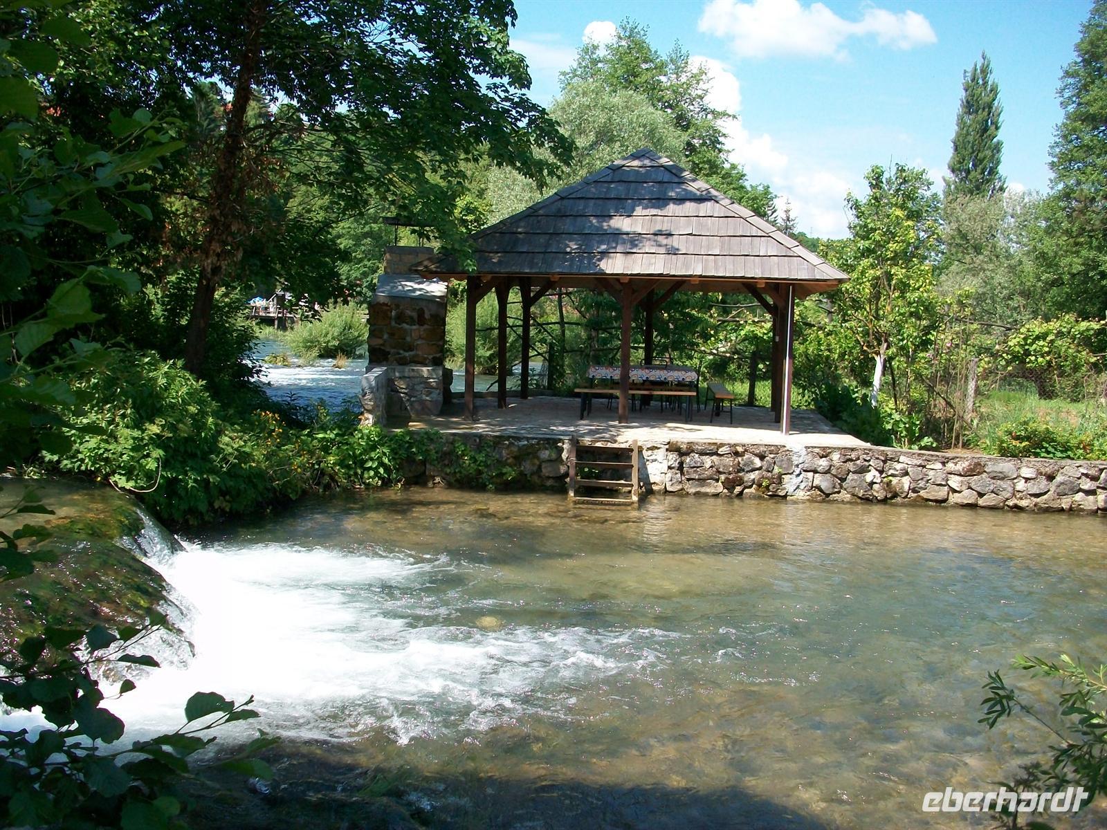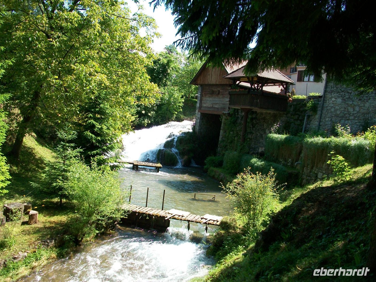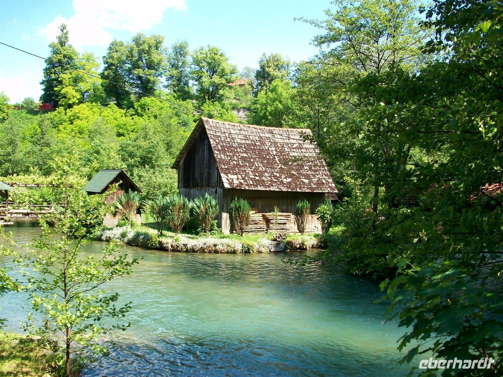 28.5.2012. Unser Weg führt uns heute erst einmal auf der Landstraße entlang, wir sehen Häuser die im letzten Krieg zerstört wurden und auch viel Neues was danach entstand. Das Leben geht weiter und so haben die Leute sich hier eingerichtet, nicht zuletzt spielen die zahlreichen Touristen die auf dieser Straße entlang kommen eine große Rolle, sie wollen dem Nationalpark einen Besuch abstatten und machen häufig hier Rast. Beispielgebend dafür ist der Ort Slunj mit der Wassermühlensiedlung Rastoke.