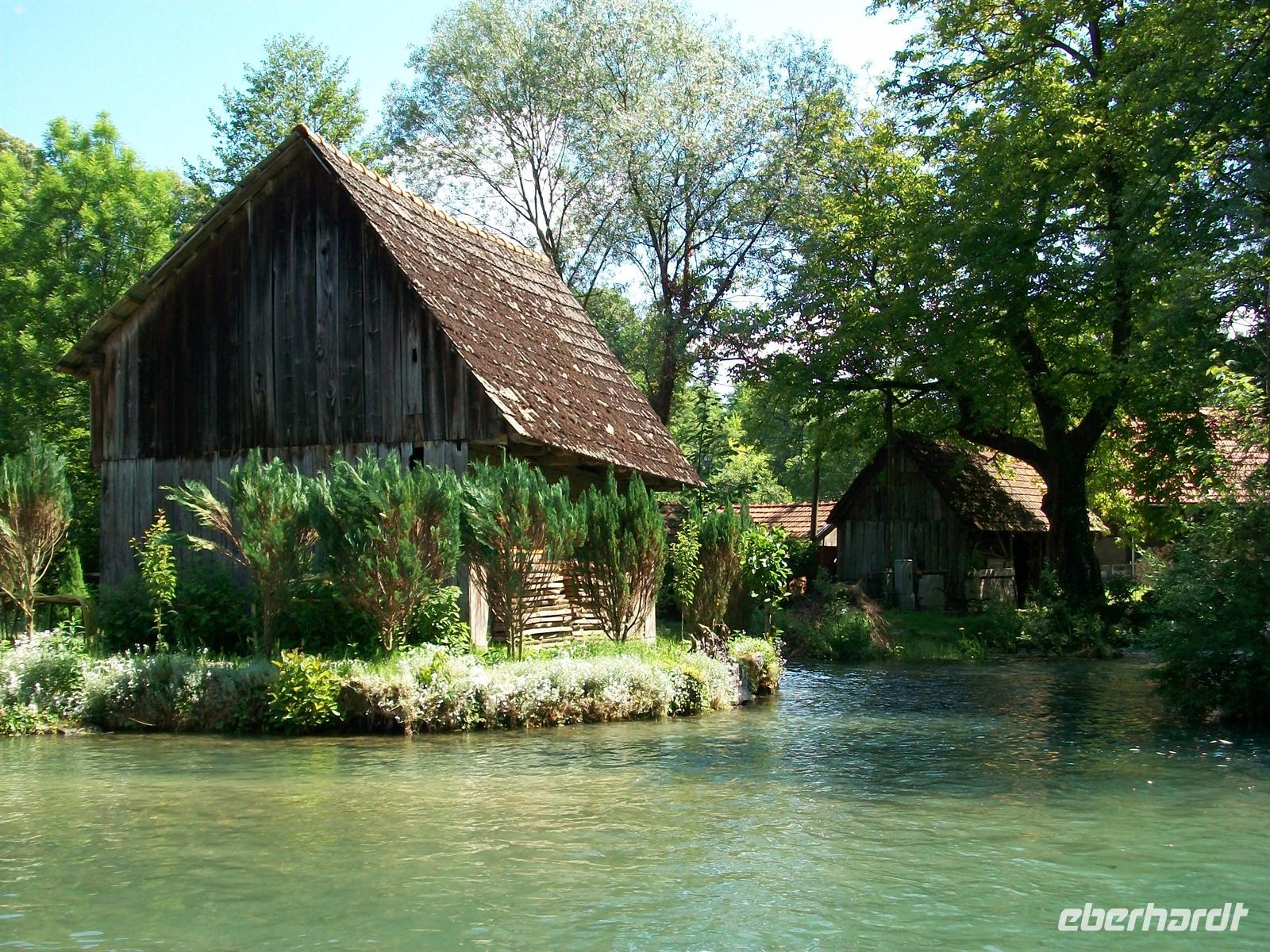 Noch eindrucksvoller ist aber der Blick von unten, auf einer Brücke stehend sehen wir wie uns die Wasser entgegenkommen und hinter uns friedlich in Richtung Adria abfließen. Auf unserem Rundweg kommen wir immer wieder an schönen Aussichtspunkten vorbei, hier können wir den Blick hinunter schweifen lassen auf die fallenden Wasser des Parks; die Urkraft der Natur ist immer wieder beeindruckend! Vorbei an den ethnologischen Sammlungen die uns das Leben und die Arbeit vergangener Zeiten zeigen, beenden wir den Rundgang, es verbleibt noch Zeit für eigene Erkundungen und so manch spektakuläres Foto kann noch für das Fotoalbum festgehalten werden.