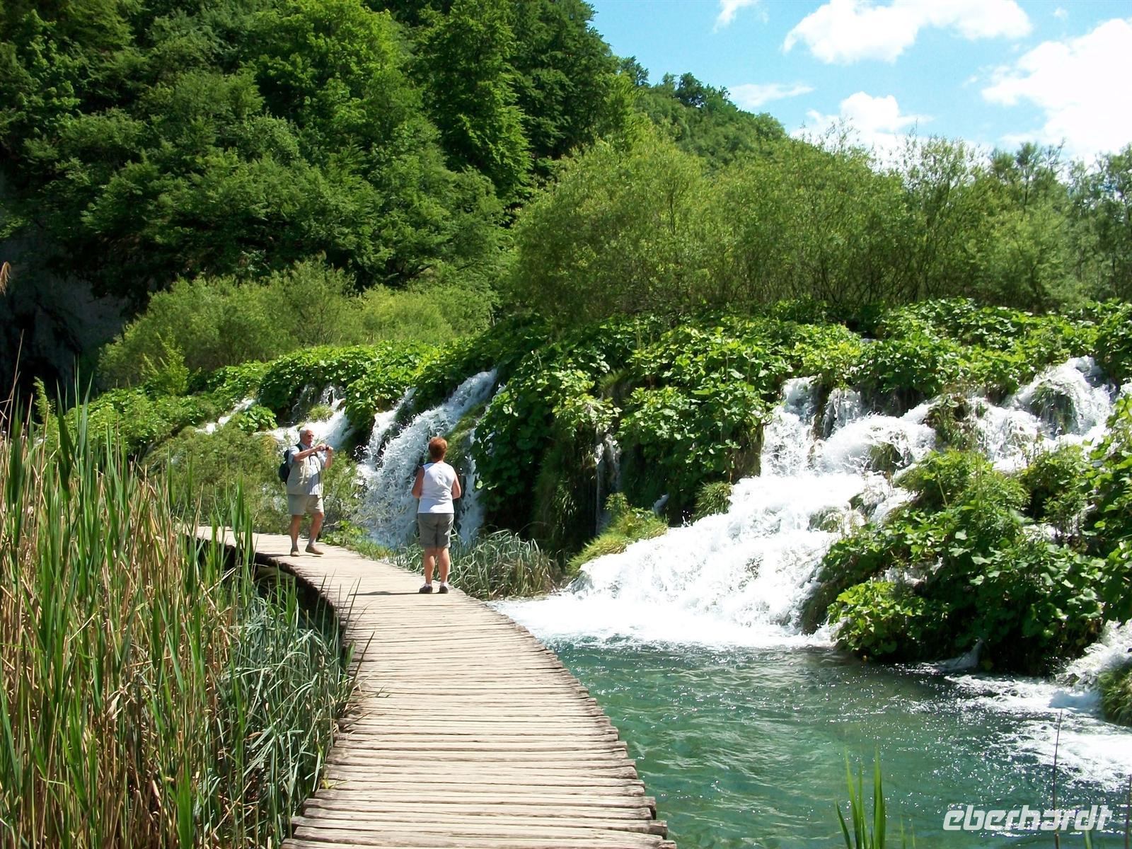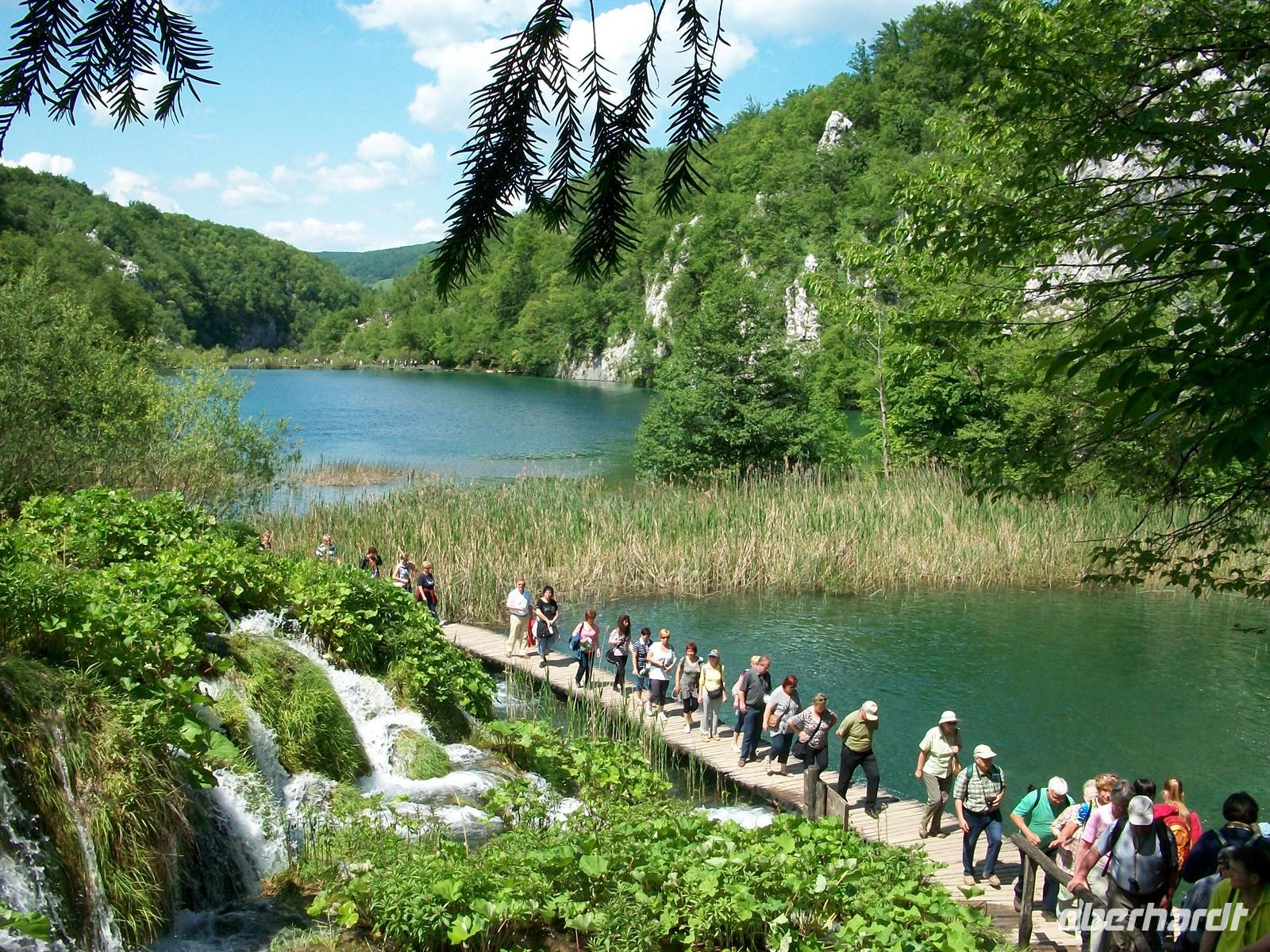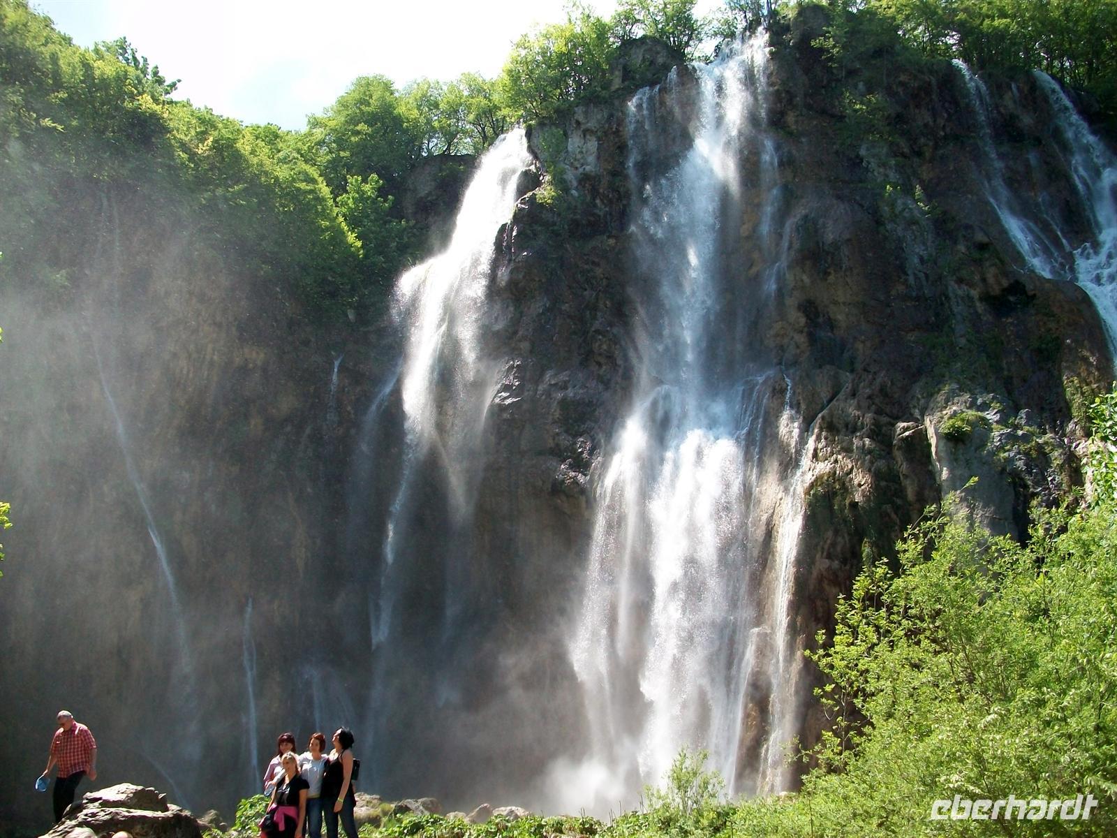 Dann geht es weiter, wir kommen an unserem Hotel an, genehmigen uns einen kleinen Mittagsimbiss und starten dann zur Besichtigung dieser einmaligen Naturschönheit: den Plitwitzer Seen. Gleich nach dem Eingang hören wir schon das mächtige Brausen des Großen Wasserfalls, von oben sehen wir dieses Naturwunder. Dann führt uns der Weg hinunter, wir überqueren den ersten See über einen Knüppeldamm und stehen dann staunend vor dem Wasserfall der seine Wasser aus fast 80 Metern zu uns hinunter sendet. Ein Schleier feinsten Wasserstaubs netzt das Gesicht und hier wird offenbar wie mächtig Mutter Natur ist. Das Wasser zerstiebt zu unseren Füßen und vereinigt sich dabei wieder; als Fluss nimmt es den Weg weiter abwärts.