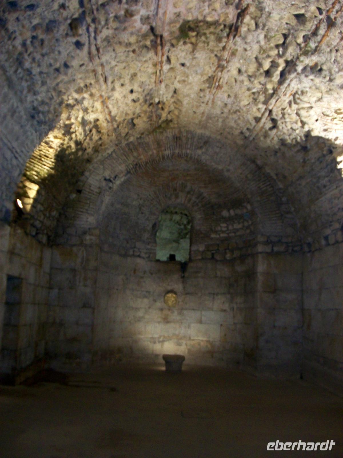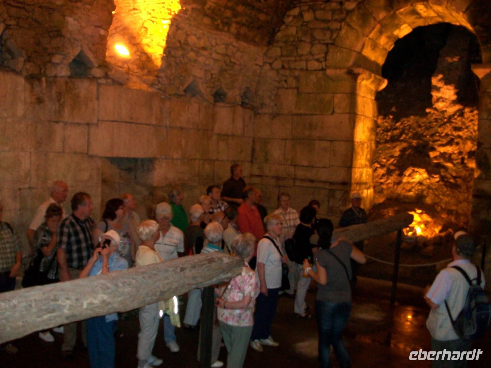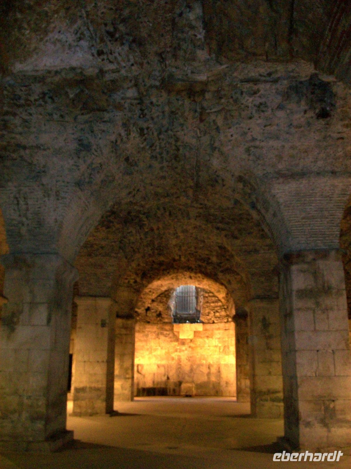Nun tauchen wir durch das Südtor ein in den Palast und gehen gleichsam fast zweitausend Jahre zurück in der Zeit. Die Mauern atmen den Geist des Römischen Imperiums, gigantische Kalksteinquader halten die Konstruktion und besonders hier unten wird offenbar: die Römer haben für die Ewigkeit gebaut. Wie viele Erdbeben und andere Naturkatastrophen hat es bisher gegeben, zahllose Kriege und Zerstörungen haben jüngere Bauten hinweggefegt, die Römischen Mauern sind geblieben.