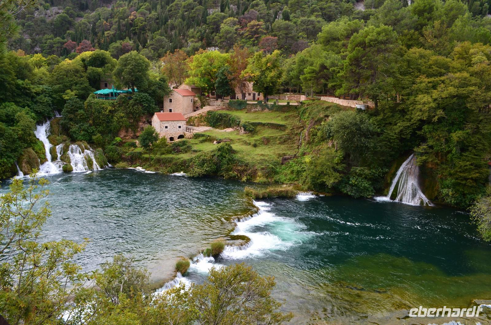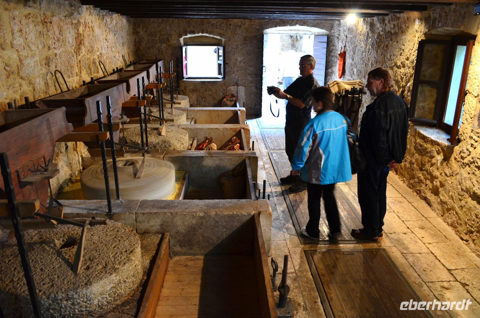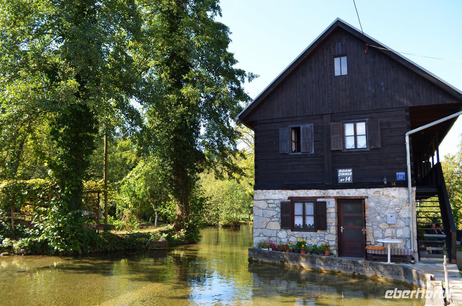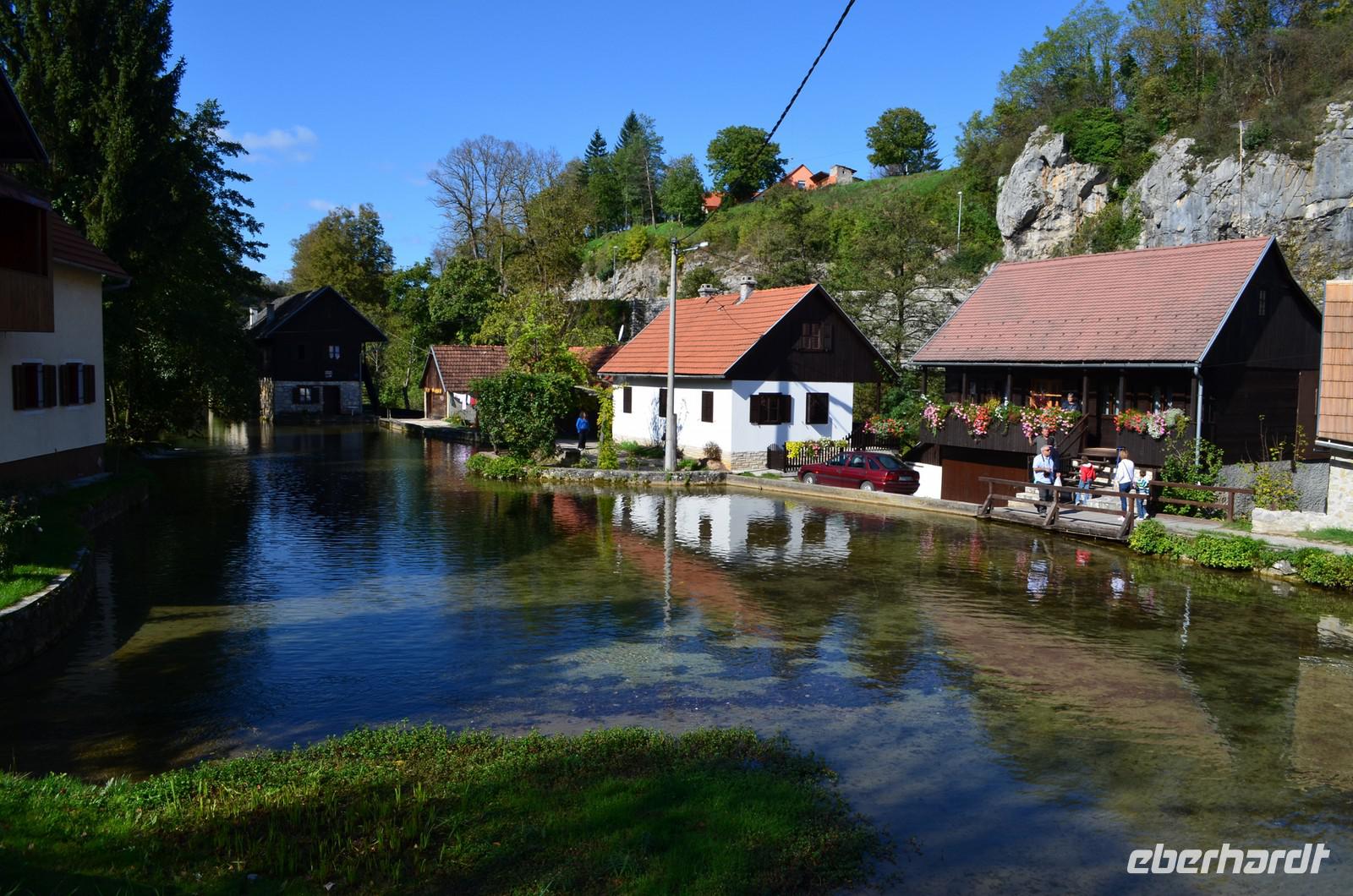 Die Sonne strahlt und nach reichhaltigem Frühstück machen wir uns gestärkt wieder auf den Weg. Wir nutzen zuerst ein Stück die Autobahn und es geht entlang der Auen der Drava Richtung Karlovac. Hier biegen wir auf die E 71 Richtung Plitvice ab, wo wir gegen 10:00 Uhr die Wassermühlensiedlung Rastoke vor Slunj erreichen. Es ist sehr schönes Wetter und so führt uns ein gemeinsamer Spaziergang durch das Mühlendorf. Die Müllerin Mare Kovacevic führt uns ihre Mühle vor. Der Antrieb ist eine Konstruktion, wie sie sonst nur noch in Marokko zu finden ist.