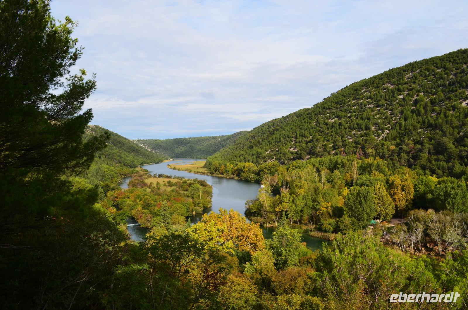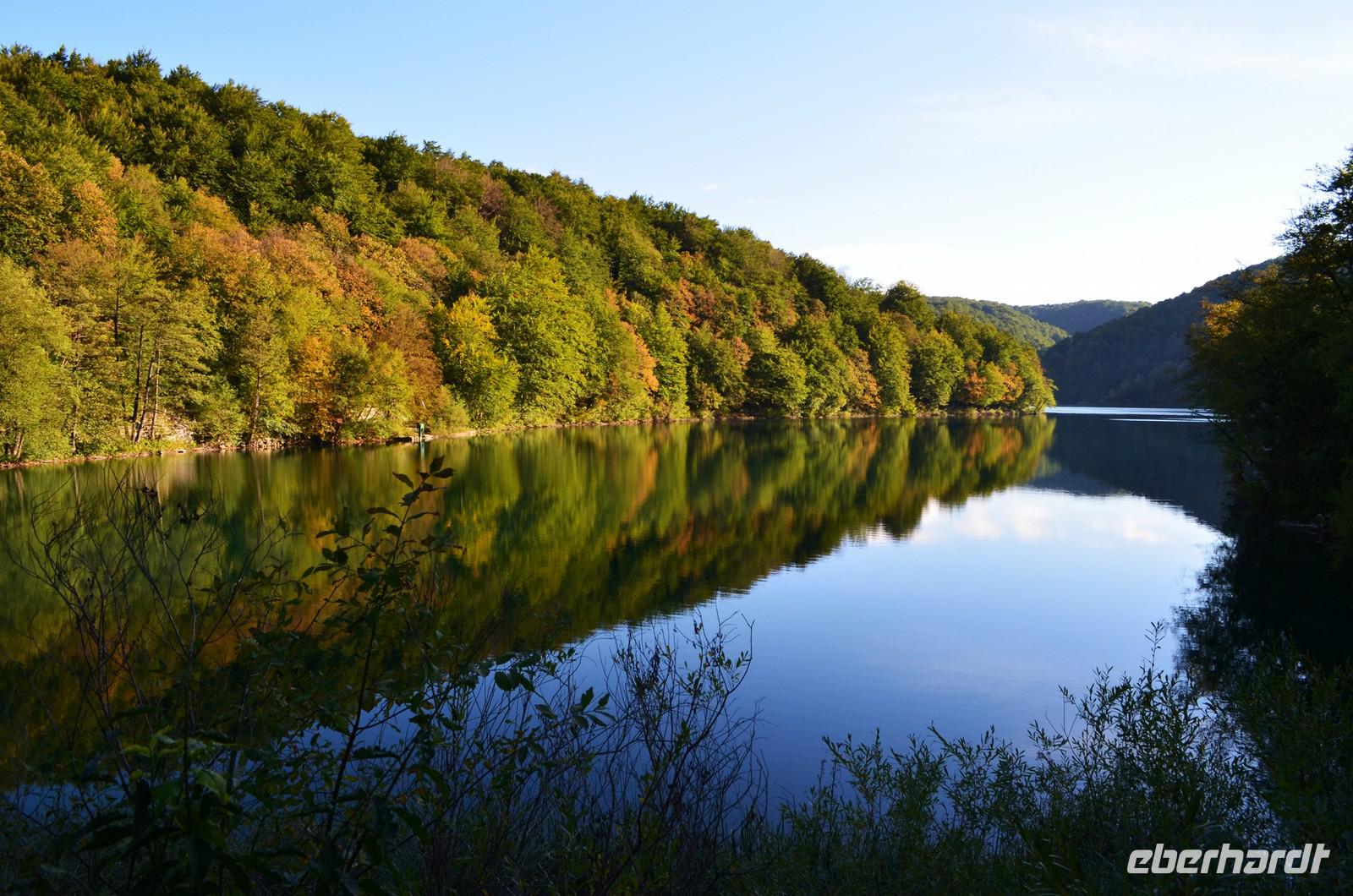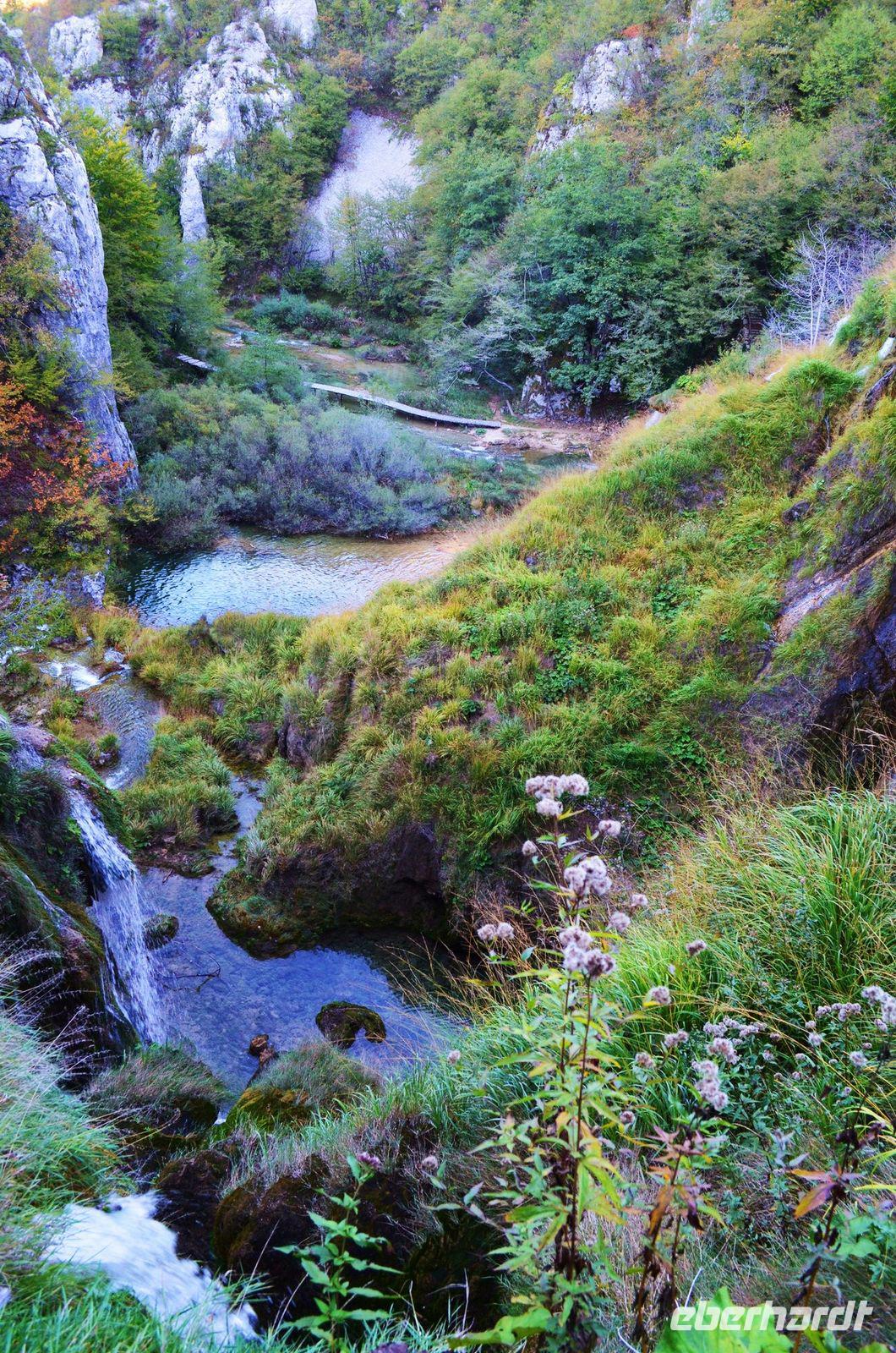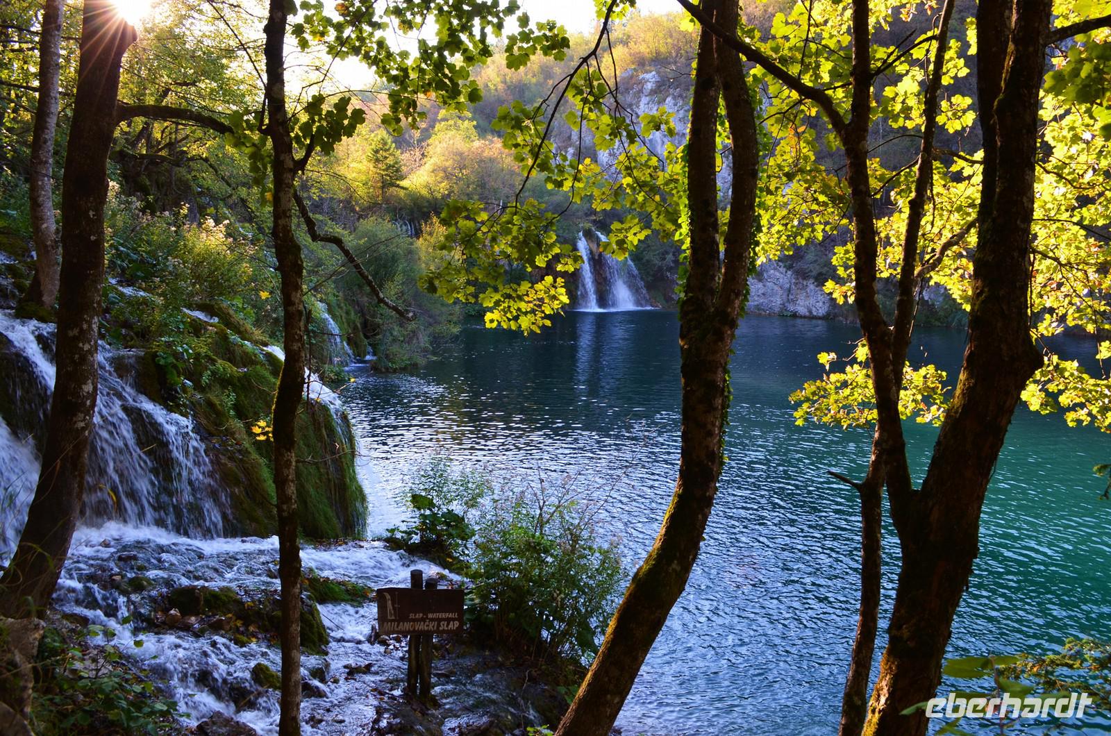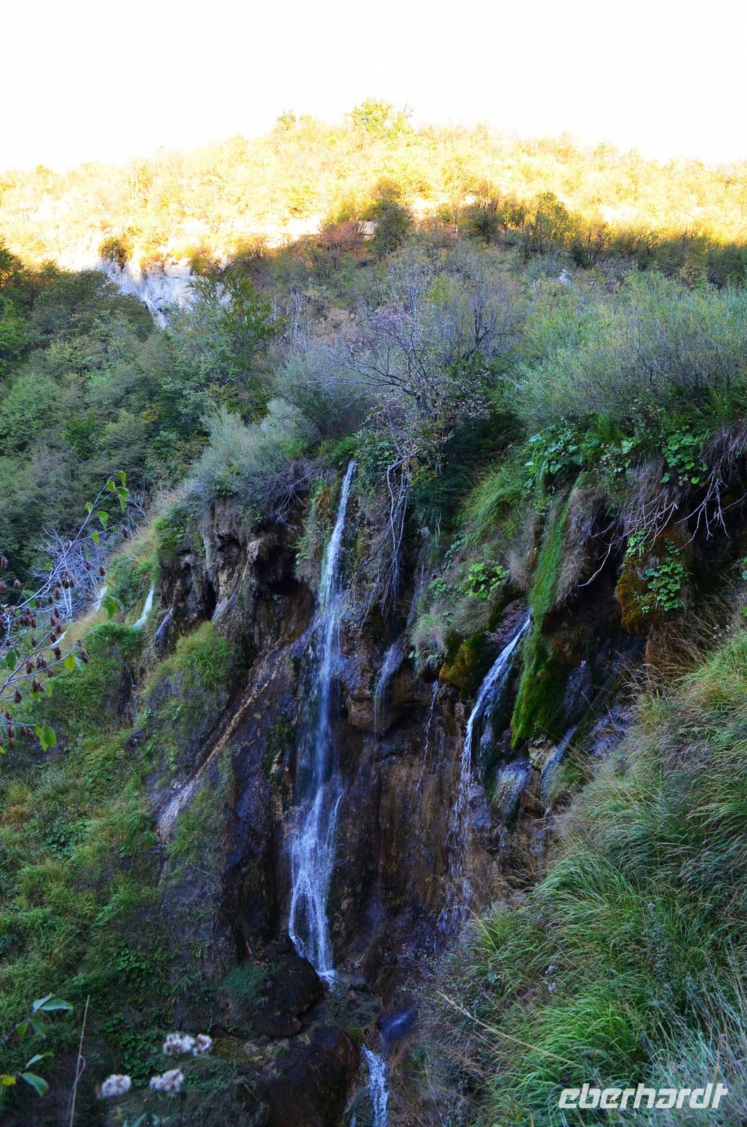 Wir fahren zum Eingang Lozovac und von dort gemeinsam mit dem Bus hinab zum unteren Parkplatz. Bei dieser Abfahrt hat man den schönsten Blick auf die von den Travertinterrassen oberhalb angestauten Seen. Die Sonne scheint und alles erstrahlt in den herbstlichen Farben.