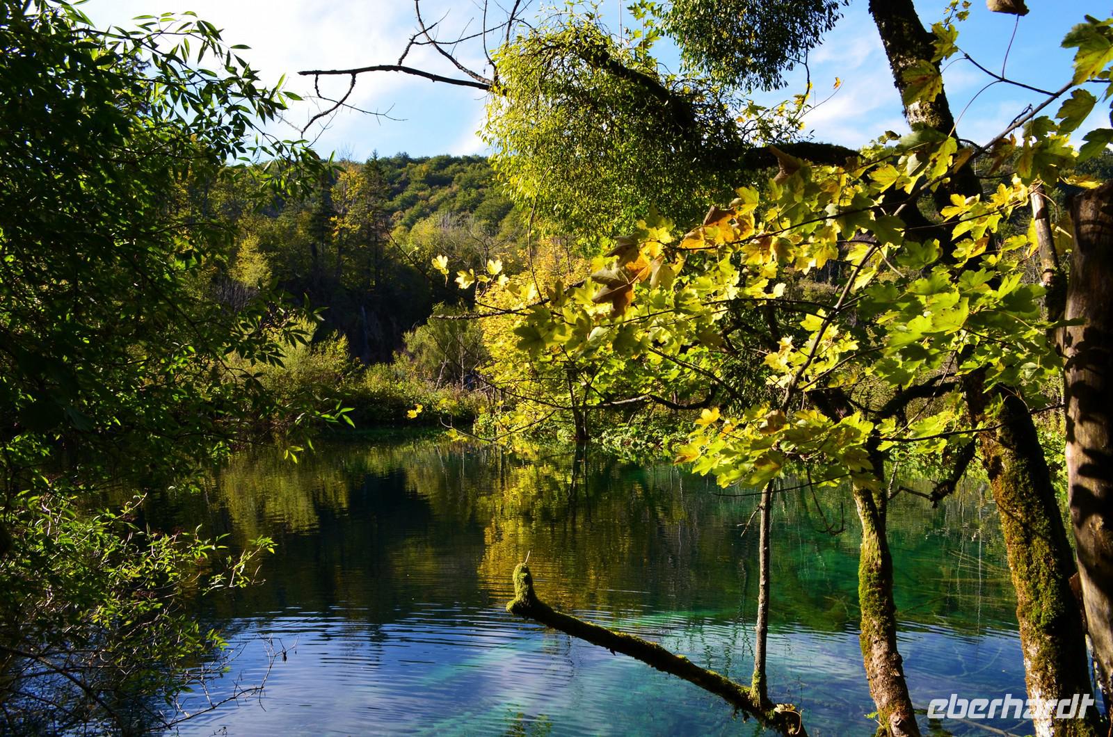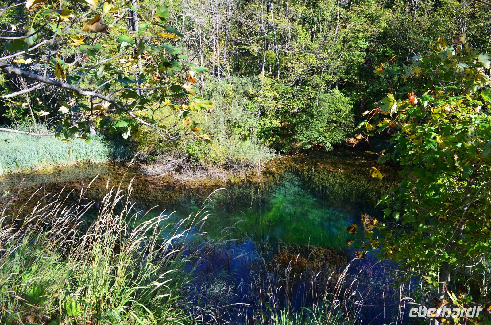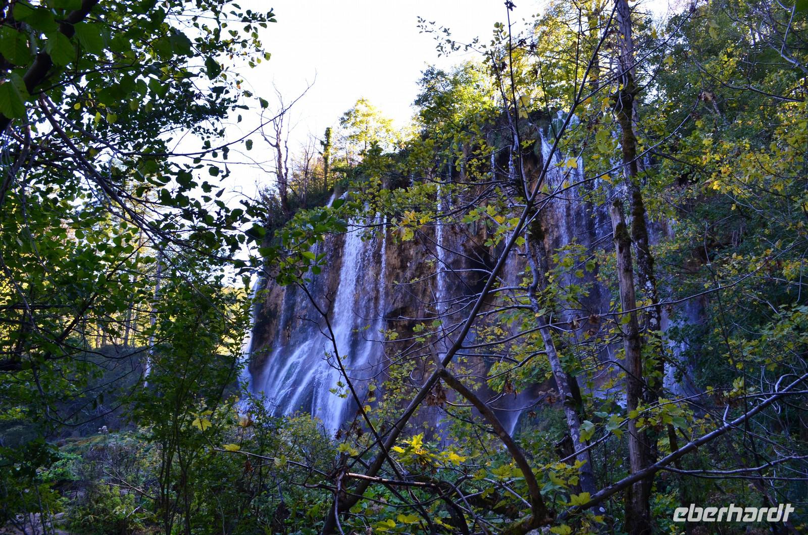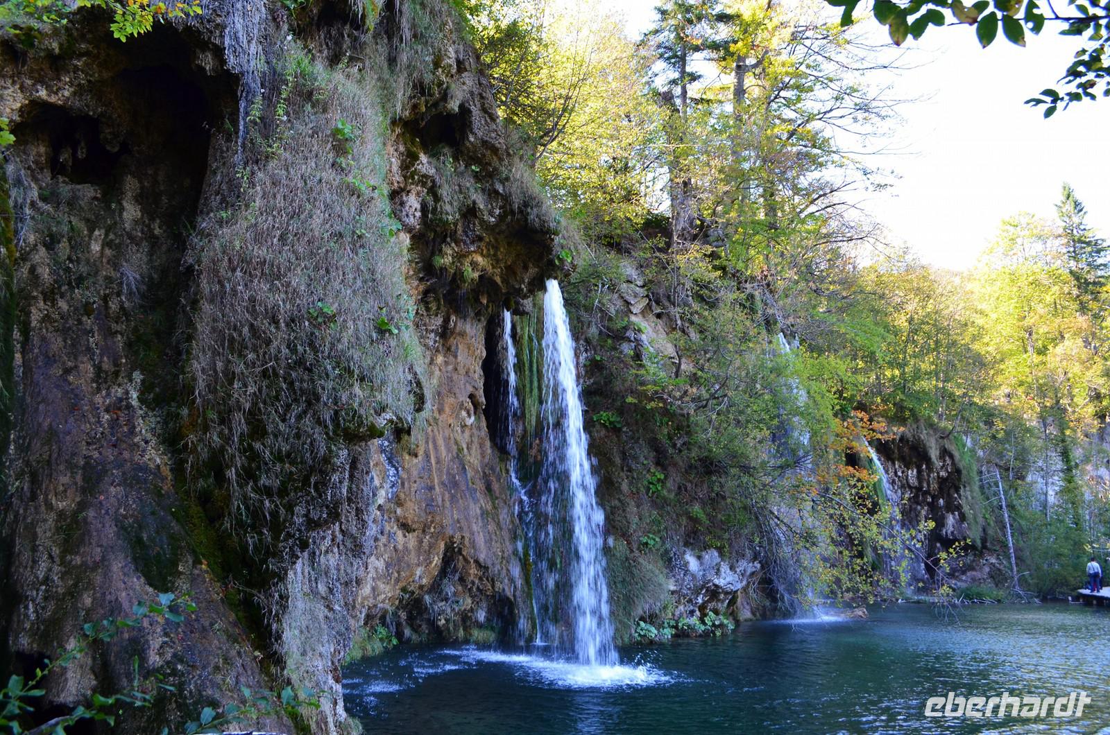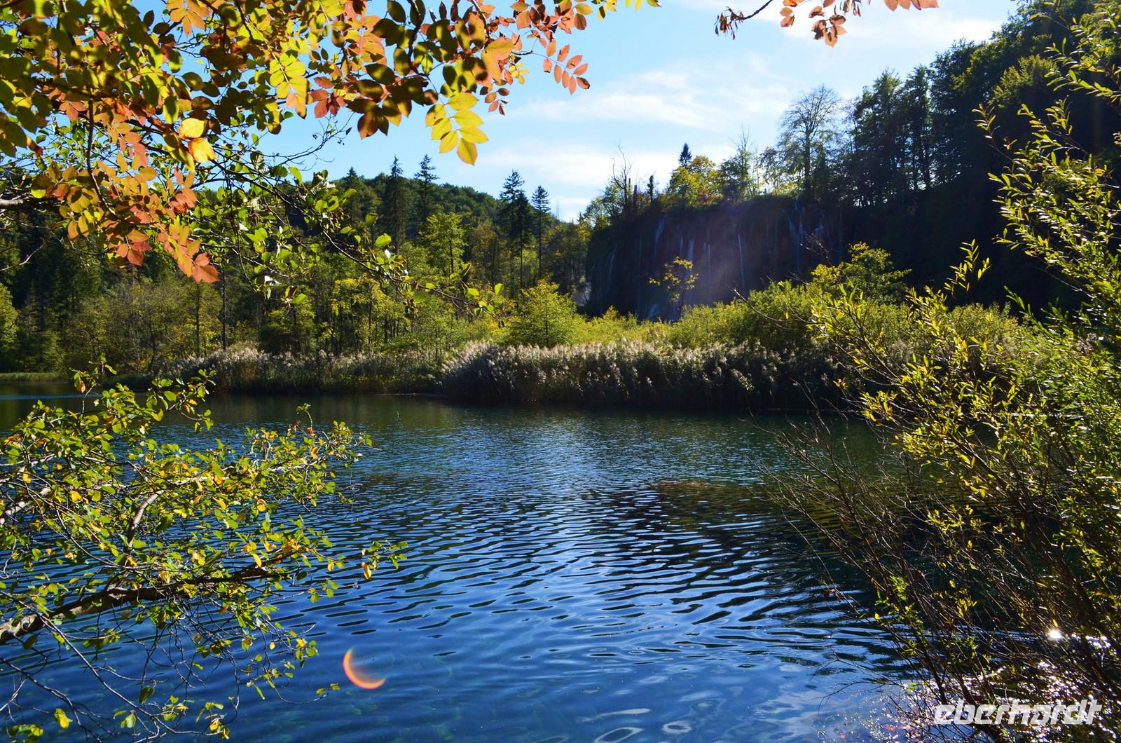 Wir fahren zum Eingang Lozovac und von dort gemeinsam mit dem Bus hinab zum unteren Parkplatz. Bei dieser Abfahrt hat man den schönsten Blick auf die von den Travertinterrassen oberhalb angestauten Seen. Die Sonne scheint und alles erstrahlt in den herbstlichen Farben.