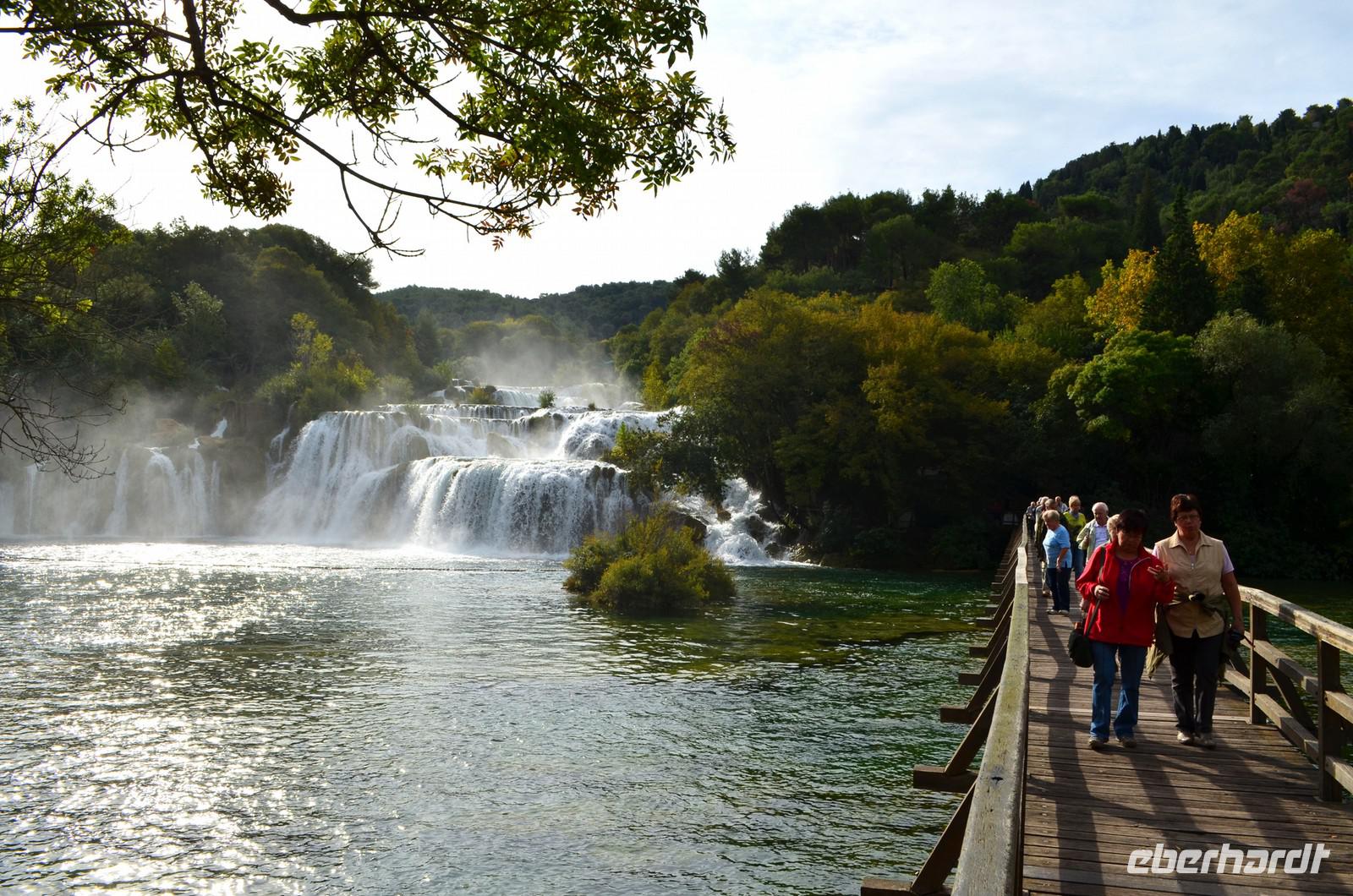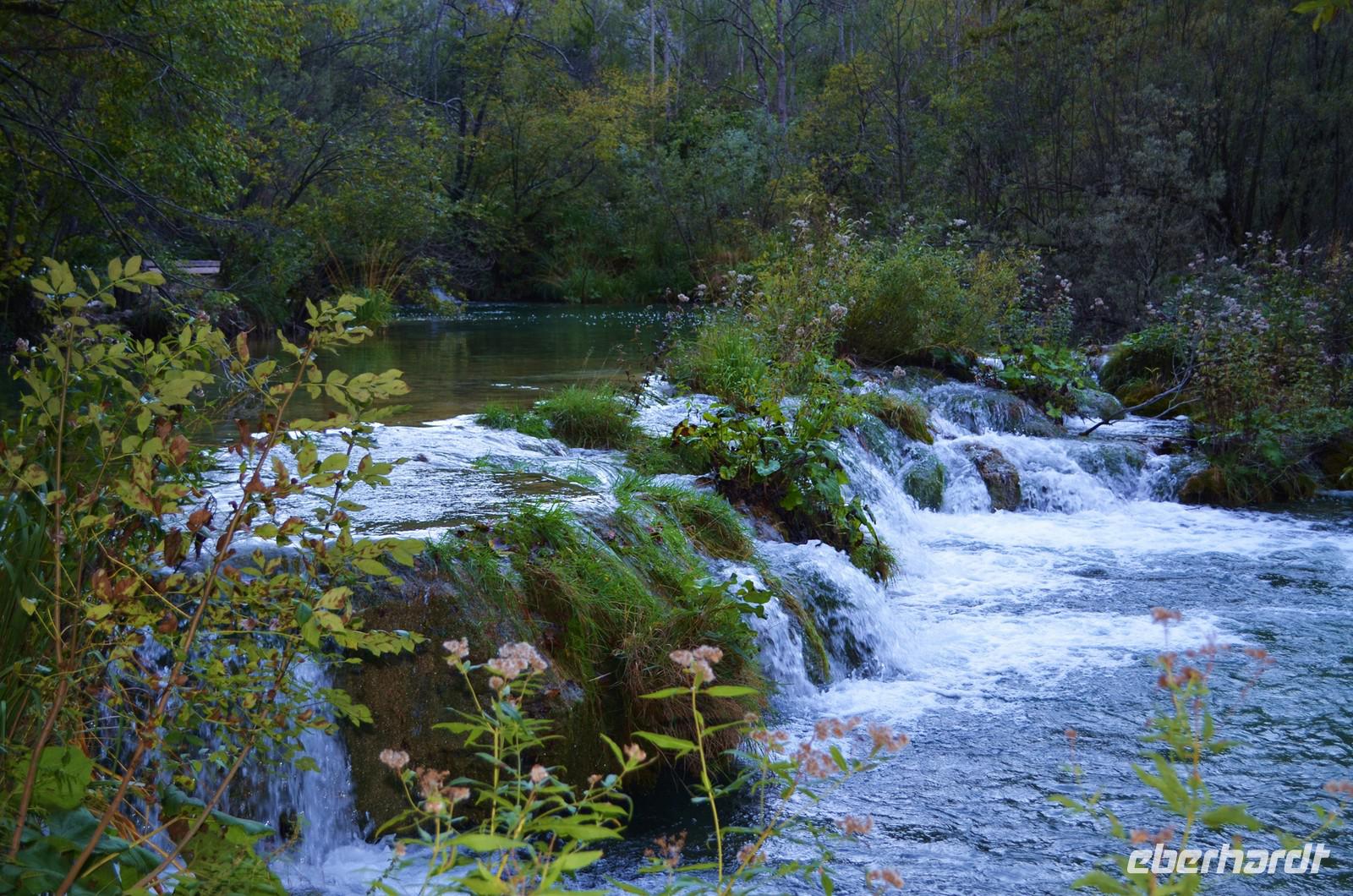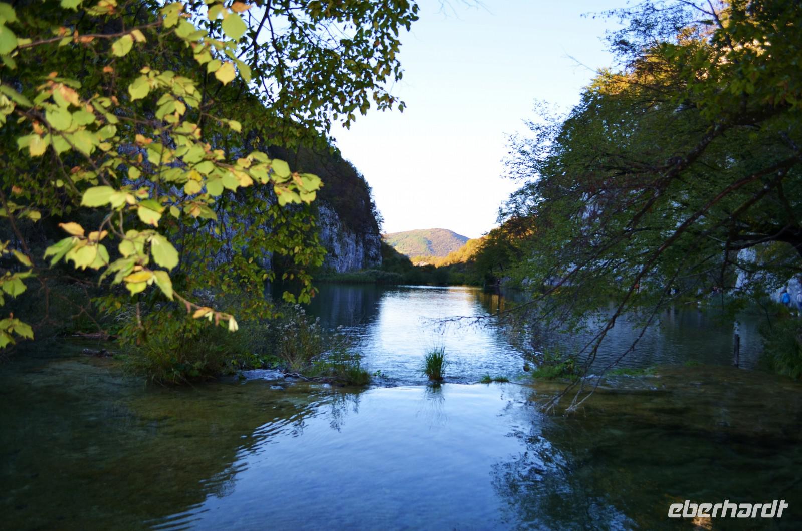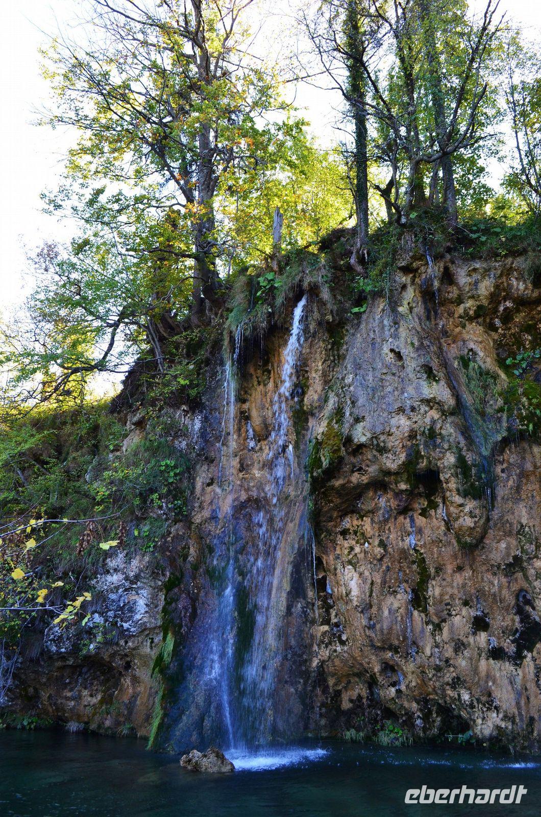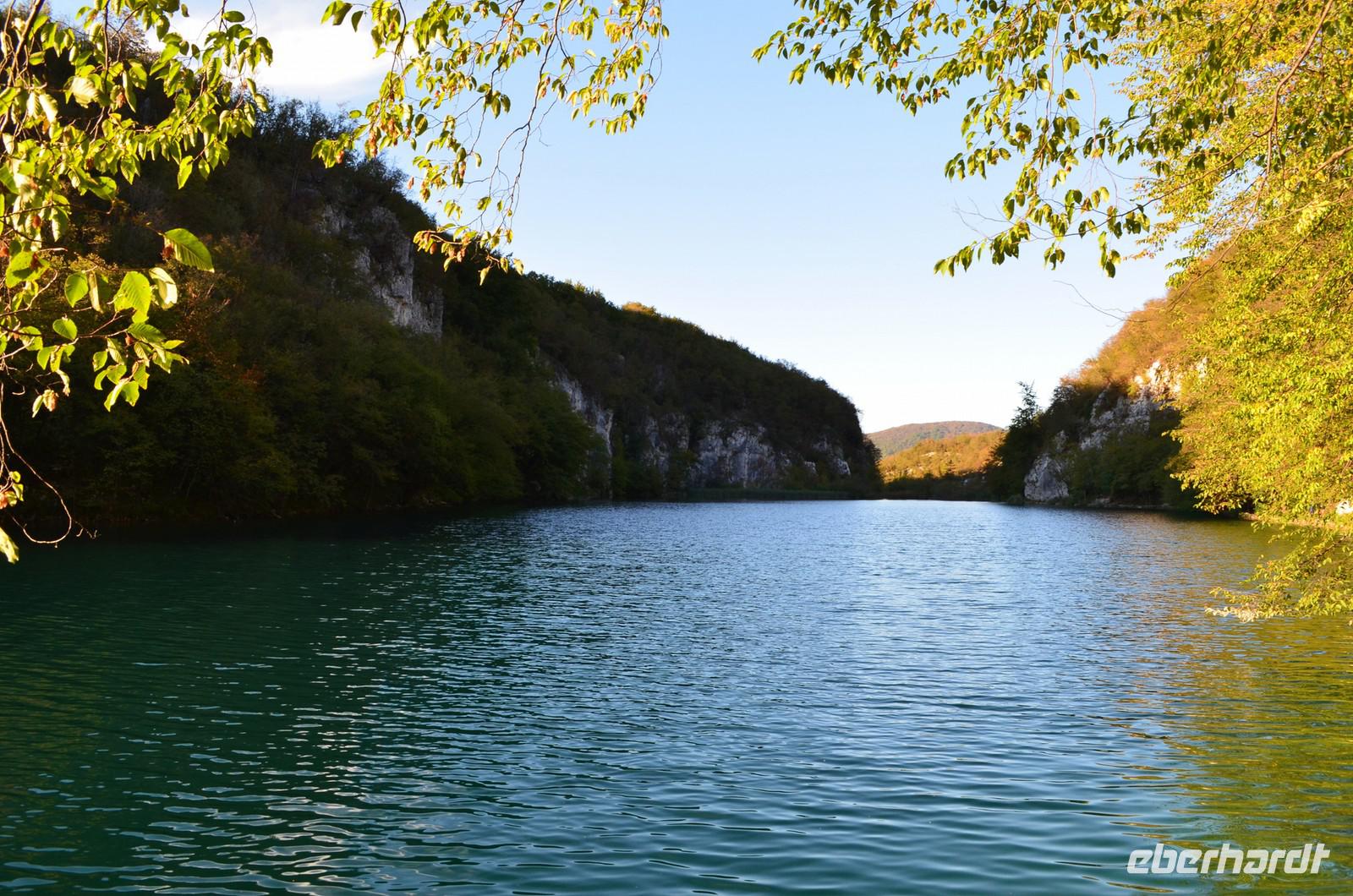 Wir fahren zum Eingang Lozovac und von dort gemeinsam mit dem Bus hinab zum unteren Parkplatz. Bei dieser Abfahrt hat man den schönsten Blick auf die von den Travertinterrassen oberhalb angestauten Seen. Die Sonne scheint und alles erstrahlt in den herbstlichen Farben.
