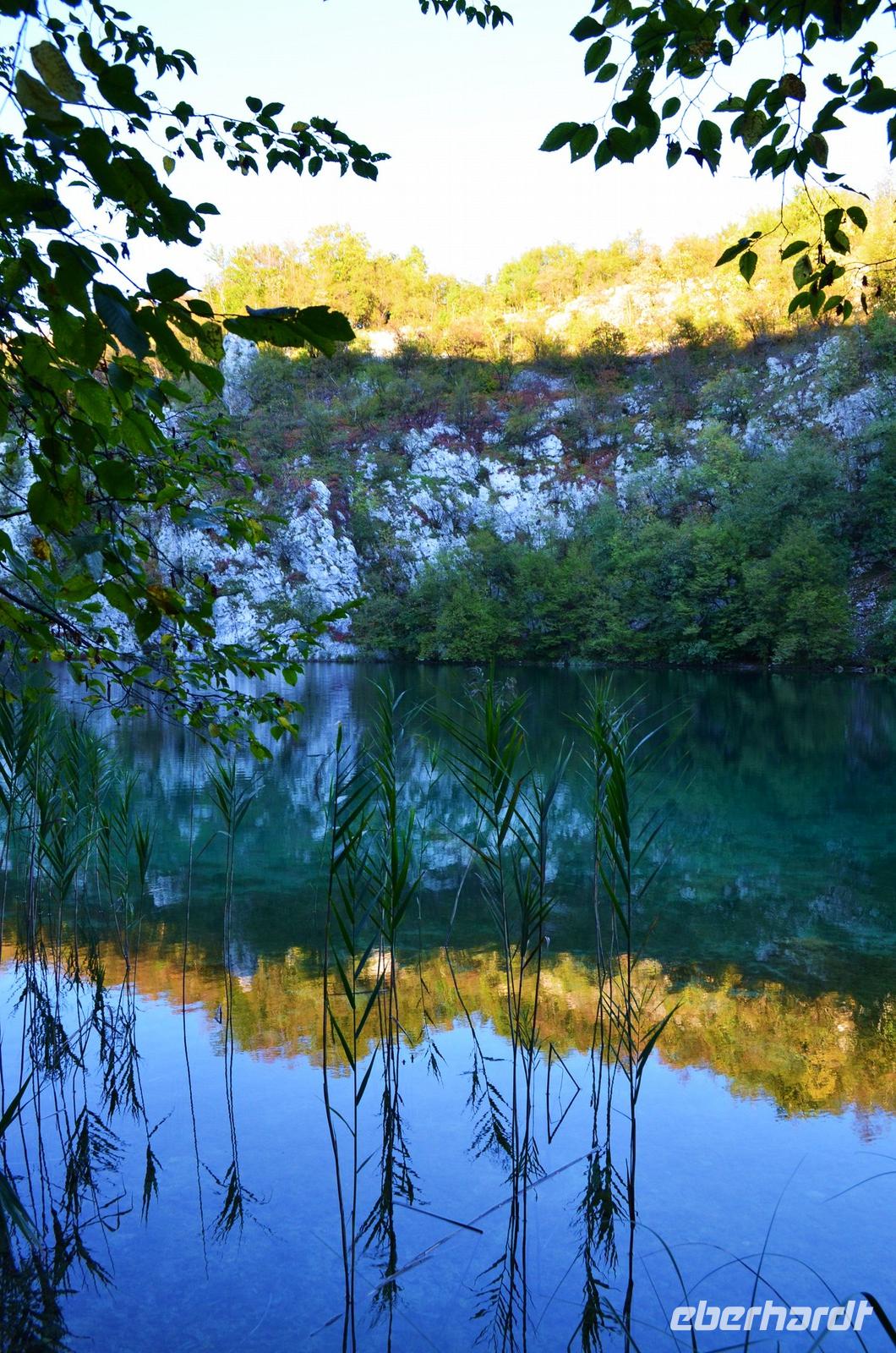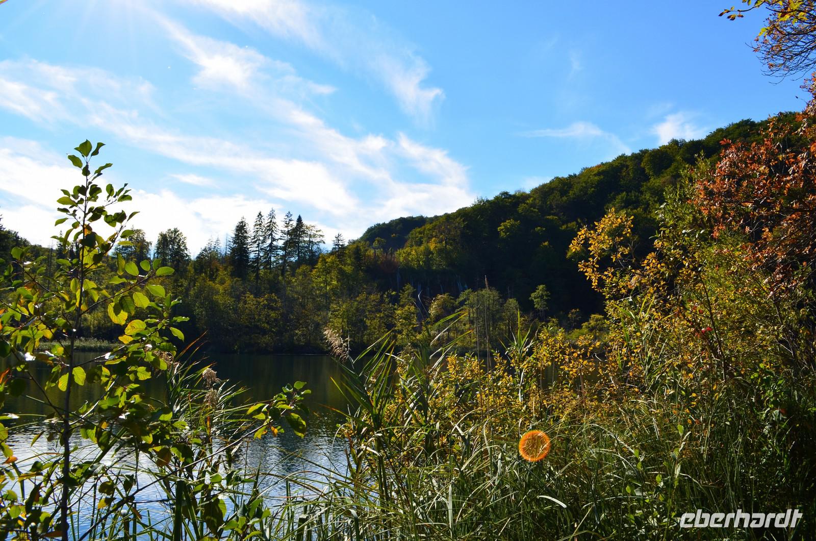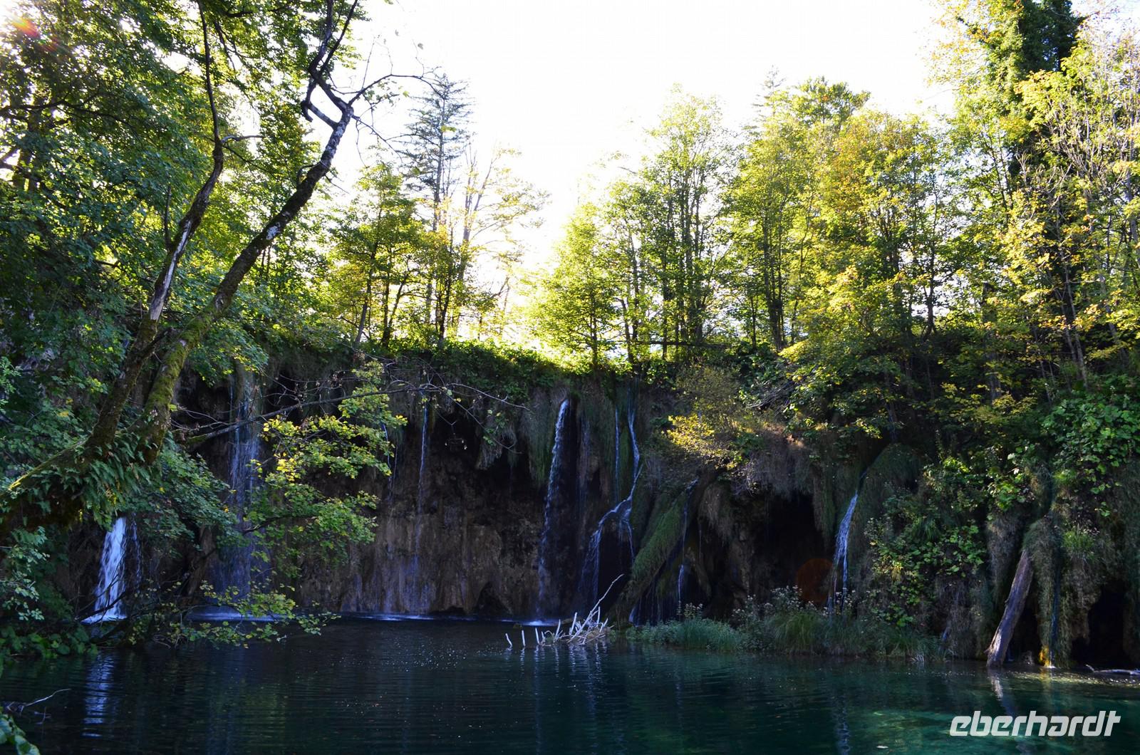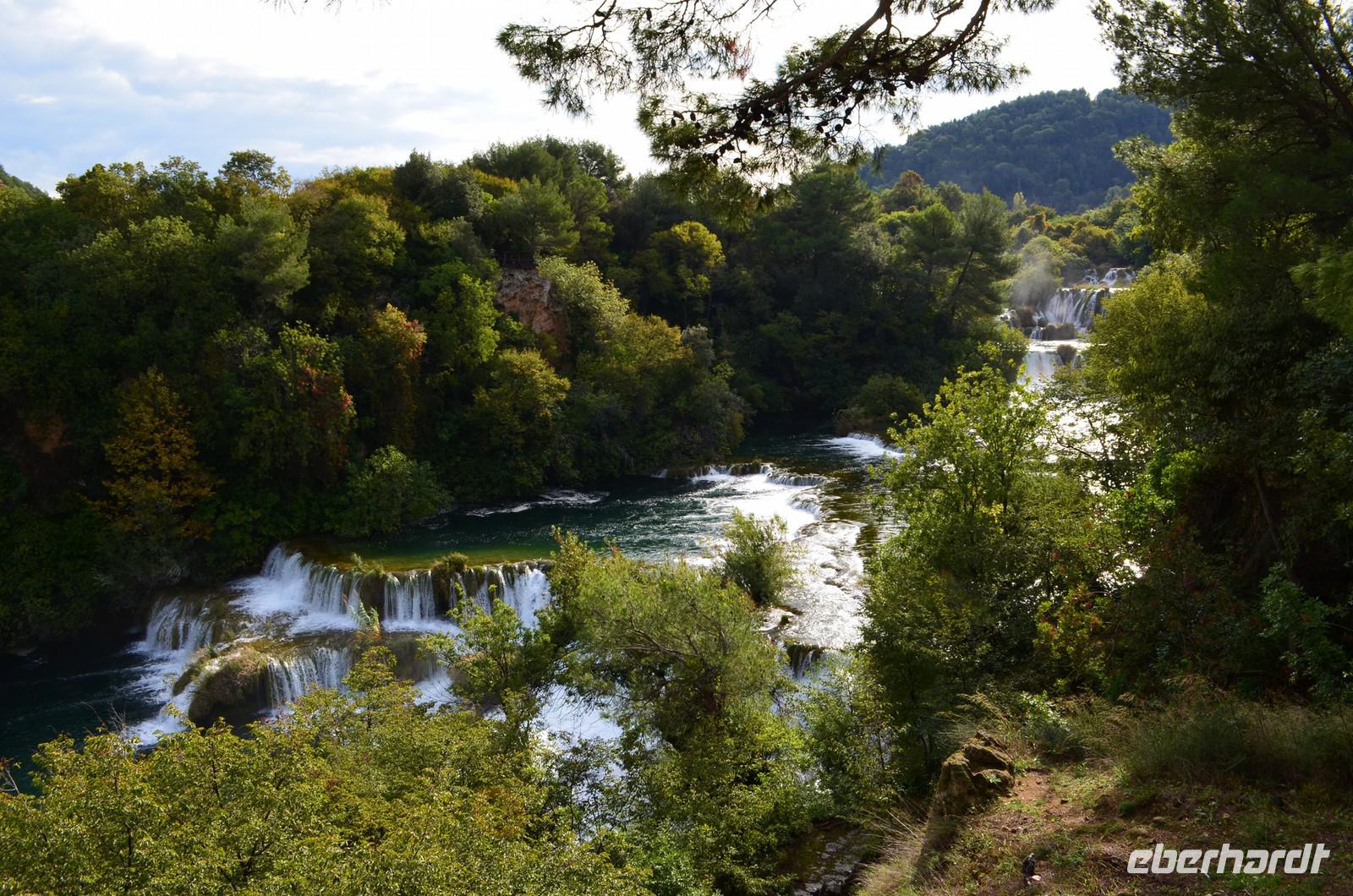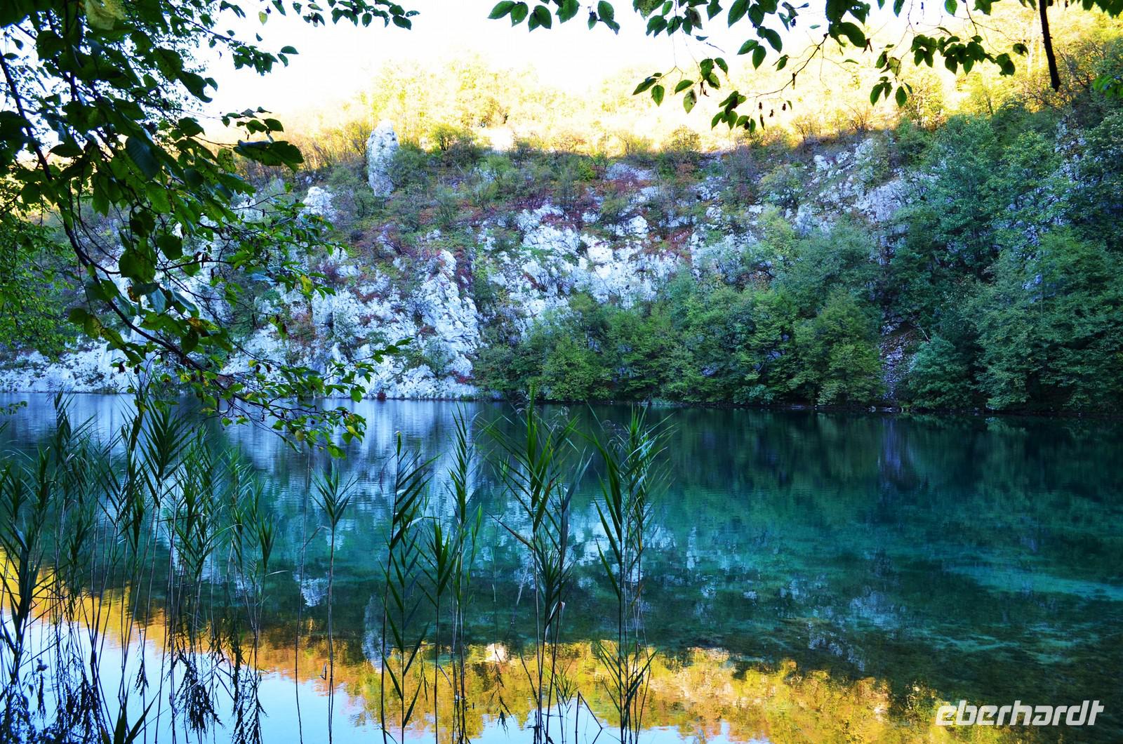Wir fahren zum Eingang Lozovac und von dort gemeinsam mit dem Bus hinab zum unteren Parkplatz. Bei dieser Abfahrt hat man den schönsten Blick auf die von den Travertinterrassen oberhalb angestauten Seen. Die Sonne scheint und alles erstrahlt in den herbstlichen Farben.