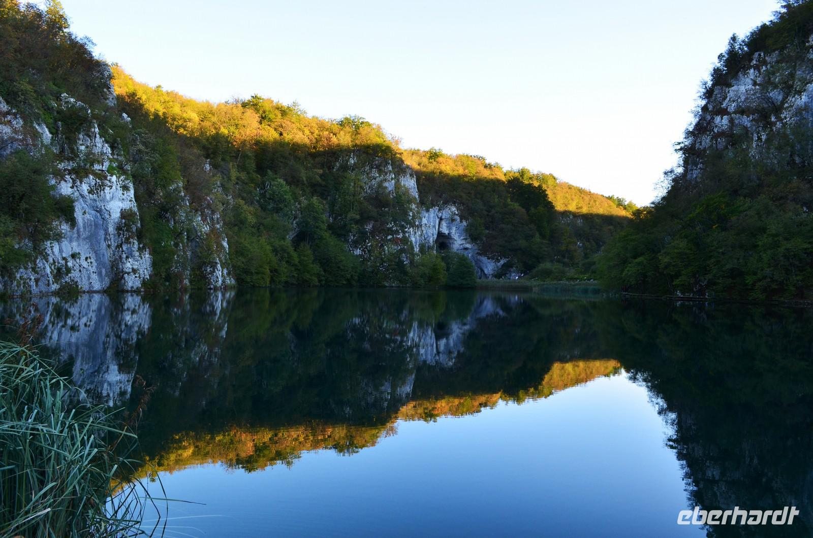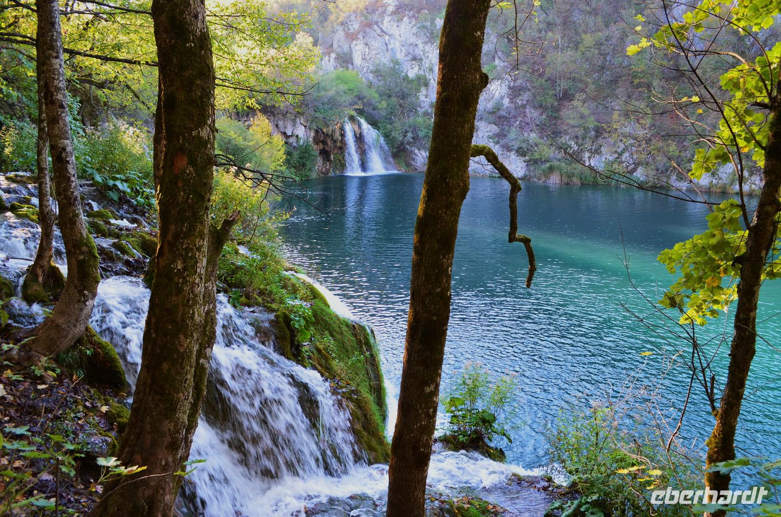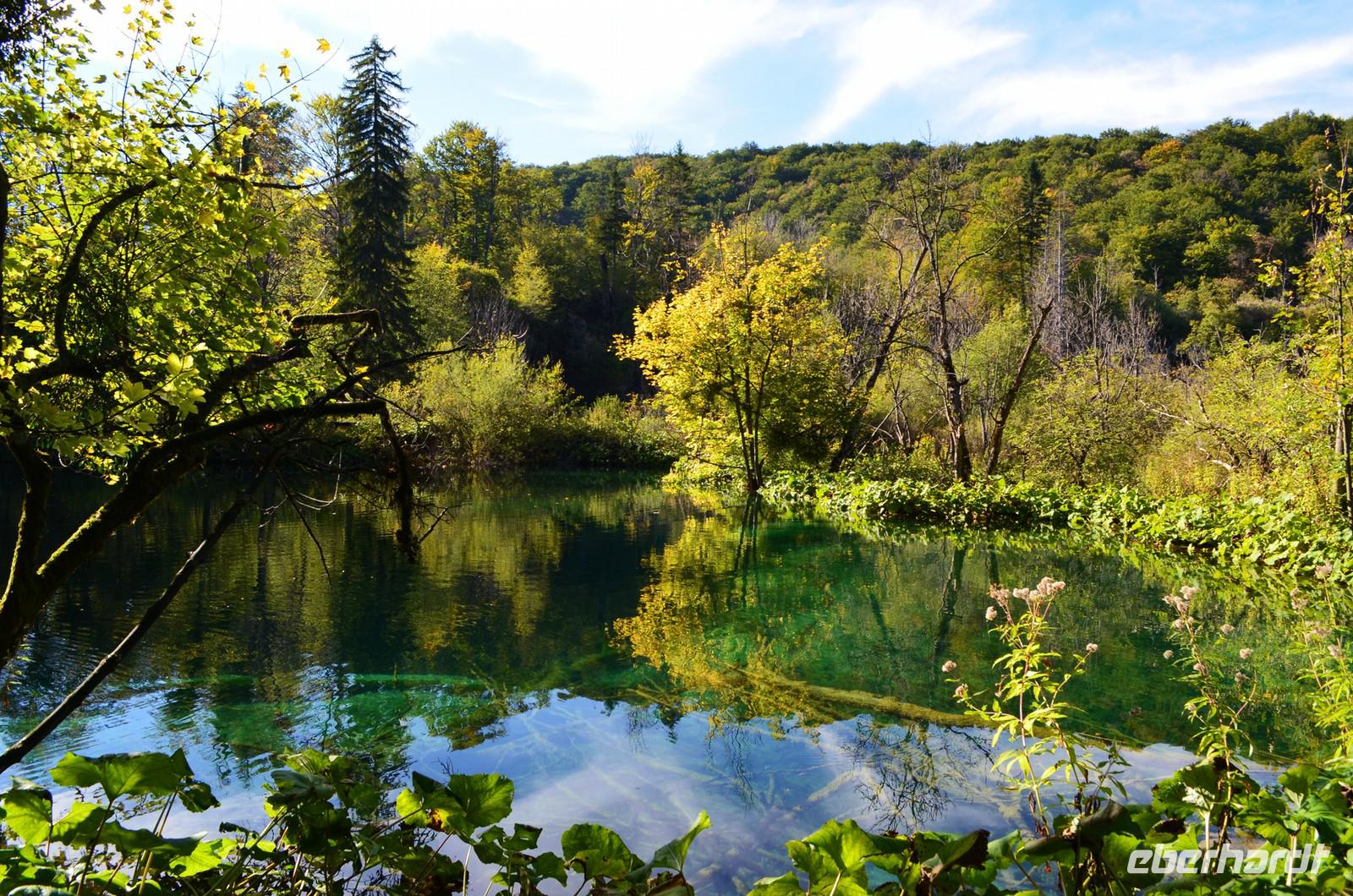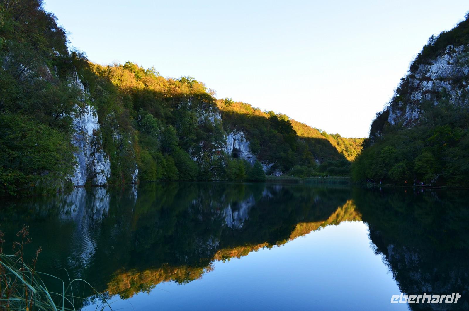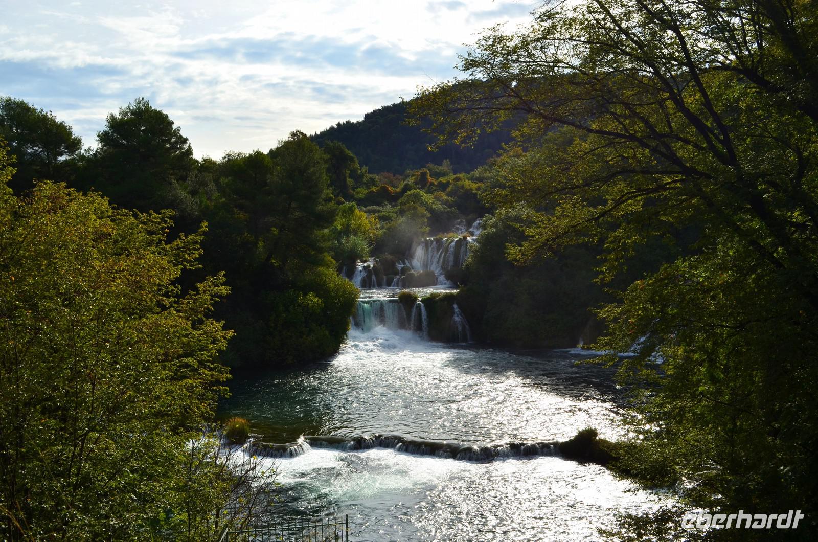 Wir fahren zum Eingang Lozovac und von dort gemeinsam mit dem Bus hinab zum unteren Parkplatz. Bei dieser Abfahrt hat man den schönsten Blick auf die von den Travertinterrassen oberhalb angestauten Seen. Die Sonne scheint und alles erstrahlt in den herbstlichen Farben.