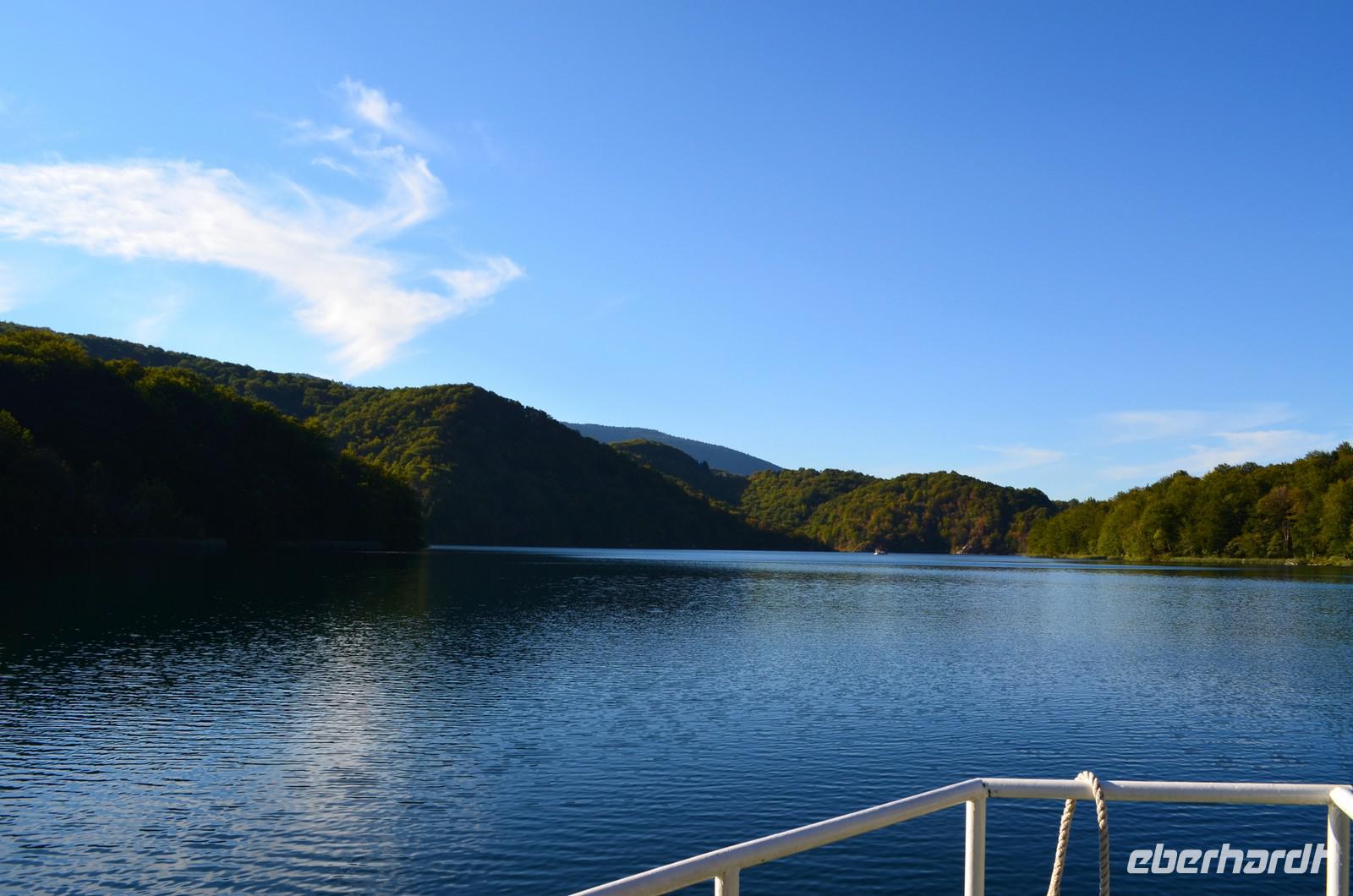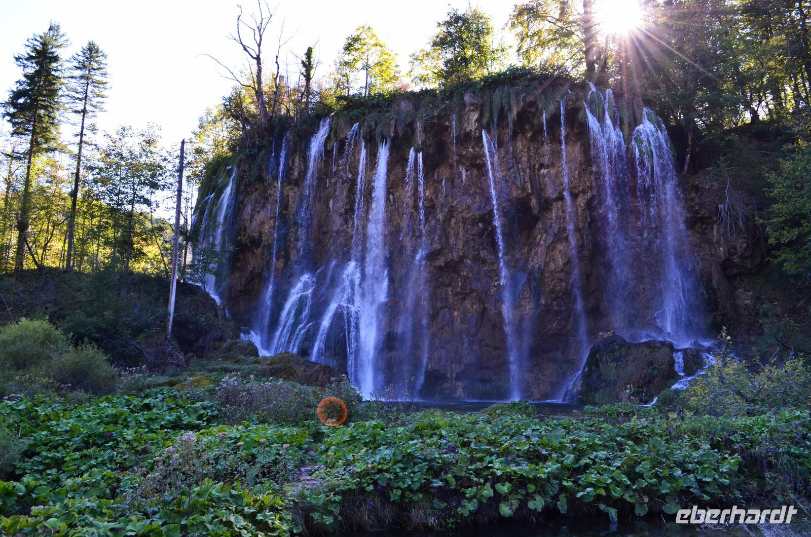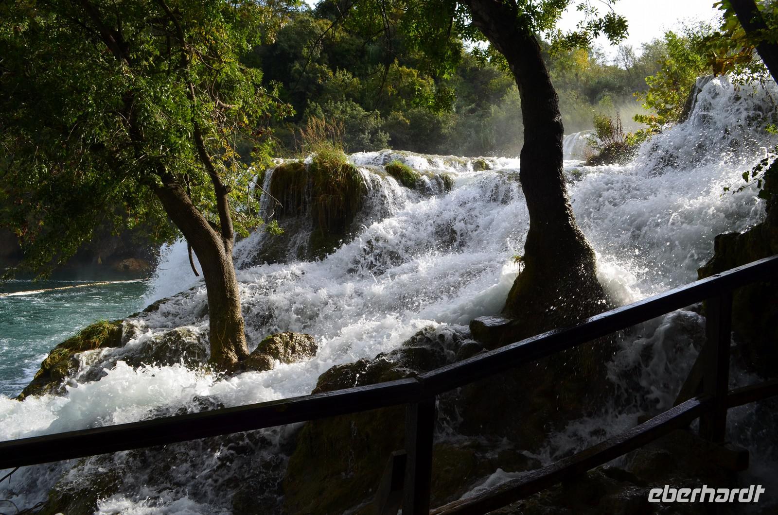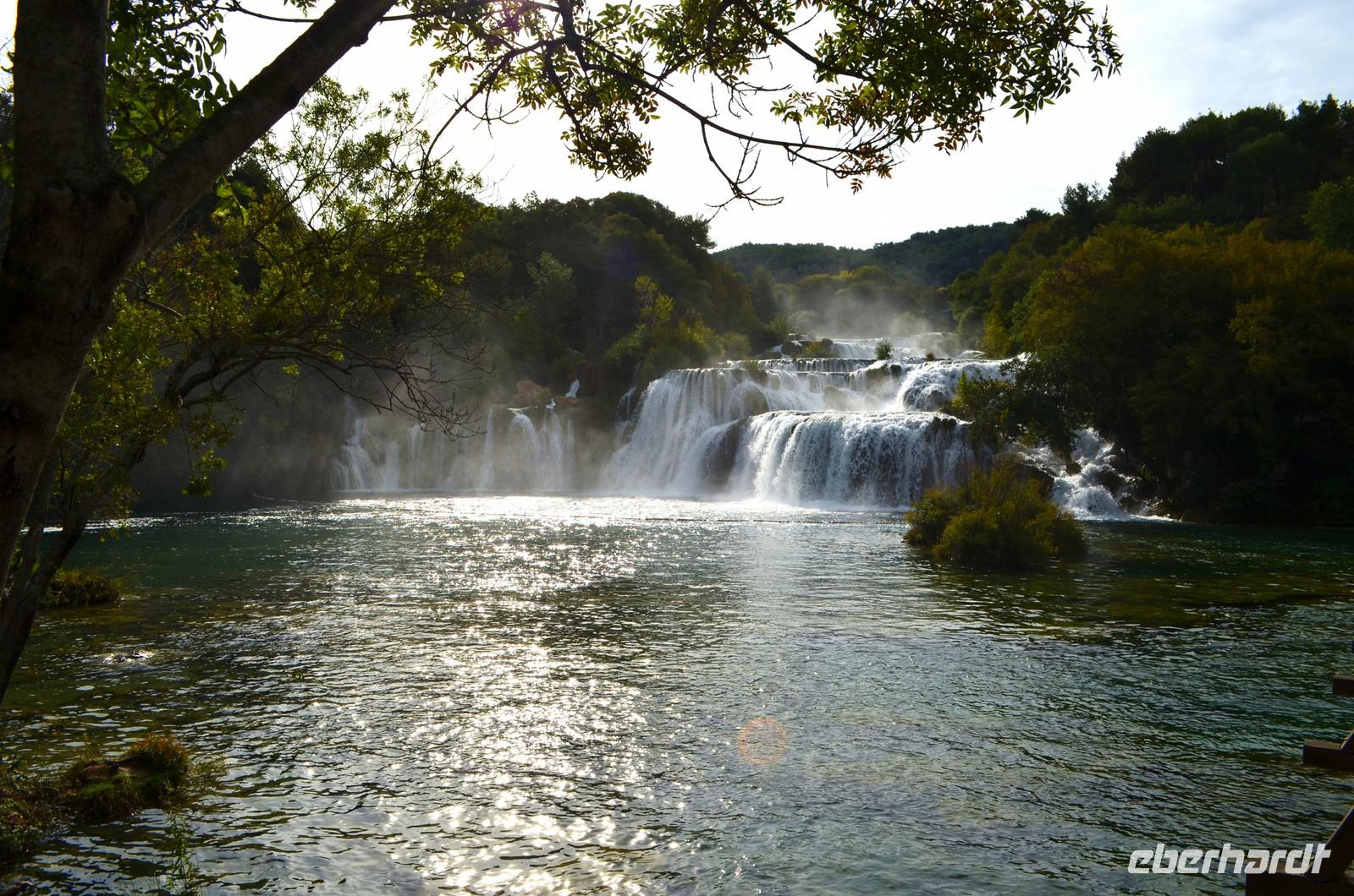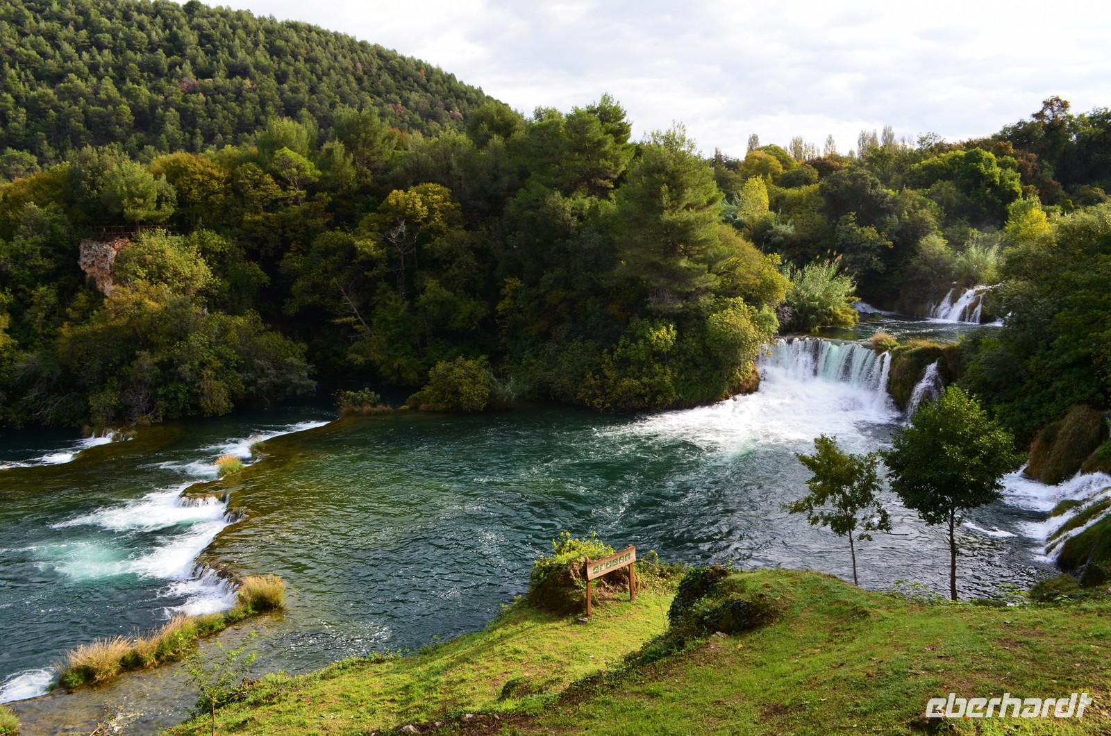 Wir fahren zum Eingang Lozovac und von dort gemeinsam mit dem Bus hinab zum unteren Parkplatz. Bei dieser Abfahrt hat man den schönsten Blick auf die von den Travertinterrassen oberhalb angestauten Seen. Die Sonne scheint und alles erstrahlt in den herbstlichen Farben.