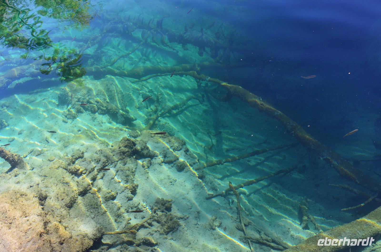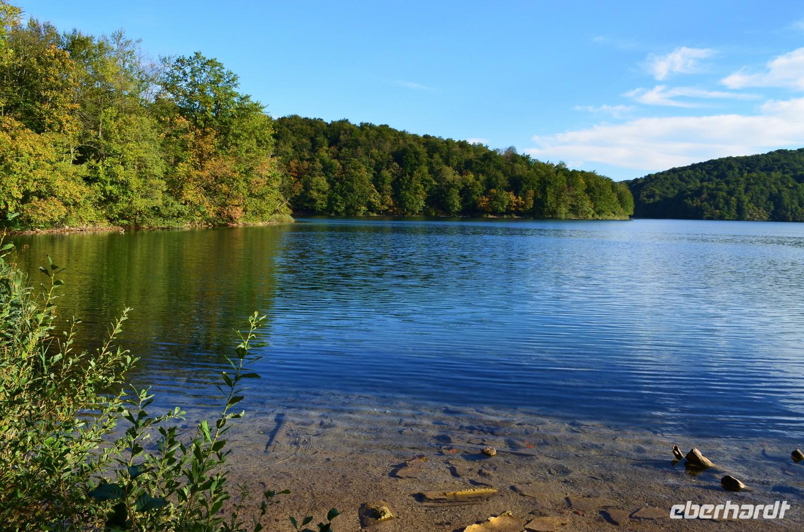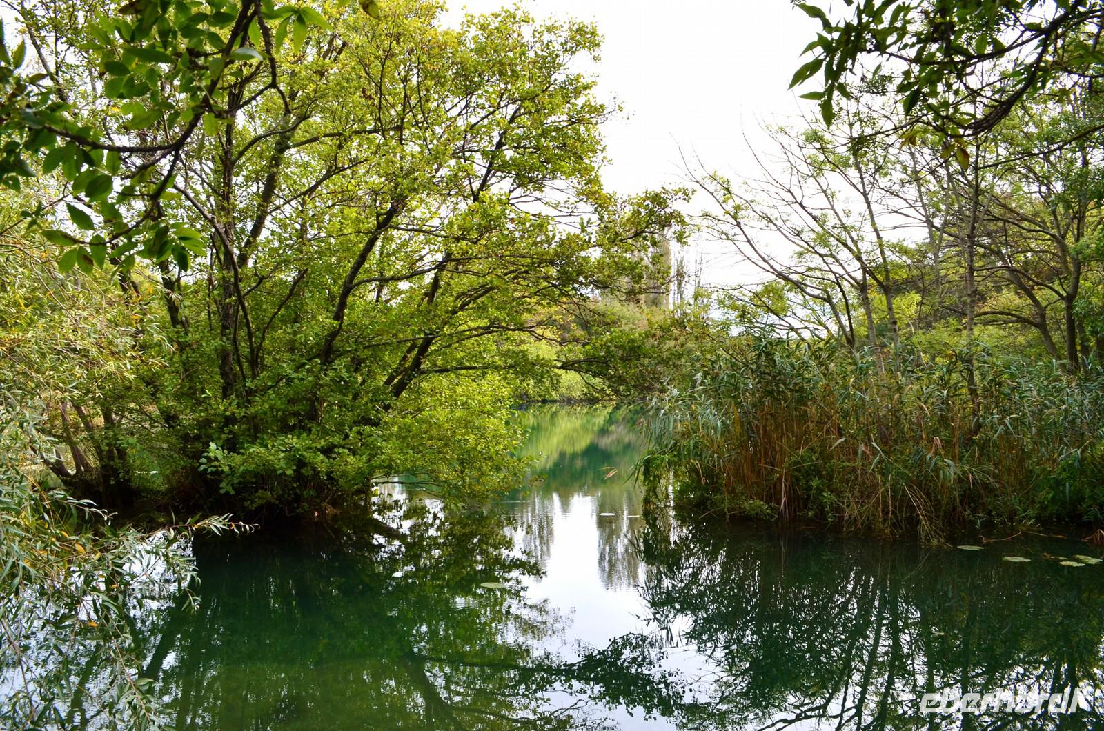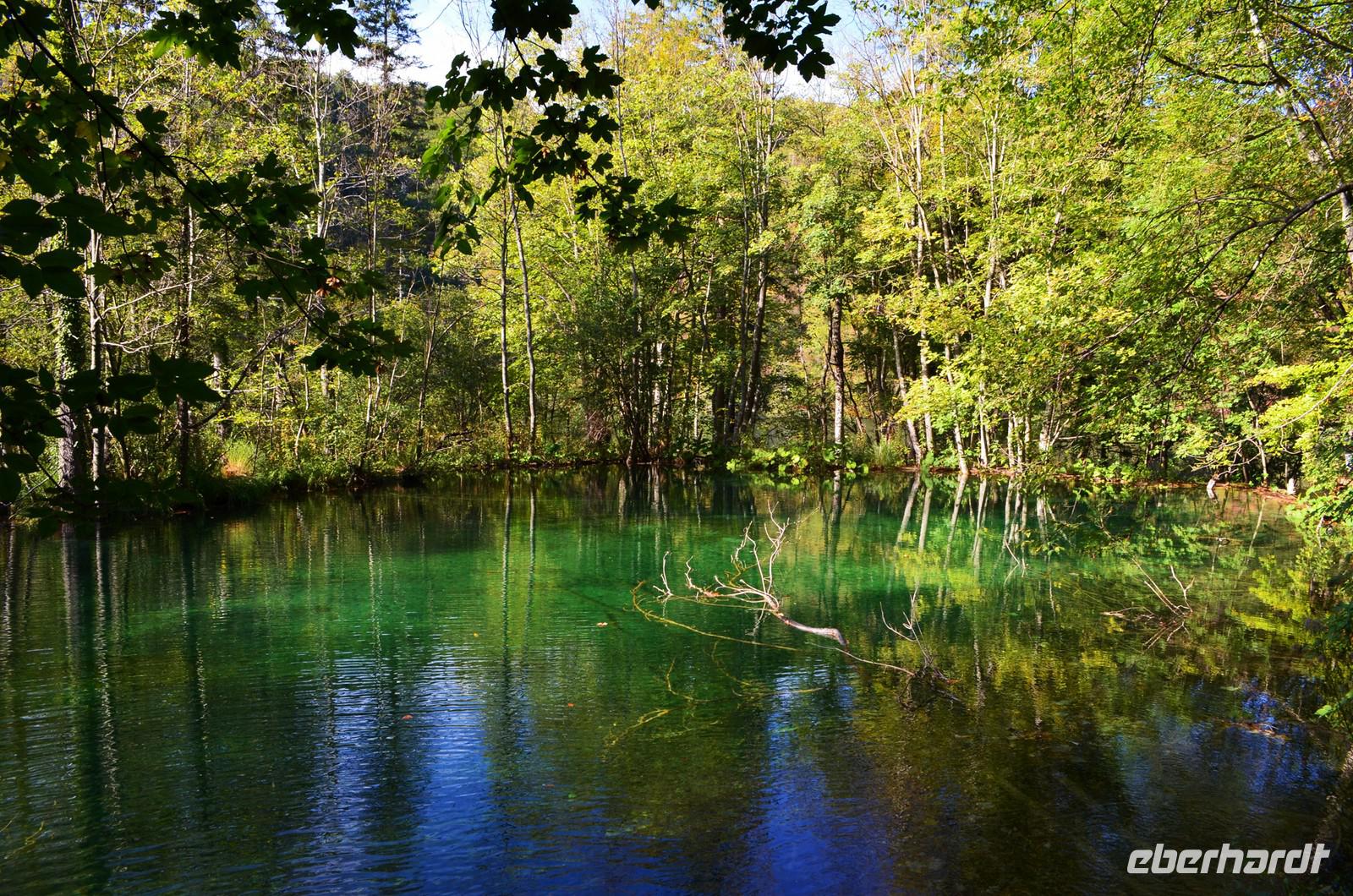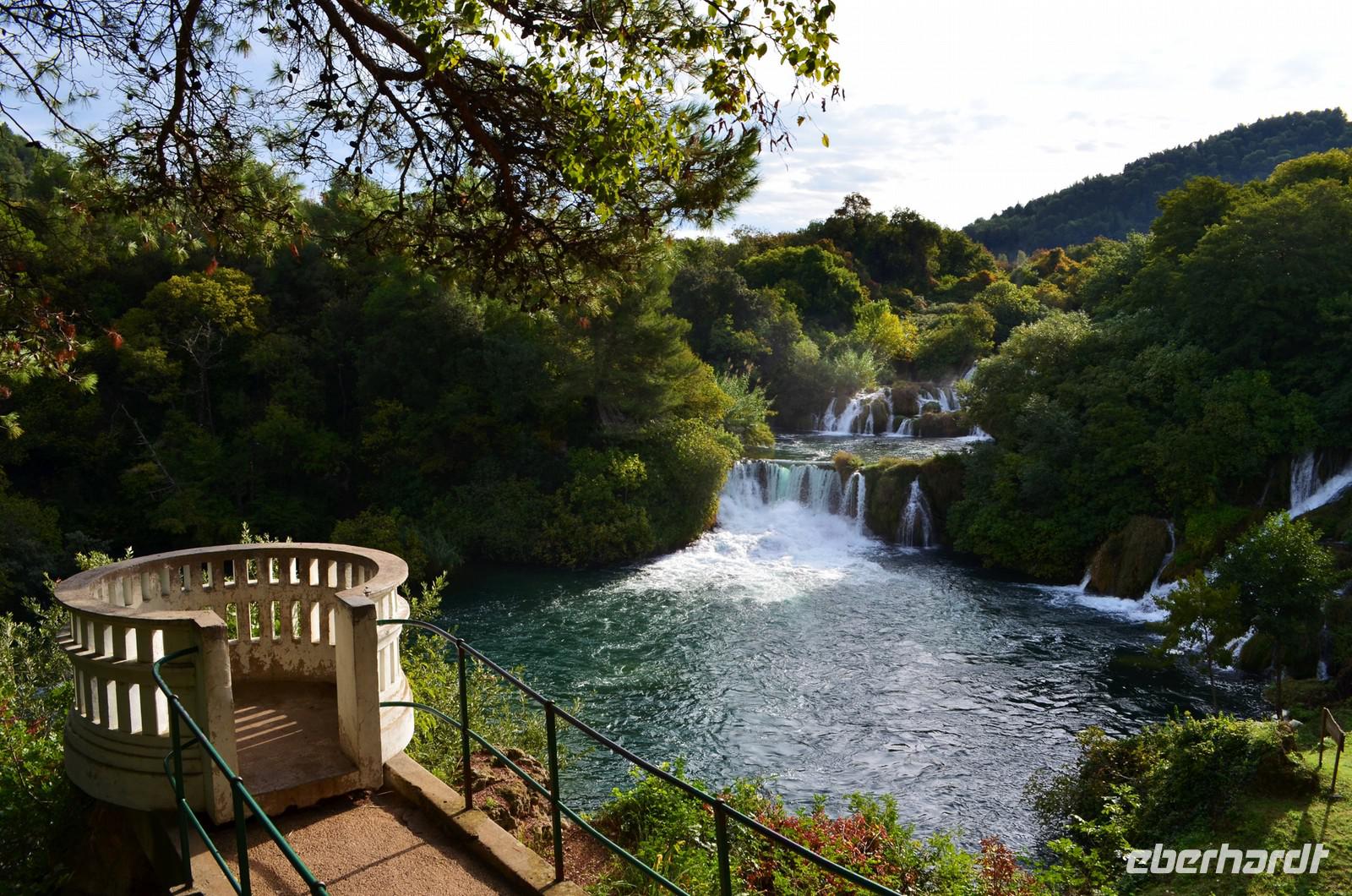Wir fahren zum Eingang Lozovac und von dort gemeinsam mit dem Bus hinab zum unteren Parkplatz. Bei dieser Abfahrt hat man den schönsten Blick auf die von den Travertinterrassen oberhalb angestauten Seen. Die Sonne scheint und alles erstrahlt in den herbstlichen Farben.