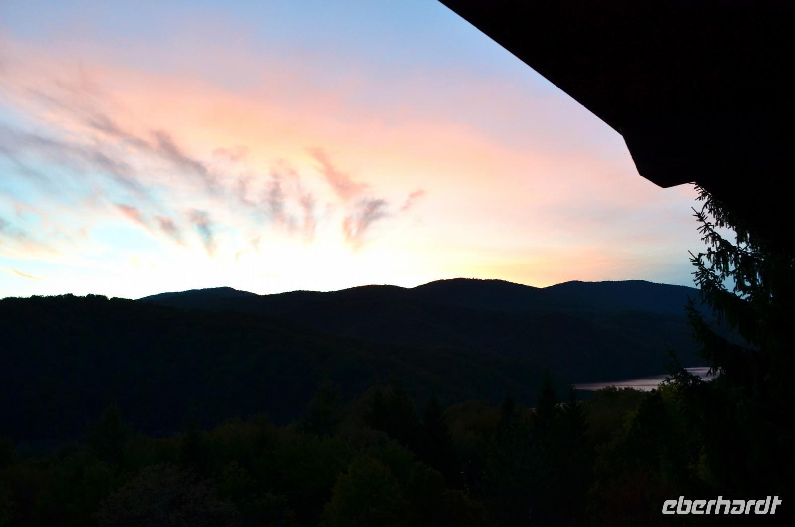 Beim herrlichen Ausblick vom Hotel-Restaurant während des Abendessens genießen wir einen wunderschönen Sonnenuntergang über den Hirschinseln und dem Hafen.