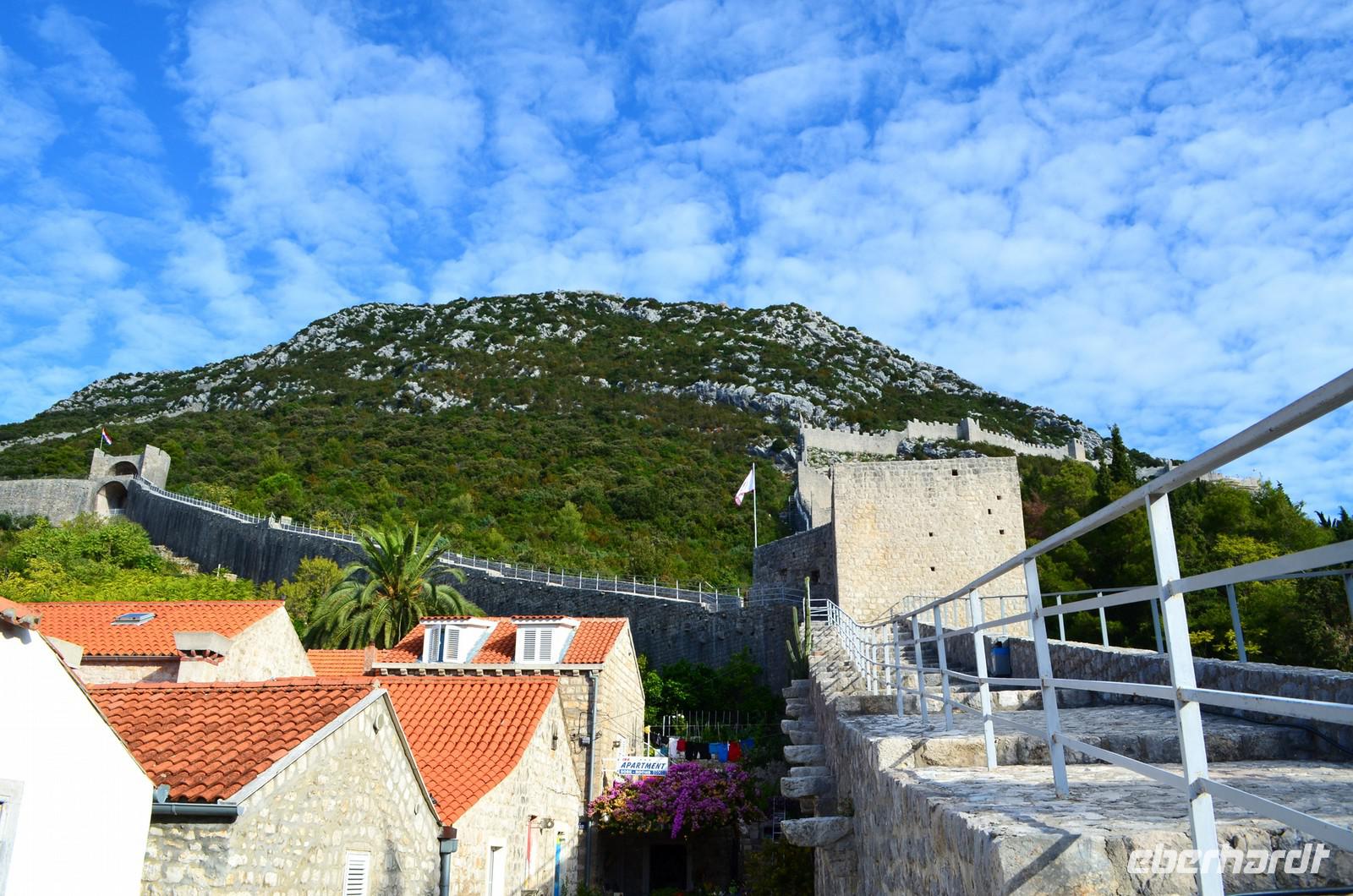 Unser erstes kleines Erlebnis an diesem Morgen ist der Fotostopp an der großen Brücke vor Dubrovnik, wo wir nochmals zurückblicken. Dann geht es die kurvenreiche Straße durch die Buchten entlang der Hirschinseln bis zur Halbinsel Peljesac. Schon von weitem sehen wir die gewaltigen Mauern von Ston, diesem Verteidigungsbollwerk der Republik Ragusa. Bei einem Spaziergang in Veliki Ston können wir sie näher betrachten. Dann führt uns die Weiterfahrt über die gebirgige Halbinsel, mit Tiefblicken hinab in die Buchten und zu den anfangs terrassenförmigen Hängen der Weinberge, die sich dann in den Hochtalmulden ausdehnen.