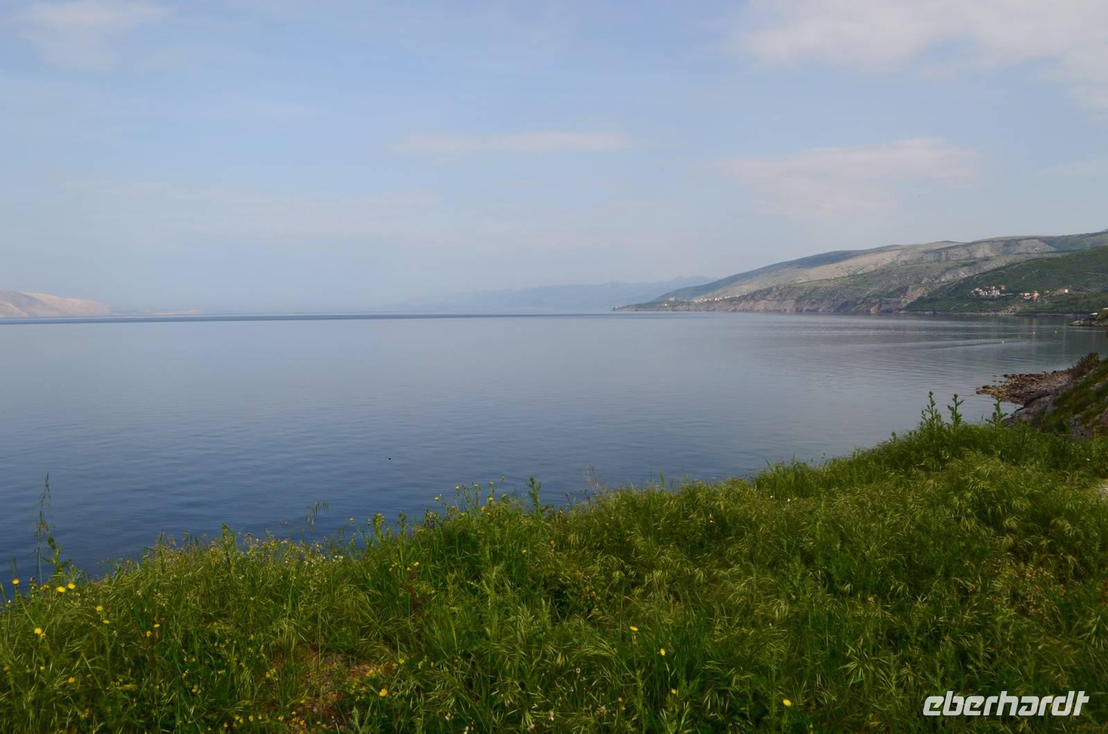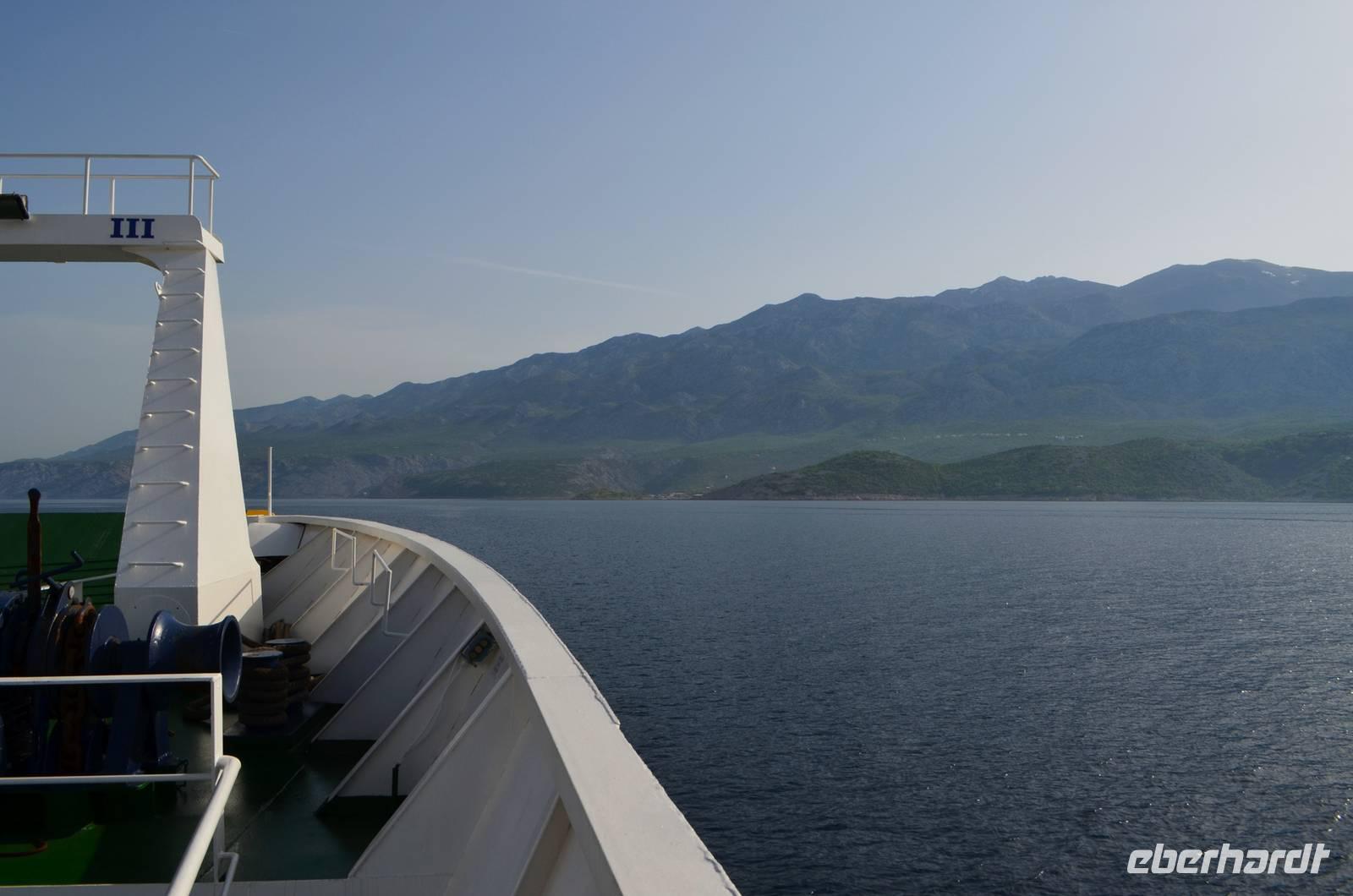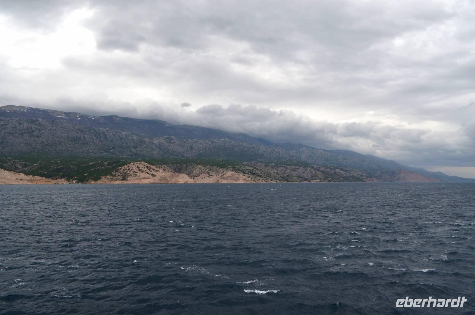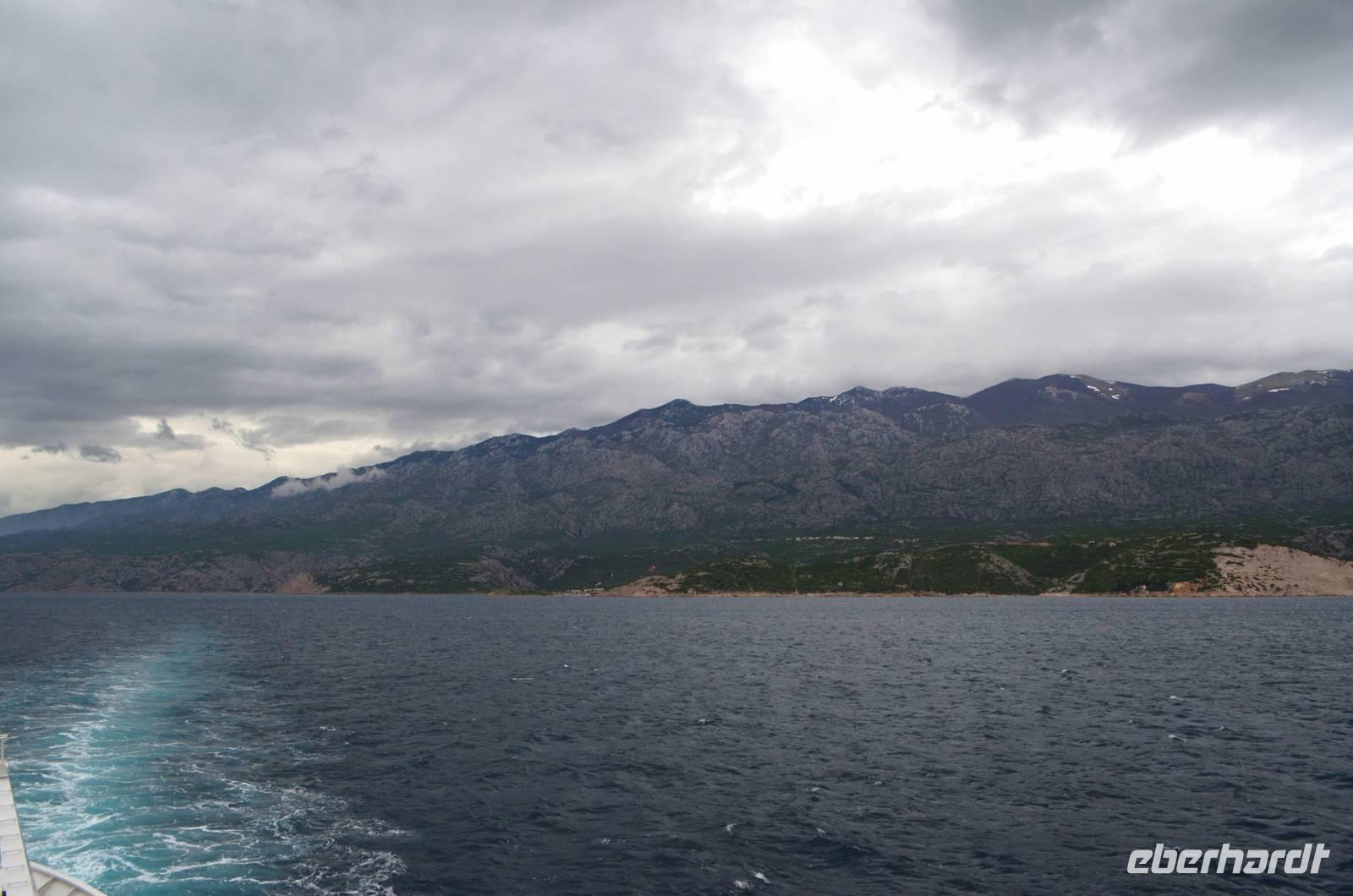 Die Fähre bringt uns ans Festland und unter den hohen Bergen des Velebitgebirges schlängelt sich die Küstenstraße über Senj nach Rijeka. Die Blicke auf die davor in der Adria liegenden Inseln sind überwältigend.