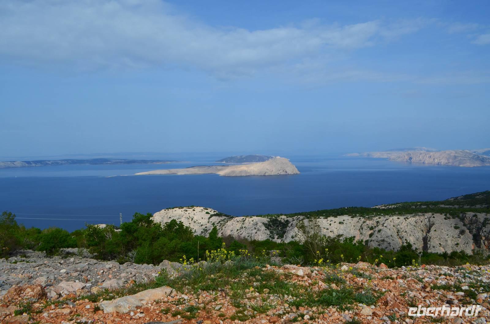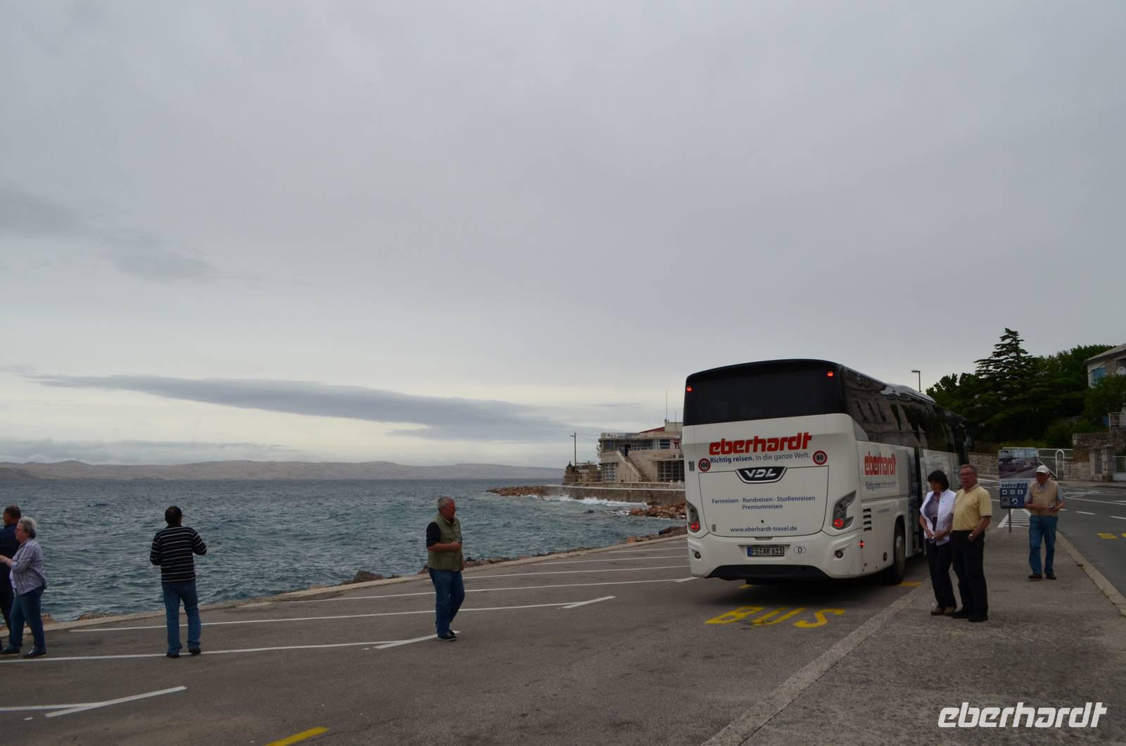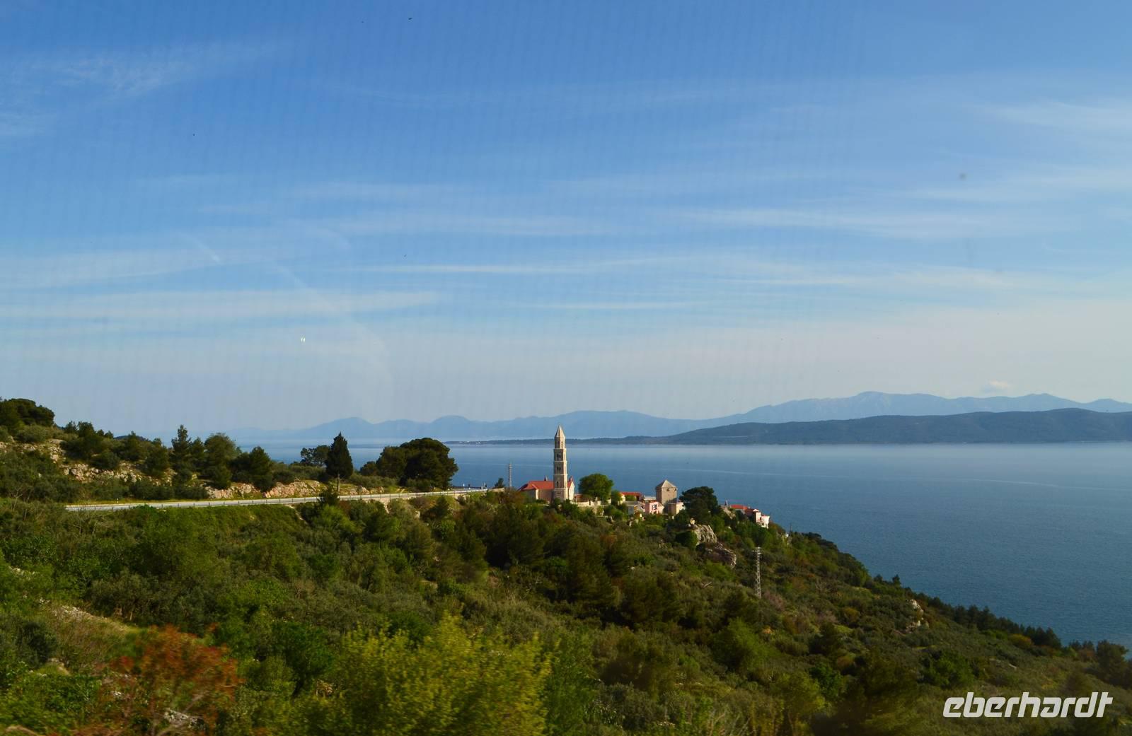 Die Fähre bringt uns ans Festland und unter den hohen Bergen des Velebitgebirges schlängelt sich die Küstenstraße über Senj nach Rijeka. Die Blicke auf die davor in der Adria liegenden Inseln sind überwältigend.