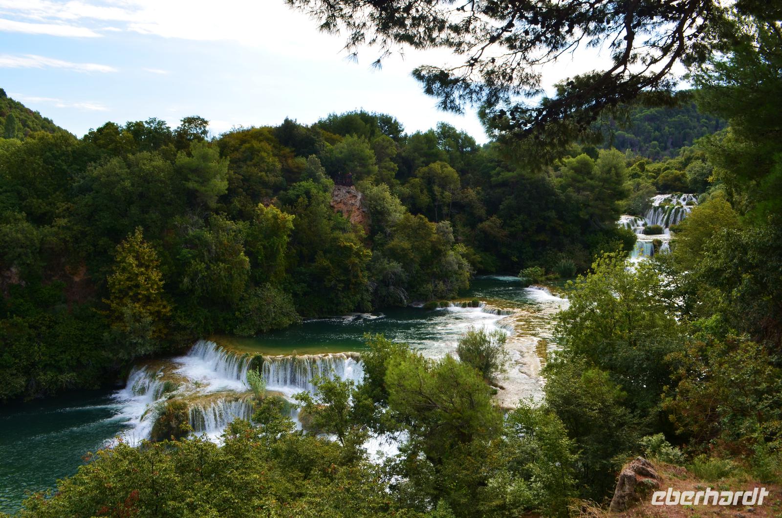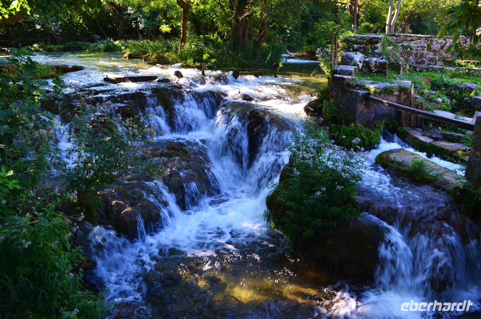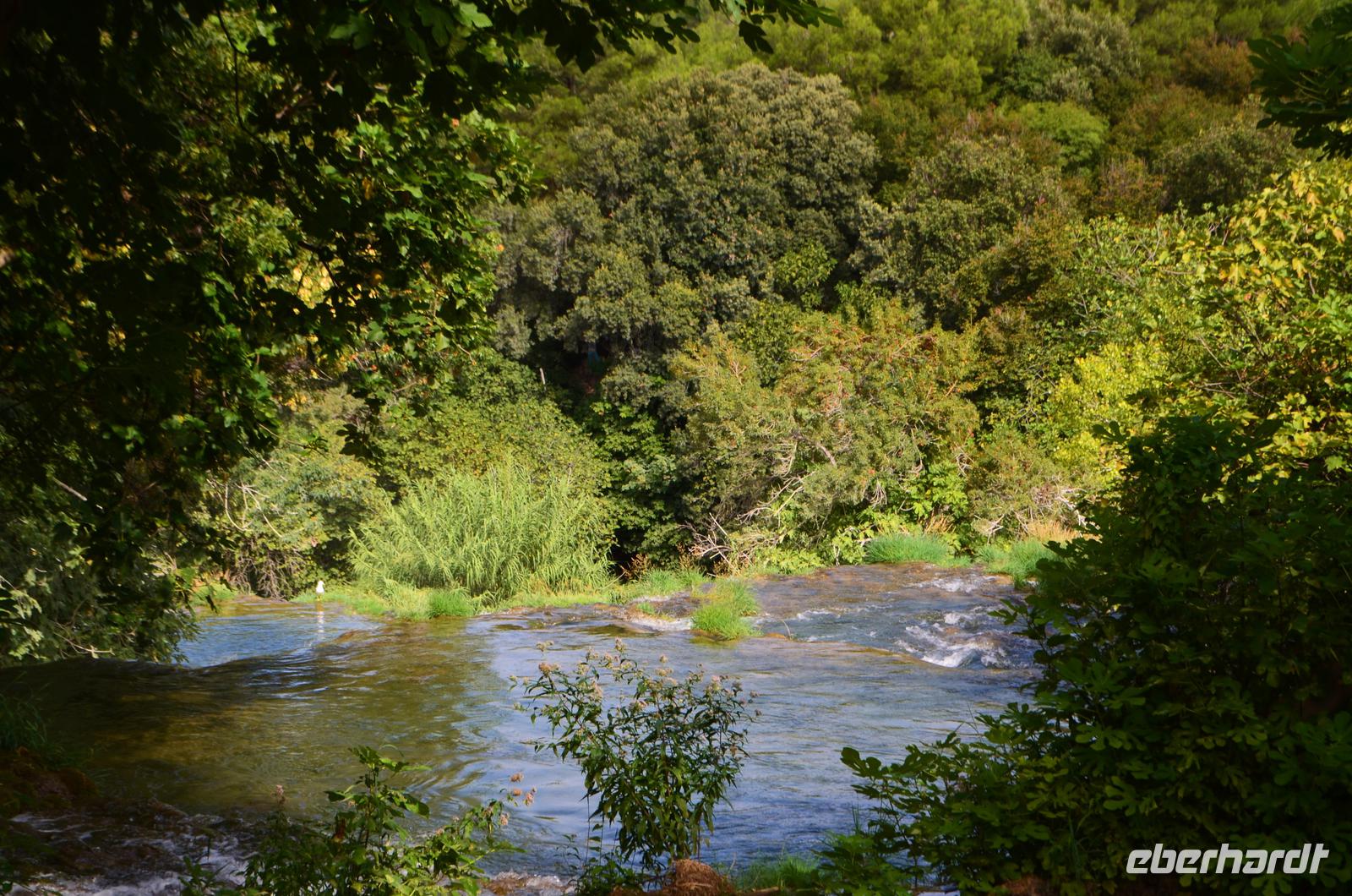 Wieder schönes Wetter, wir haben Glück, denn für den Besuch des Krka-Nationalparks sind das die idealen Bedingungen. Wir fahren vom Eingang Lozovac gemeinsam mit dem Bus hinab zum unteren Parkplatz, bei dieser Fahrt hat man den schönsten Blick auf die von den Travertinterrassen angestauten Seen. Der Nationalpark ist beeindruckend schön, nicht nur die Wasserfälle und Mühlen, auch die Teppiche von blühenden Alpenveilchen in den Wäldern.