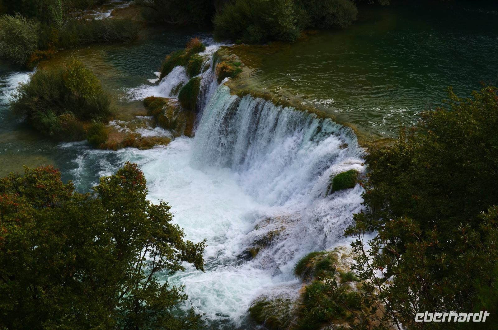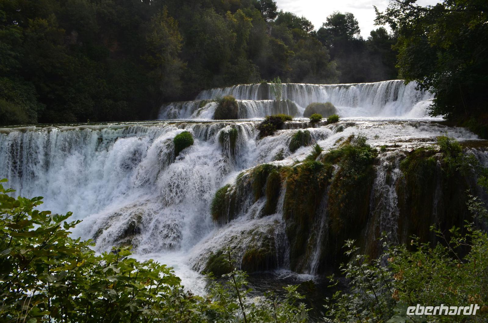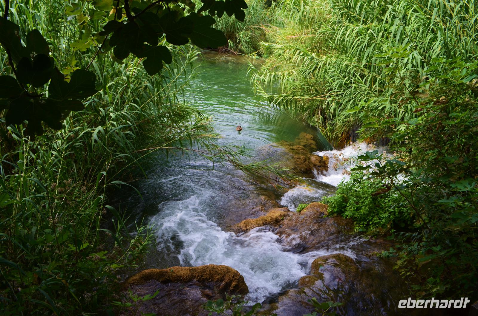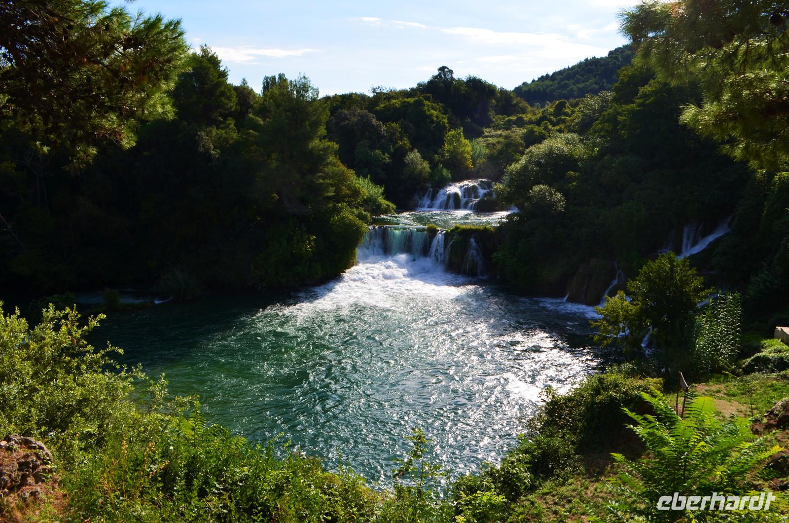 Wieder schönes Wetter, wir haben Glück, denn für den Besuch des Krka-Nationalparks sind das die idealen Bedingungen. Wir fahren vom Eingang Lozovac gemeinsam mit dem Bus hinab zum unteren Parkplatz, bei dieser Fahrt hat man den schönsten Blick auf die von den Travertinterrassen angestauten Seen. Der Nationalpark ist beeindruckend schön, nicht nur die Wasserfälle und Mühlen, auch die Teppiche von blühenden Alpenveilchen in den Wäldern.