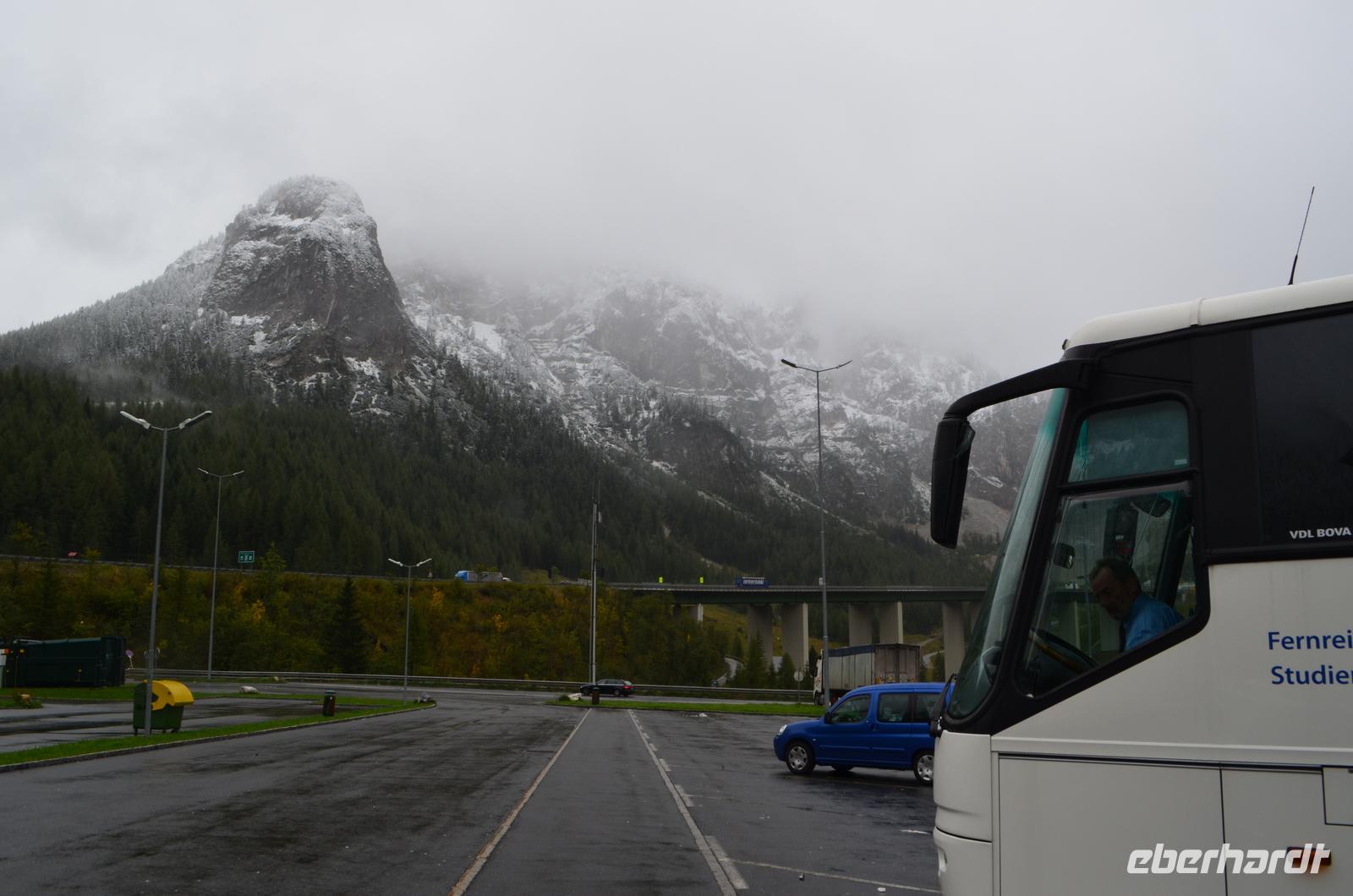 Der Tag beginnt eigentlich mit einer wunderschönen Fahrt durch die Julischen Alpen. Aber es regnet immer noch. Und während der Nacht ist Schnee bis auf 1100 m herab gefallen. Wir fahren über den Predelpass und hinein nach Italien. Bald erreichen wir die Autobahn und dann geht alles im Zeitraffer - Villach, Tauernautobahn, Salzburg, A8, Mittag an der Raststätte Hochfelln. Später nochmals Rast bei Nürnberg.