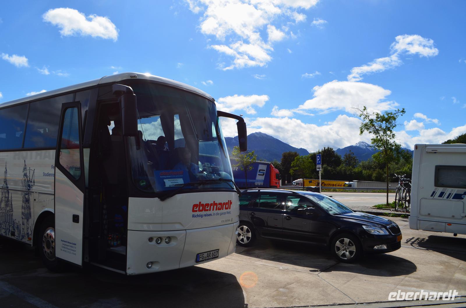 Gut gelaunte Gäste steigen in unseren Reisebus und dann fahren wir über die A93 und A3 Richtung Österreich, machen Pausen bei Regensburg und bei Passau.