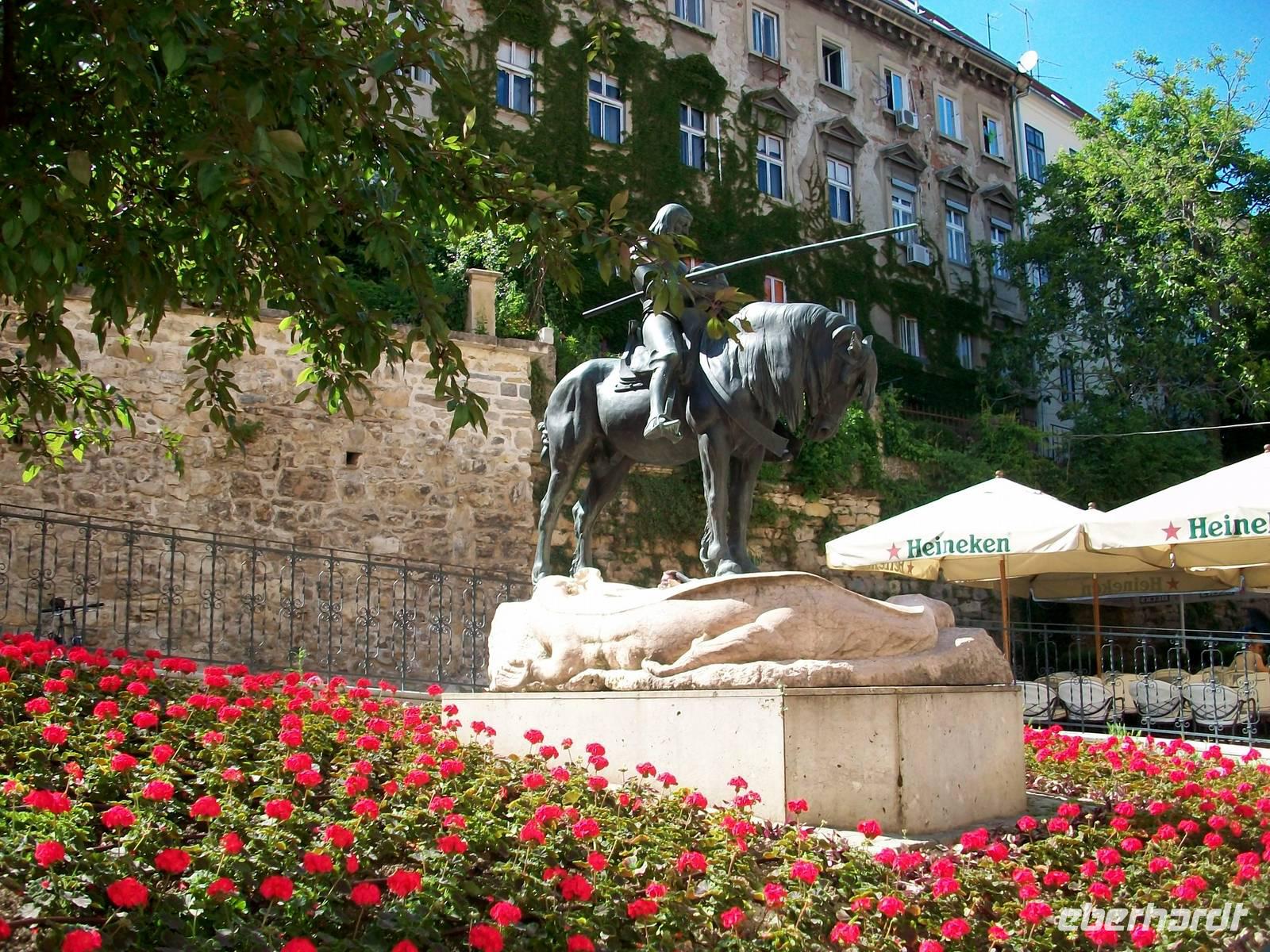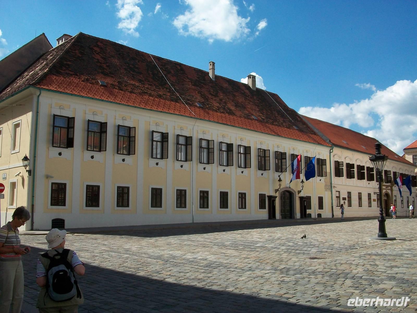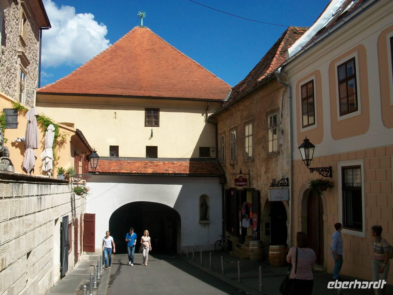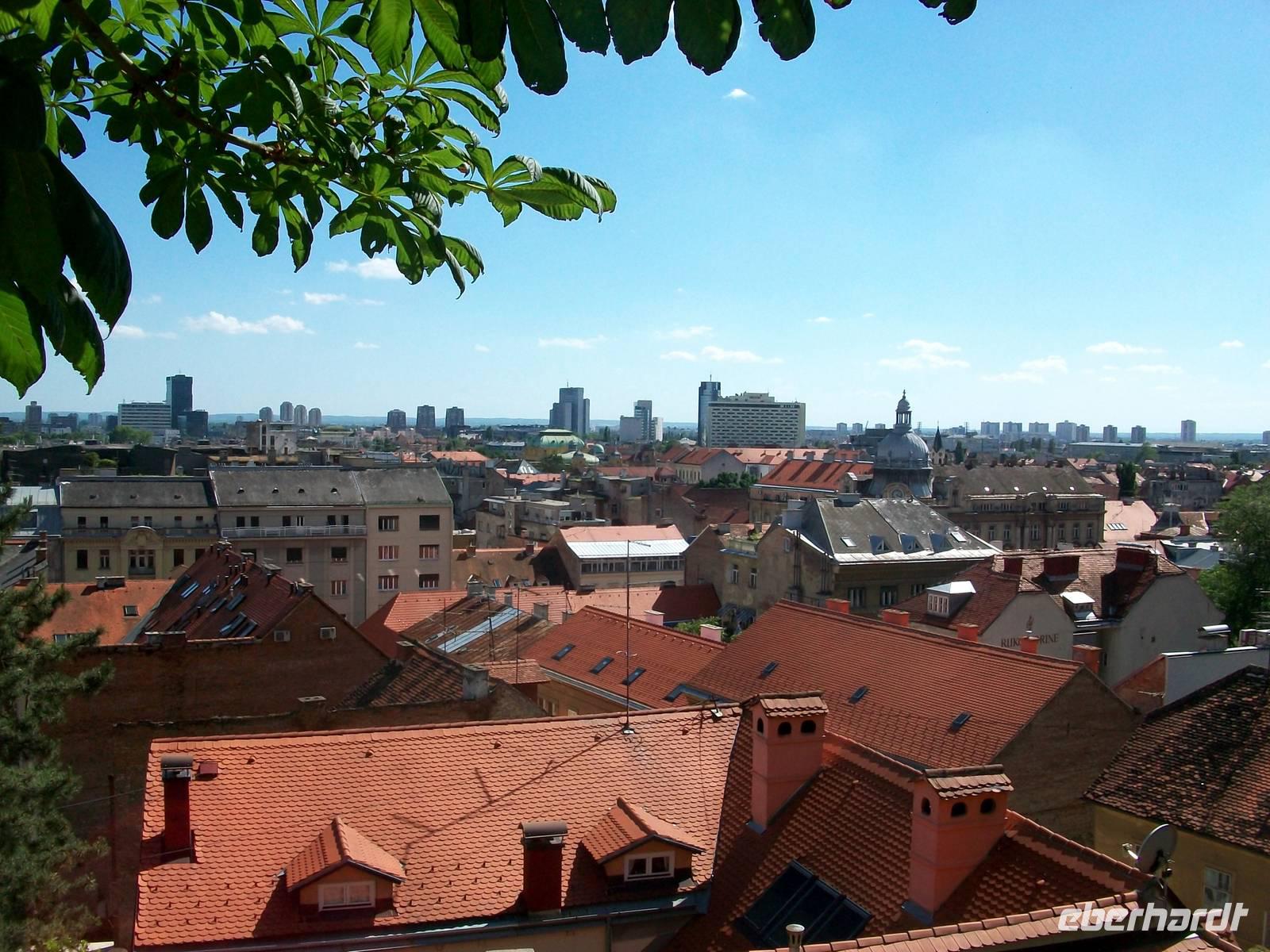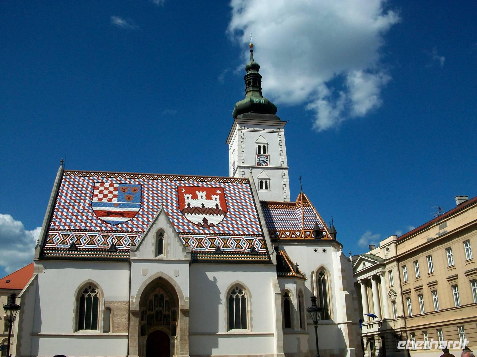 Strahlender Sonnenschein begleitet uns auch hinauf in die Oberstadt. Durch das Steintor mit seinem wundertätigen Marienbild hindurch, gelangen wir empor zum Markusplatz und befinden uns hier nun im Machtzentrum des Landes Kroatien und der Stadt Zagreb. Besonders schön ist aber die Markuskirche mit den bunt glasierten Dachziegeln anzuschauen. Dann haben wir noch einen schönen Panoramablick von einer Terrasse auf die Dächer der Stadt und das schöne Umland um wenig später hinunter zum Hauptplatz zu gelangen.