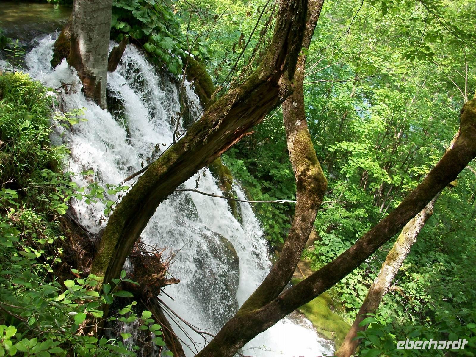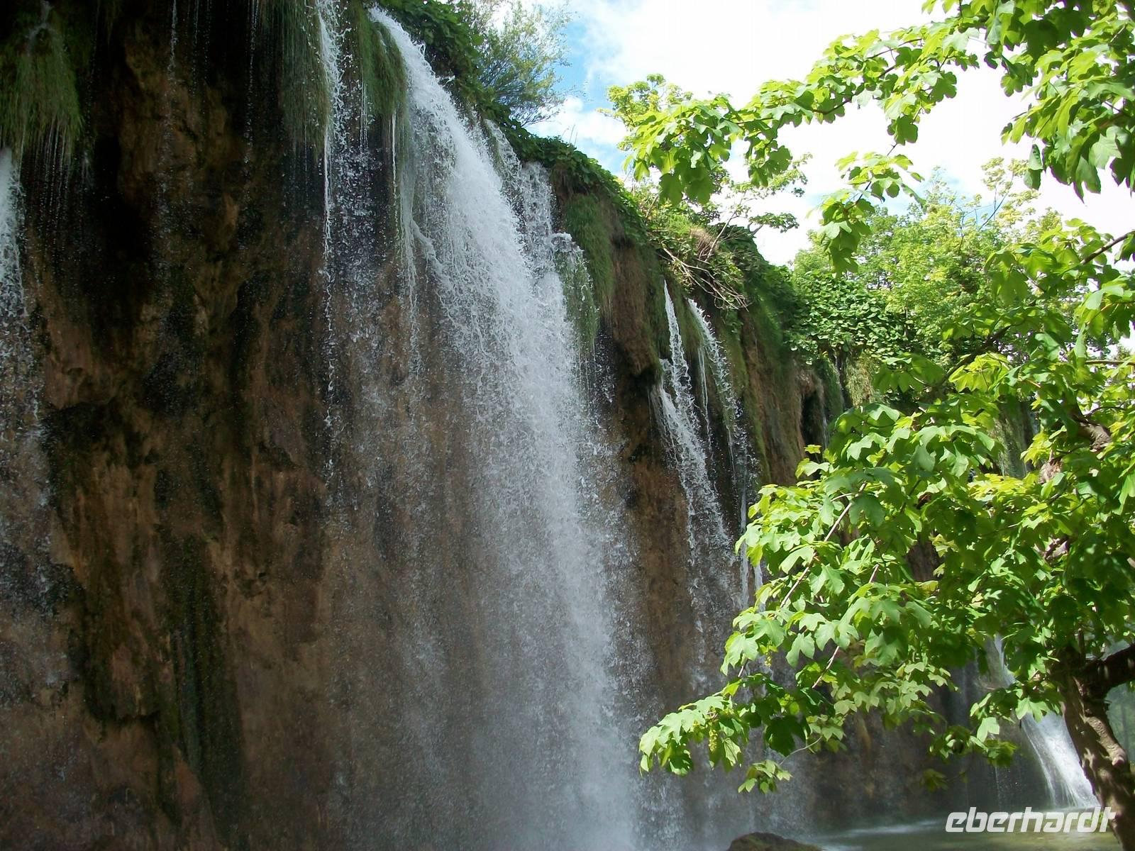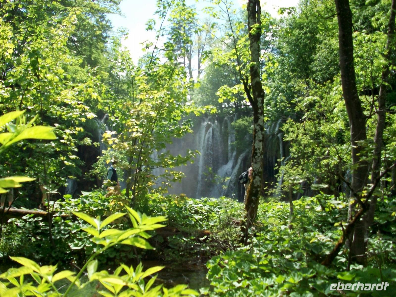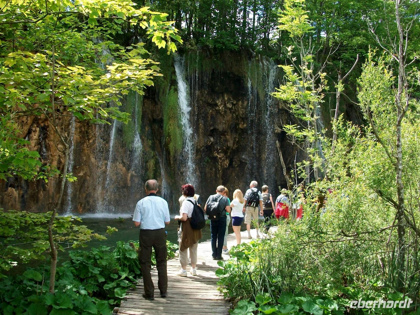 Das letzte Hochwasser hat hier noch einige Spuren hinterlassen, aber das Alternativprogramm ist sehr attraktiv. Mit der Panoramabahn gelangen wir ganz hinauf; von hier werden wir abwärts die oberen Seen erkunden. Immer entlang des Wassers, über schmale Wege und Knüppeldämme, führt uns der Weg. Dann geht es auch einmal fast unter den Wasserfällen hindurch die uns ihr Nass entgegensenden, ein feiner Nebel aus Wasser netzt uns dabei die Haut.