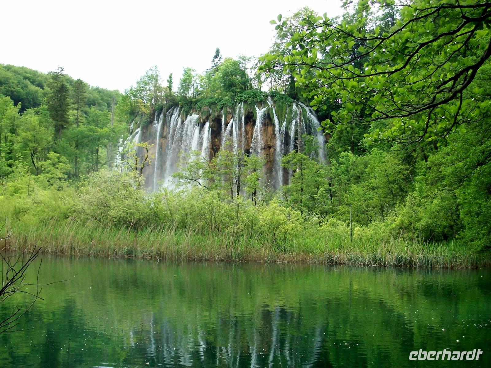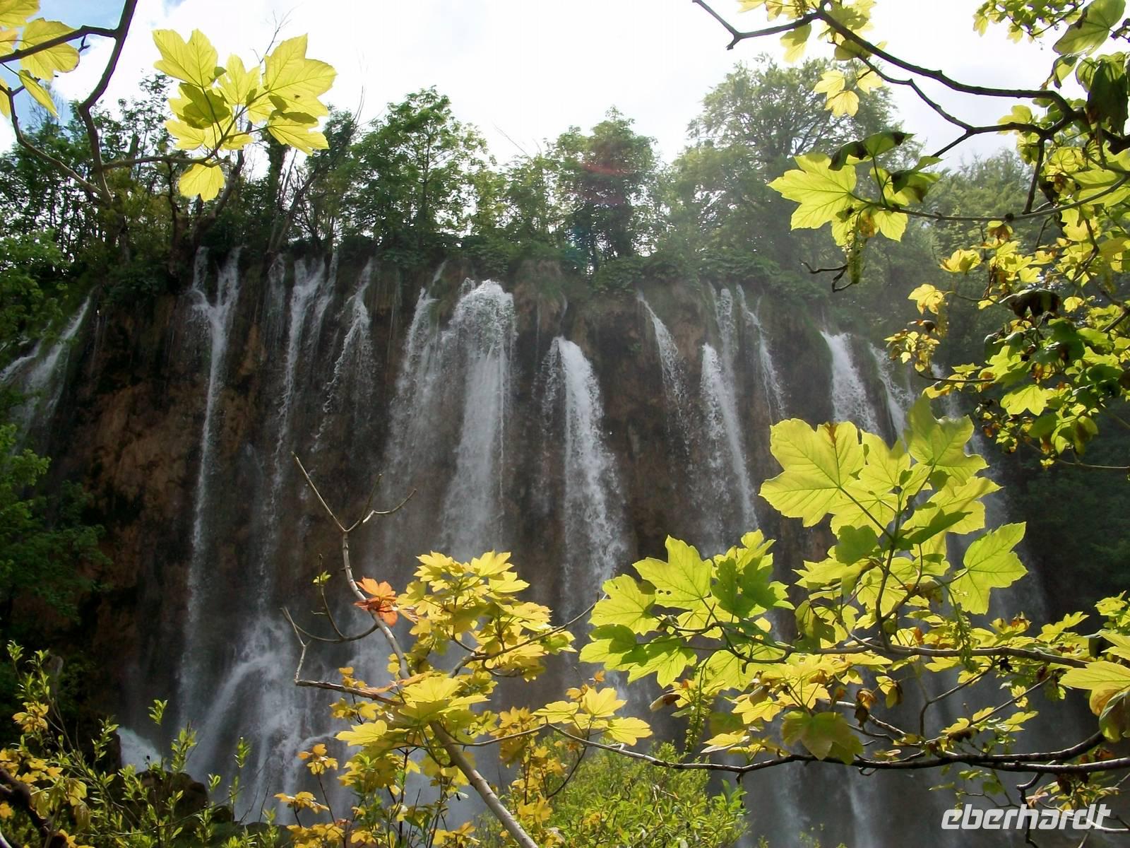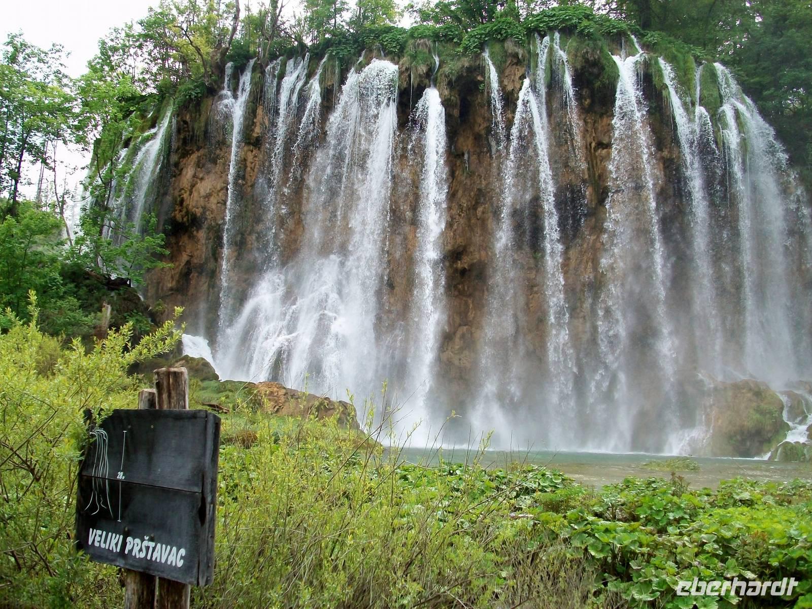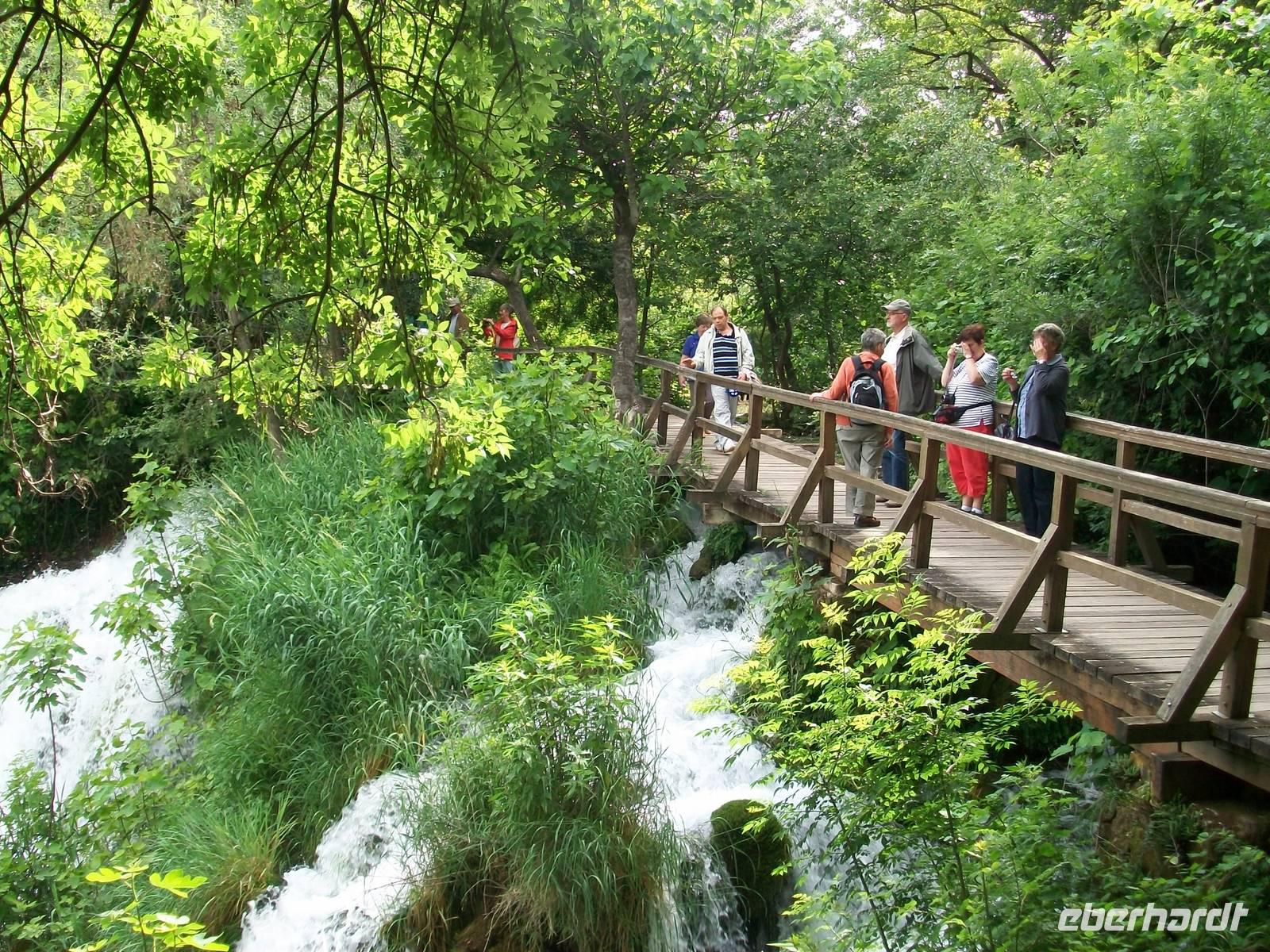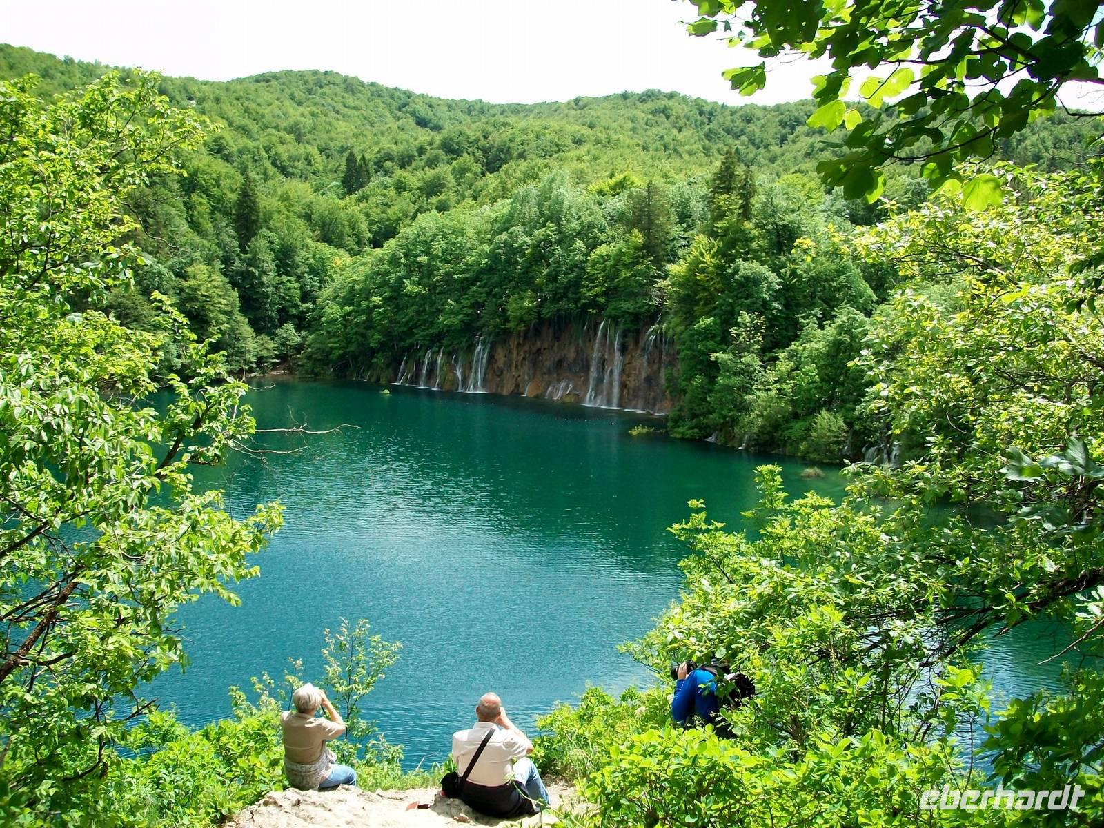 Das letzte Hochwasser hat hier noch einige Spuren hinterlassen, aber das Alternativprogramm ist sehr attraktiv. Mit der Panoramabahn gelangen wir ganz hinauf; von hier werden wir abwärts die oberen Seen erkunden. Immer entlang des Wassers, über schmale Wege und Knüppeldämme, führt uns der Weg. Dann geht es auch einmal fast unter den Wasserfällen hindurch die uns ihr Nass entgegensenden, ein feiner Nebel aus Wasser netzt uns dabei die Haut.