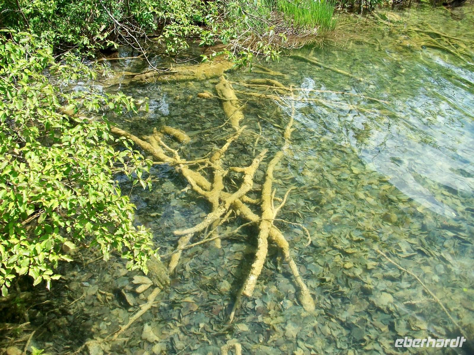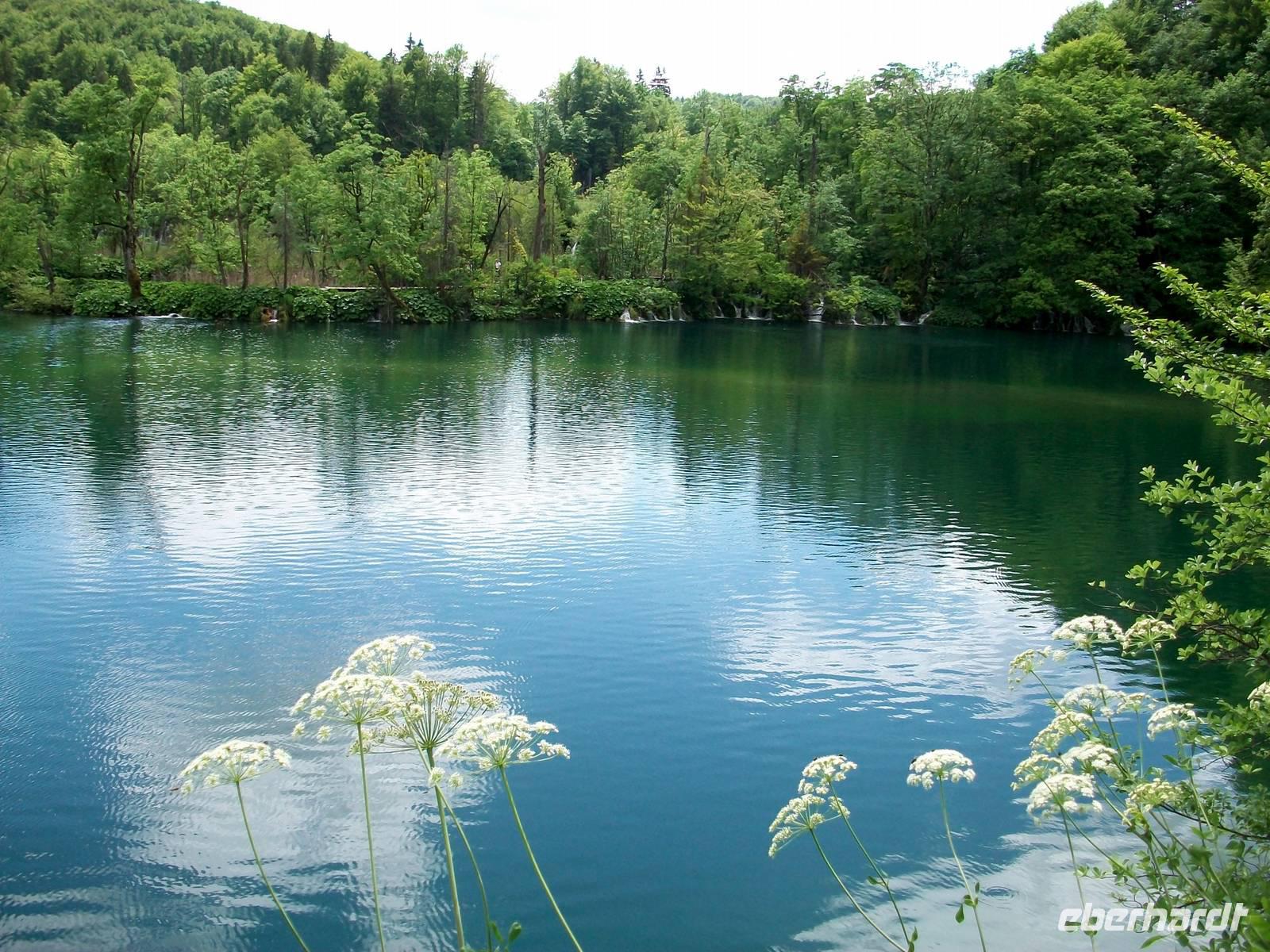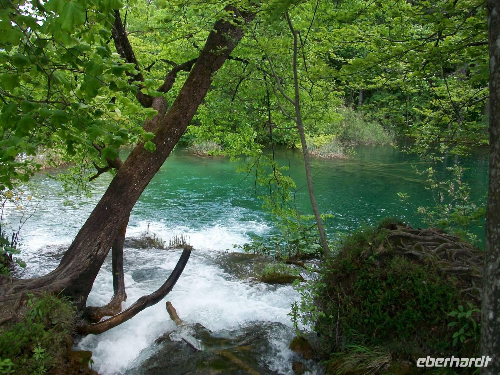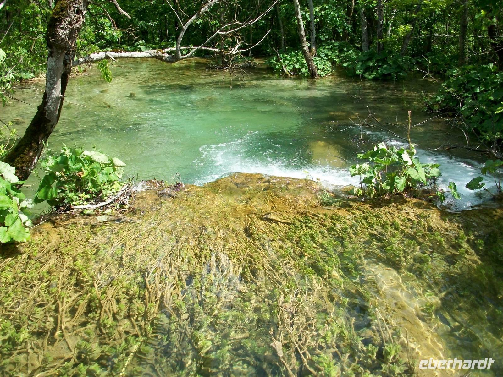 Das letzte Hochwasser hat hier noch einige Spuren hinterlassen, aber das Alternativprogramm ist sehr attraktiv. Mit der Panoramabahn gelangen wir ganz hinauf; von hier werden wir abwärts die oberen Seen erkunden. Immer entlang des Wassers, über schmale Wege und Knüppeldämme, führt uns der Weg. Dann geht es auch einmal fast unter den Wasserfällen hindurch die uns ihr Nass entgegensenden, ein feiner Nebel aus Wasser netzt uns dabei die Haut.