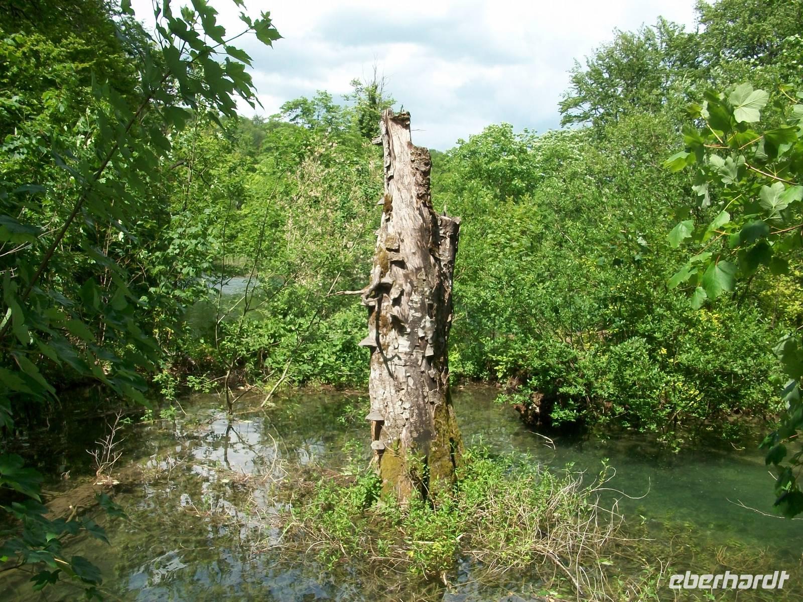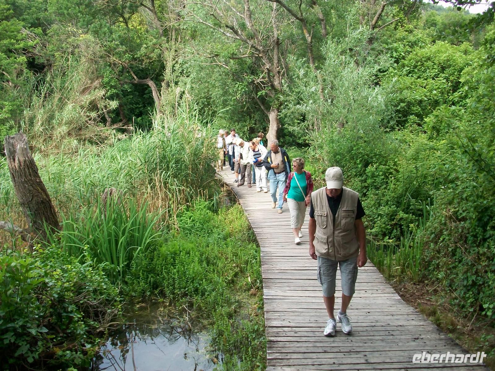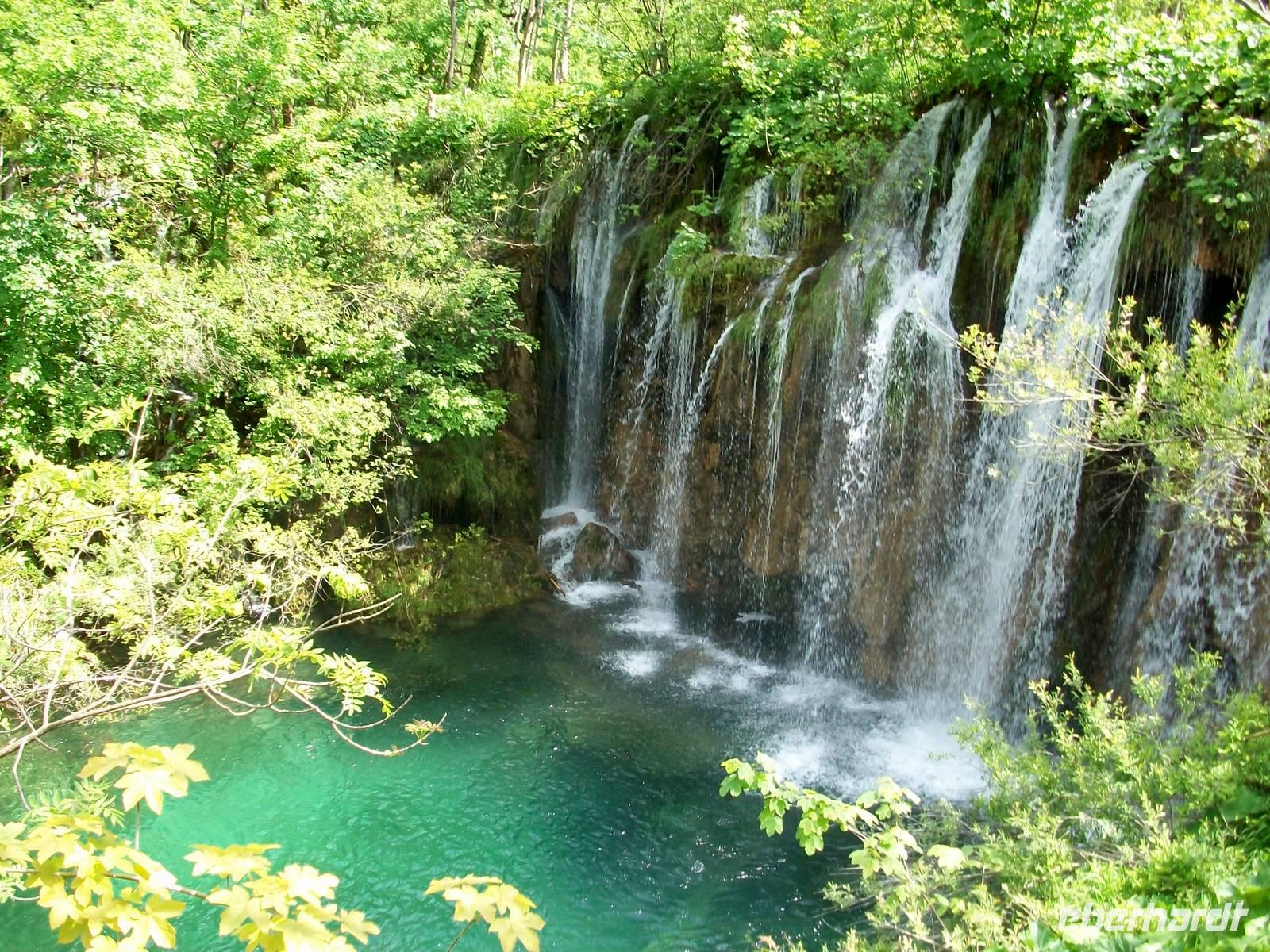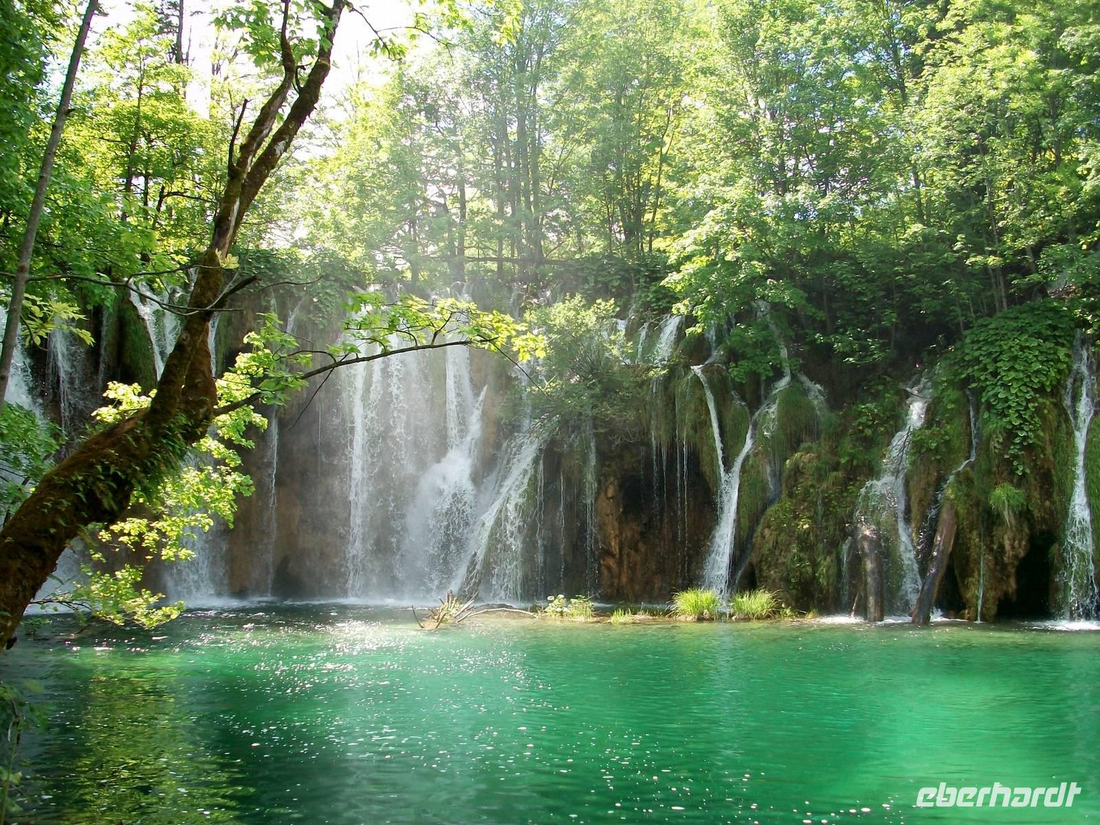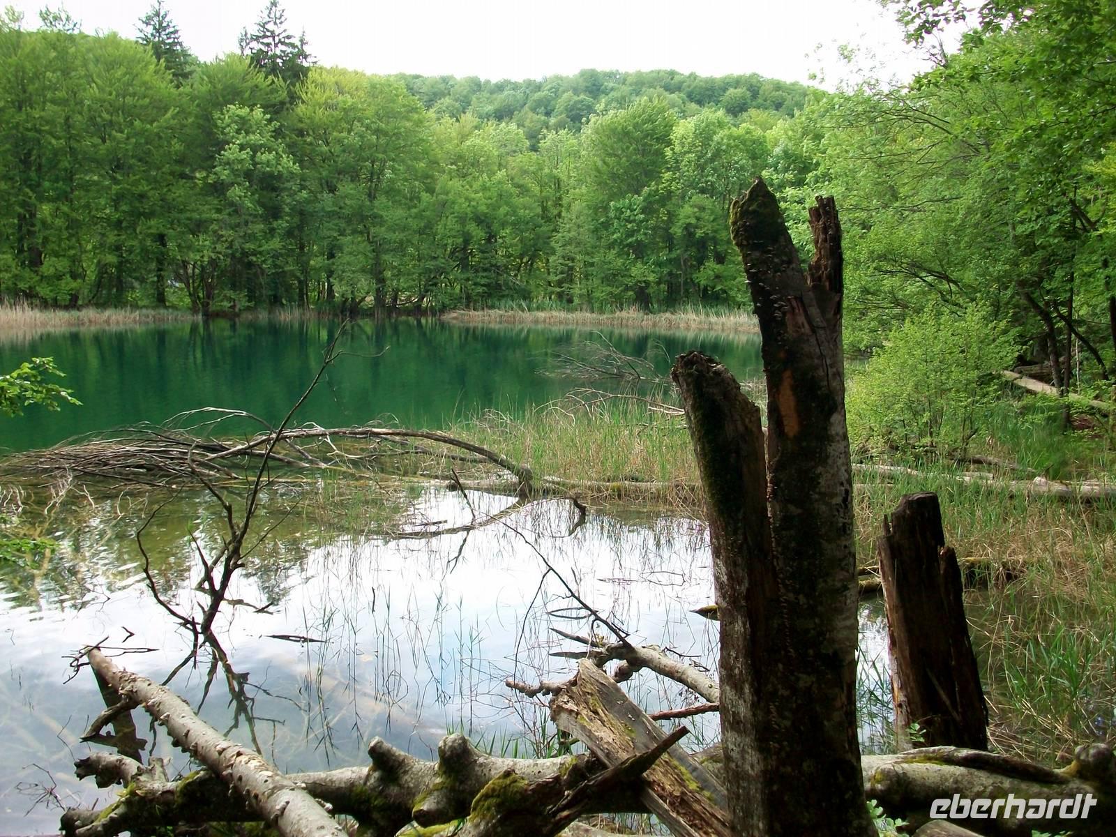 Das letzte Hochwasser hat hier noch einige Spuren hinterlassen, aber das Alternativprogramm ist sehr attraktiv. Mit der Panoramabahn gelangen wir ganz hinauf; von hier werden wir abwärts die oberen Seen erkunden. Immer entlang des Wassers, über schmale Wege und Knüppeldämme, führt uns der Weg. Dann geht es auch einmal fast unter den Wasserfällen hindurch die uns ihr Nass entgegensenden, ein feiner Nebel aus Wasser netzt uns dabei die Haut.