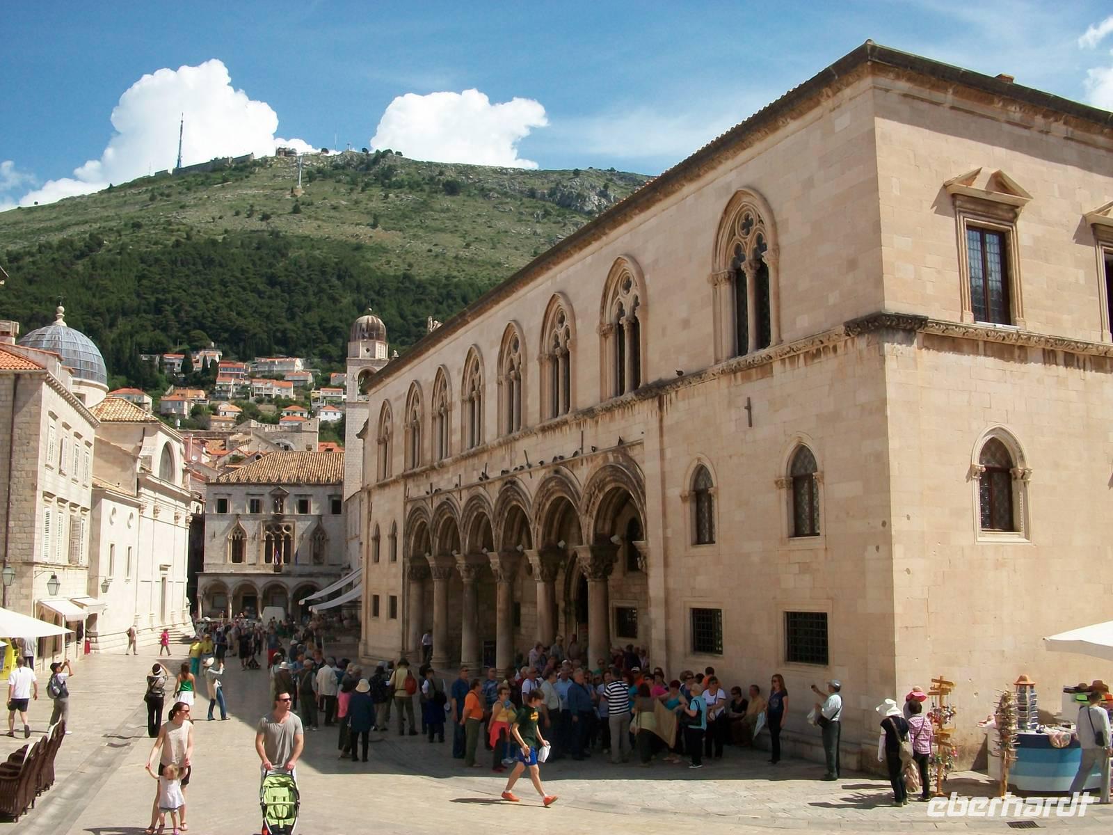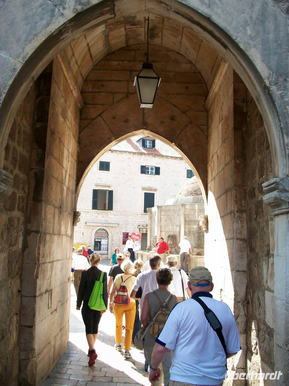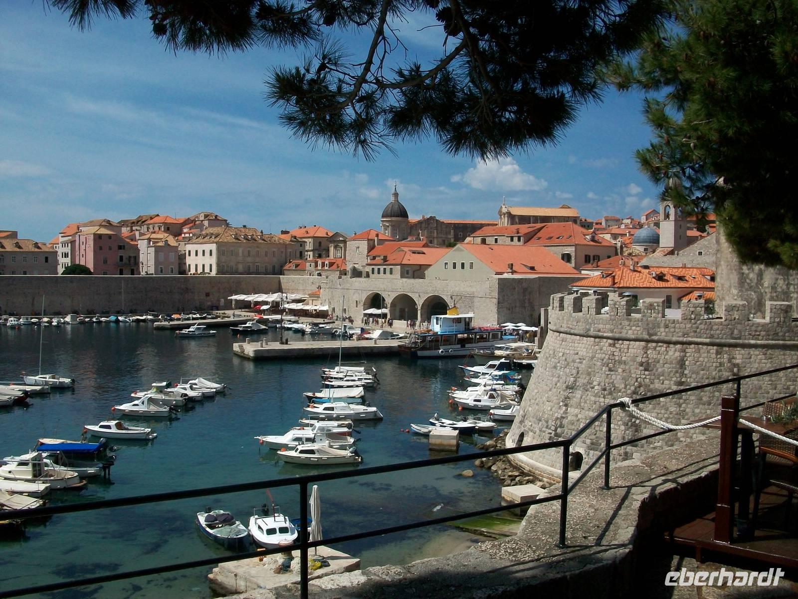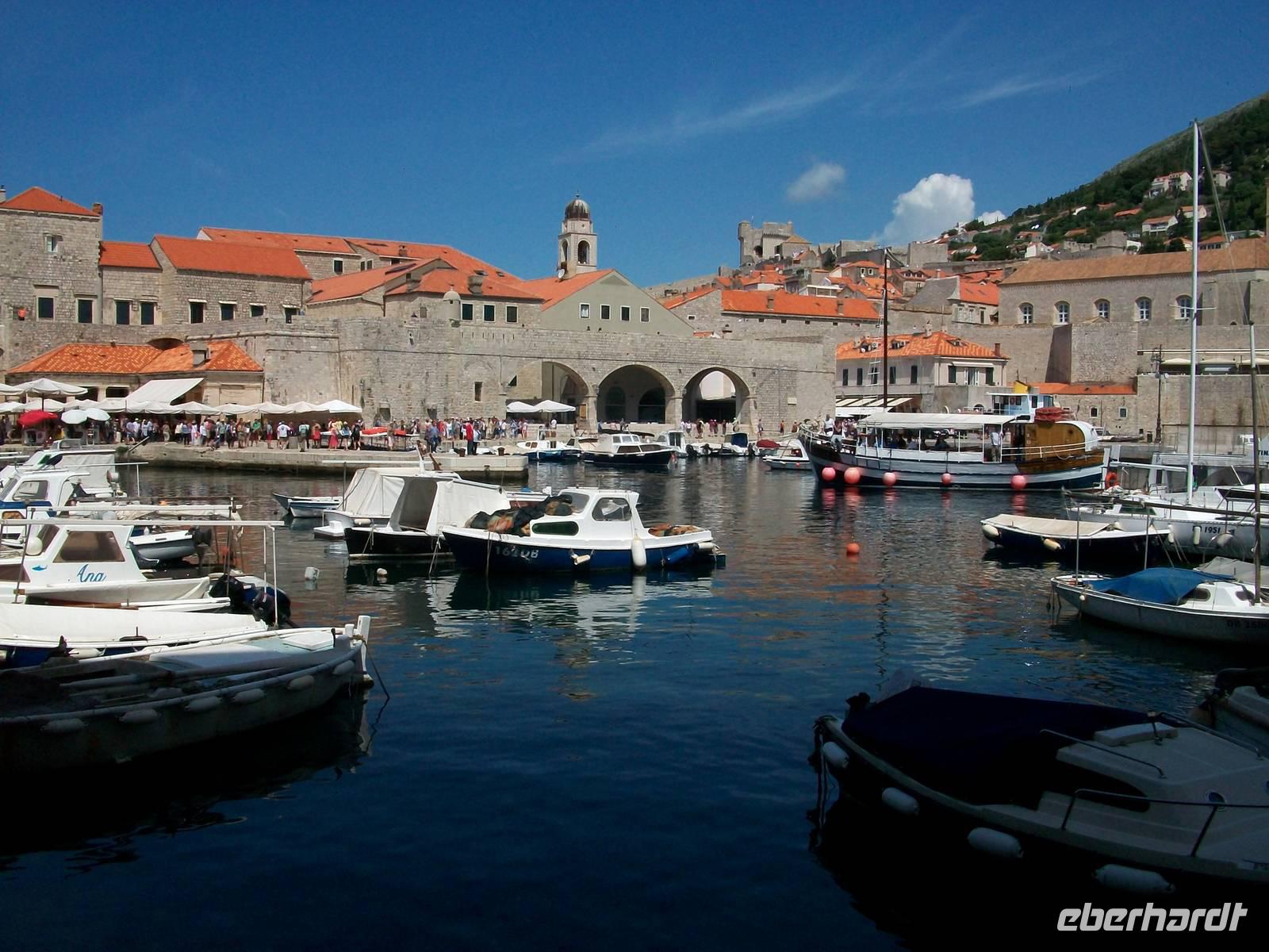 Dann sind wir wieder auf den Gassen unterwegs; unser Weg führt uns hinauf zur sogenannten „Fressgasse", hier gibt es zahlreiche wirklich gute Restaurants mit verlockenden Angeboten für das Mittagessen. Doch soweit ist es noch nicht, der Rundgang führt uns an der Blasiuskirche vorbei zum Alten Hafen. Hier warten viele Bootsbesitzer auf Kundschaft, eine Schifffahrt am Nachmittag ist auch eine gute Empfehlung für eine angenehme Freizeitgestaltung. Vorbei am Hafenbecken, im Hintergrund ist auch die alte Quarantänestation zu sehen, gelangen wir zur Kathedrale und schließlich dann zum Markt der Stadt. Auch hier gibt es ein munteres Treiben; frisches Obst und andere Leckereien werden auf diesem belebten Platz feilgeboten. Am ehemaligen Machtzentrum der alten Ragusa, dem Rektorenpalast, beendet Albin seine wissenswerte Führung.