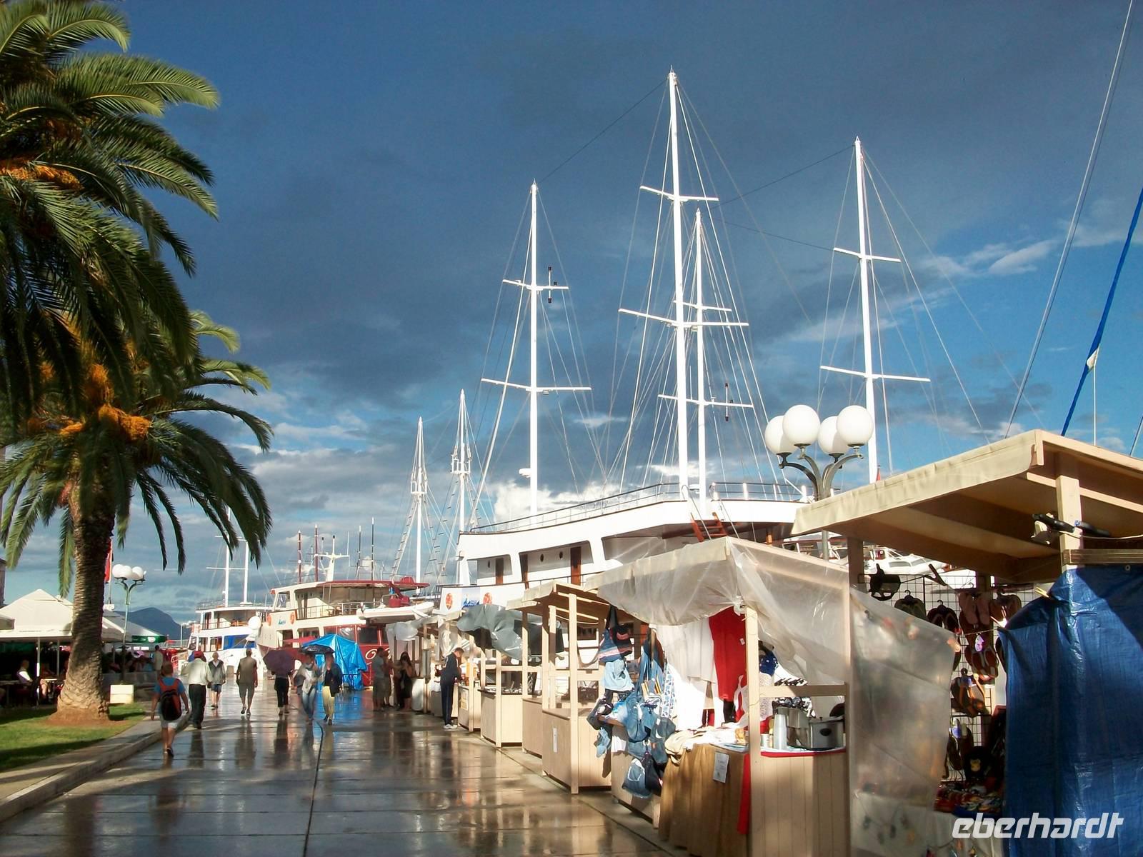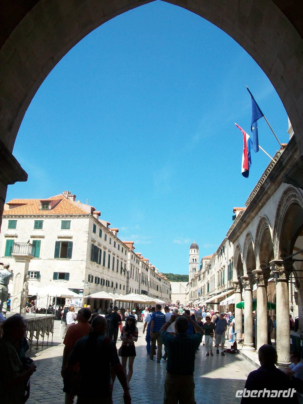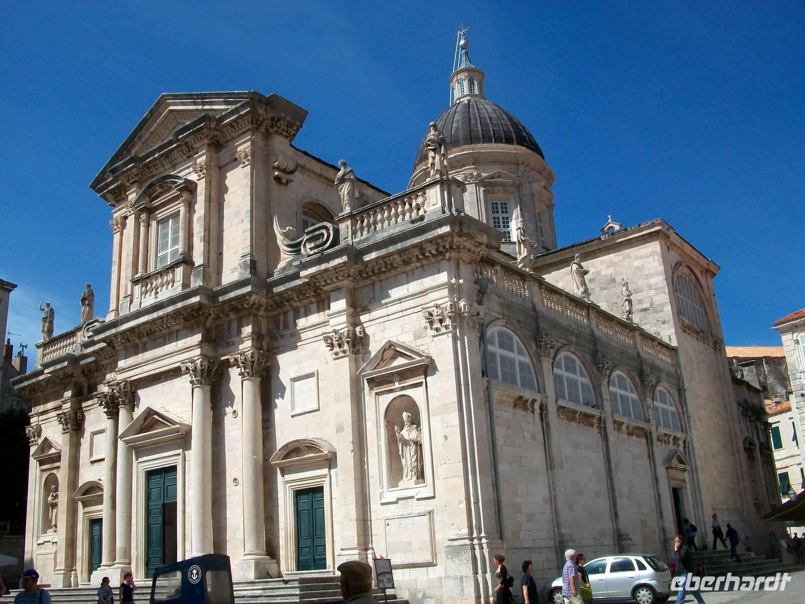 Dann sind wir wieder auf den Gassen unterwegs; unser Weg führt uns hinauf zur sogenannten „Fressgasse", hier gibt es zahlreiche wirklich gute Restaurants mit verlockenden Angeboten für das Mittagessen. Doch soweit ist es noch nicht, der Rundgang führt uns an der Blasiuskirche vorbei zum Alten Hafen. Hier warten viele Bootsbesitzer auf Kundschaft, eine Schifffahrt am Nachmittag ist auch eine gute Empfehlung für eine angenehme Freizeitgestaltung. Vorbei am Hafenbecken, im Hintergrund ist auch die alte Quarantänestation zu sehen, gelangen wir zur Kathedrale und schließlich dann zum Markt der Stadt. Auch hier gibt es ein munteres Treiben; frisches Obst und andere Leckereien werden auf diesem belebten Platz feilgeboten. Am ehemaligen Machtzentrum der alten Ragusa, dem Rektorenpalast, beendet Albin seine wissenswerte Führung.