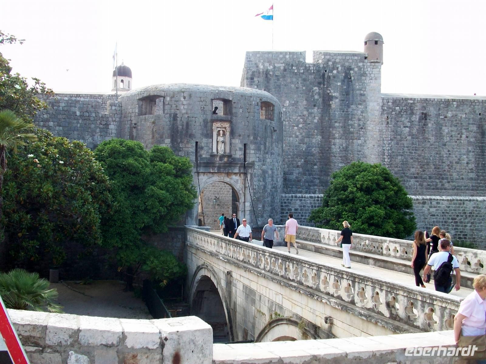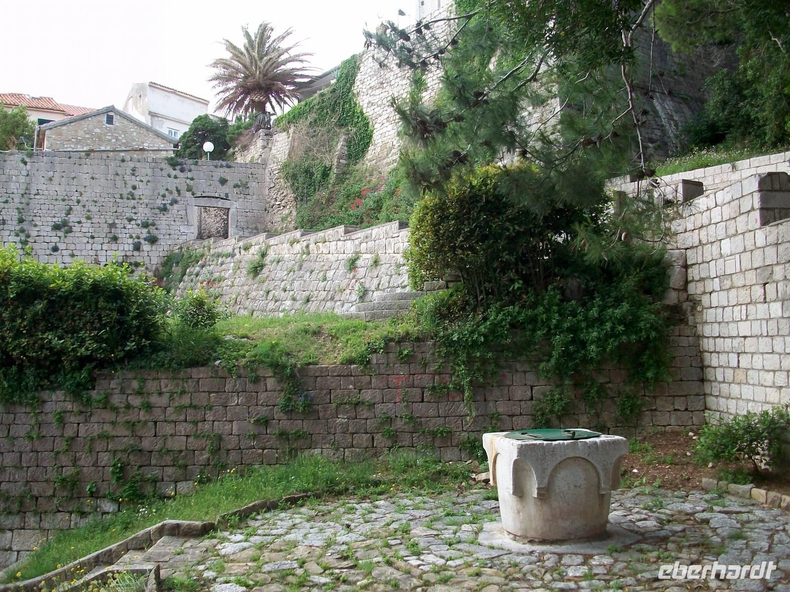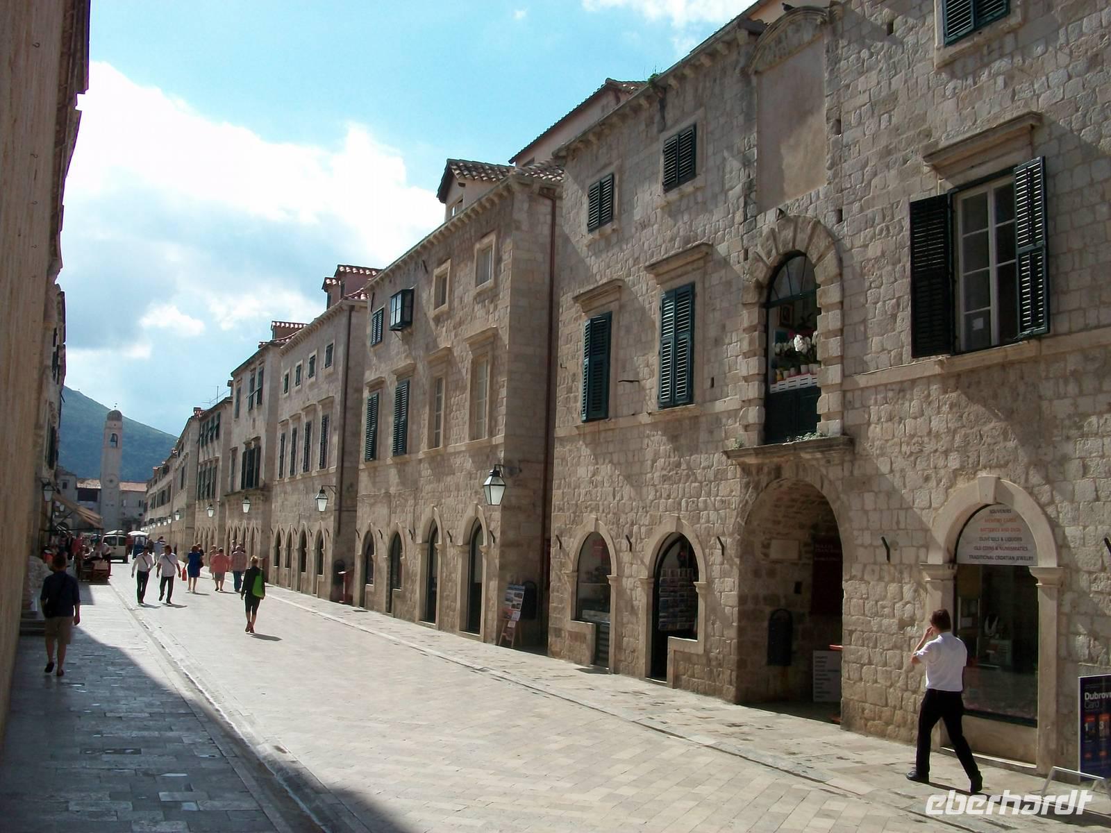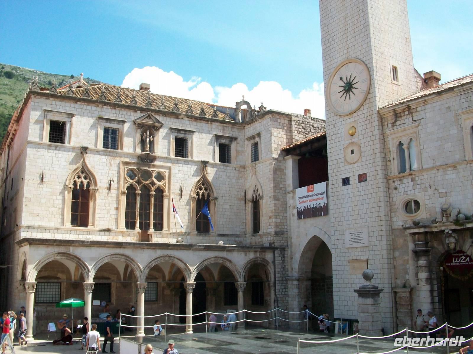 Dann sind wir wieder auf den Gassen unterwegs; unser Weg führt uns hinauf zur sogenannten „Fressgasse", hier gibt es zahlreiche wirklich gute Restaurants mit verlockenden Angeboten für das Mittagessen. Doch soweit ist es noch nicht, der Rundgang führt uns an der Blasiuskirche vorbei zum Alten Hafen. Hier warten viele Bootsbesitzer auf Kundschaft, eine Schifffahrt am Nachmittag ist auch eine gute Empfehlung für eine angenehme Freizeitgestaltung. Vorbei am Hafenbecken, im Hintergrund ist auch die alte Quarantänestation zu sehen, gelangen wir zur Kathedrale und schließlich dann zum Markt der Stadt. Auch hier gibt es ein munteres Treiben; frisches Obst und andere Leckereien werden auf diesem belebten Platz feilgeboten. Am ehemaligen Machtzentrum der alten Ragusa, dem Rektorenpalast, beendet Albin seine wissenswerte Führung.