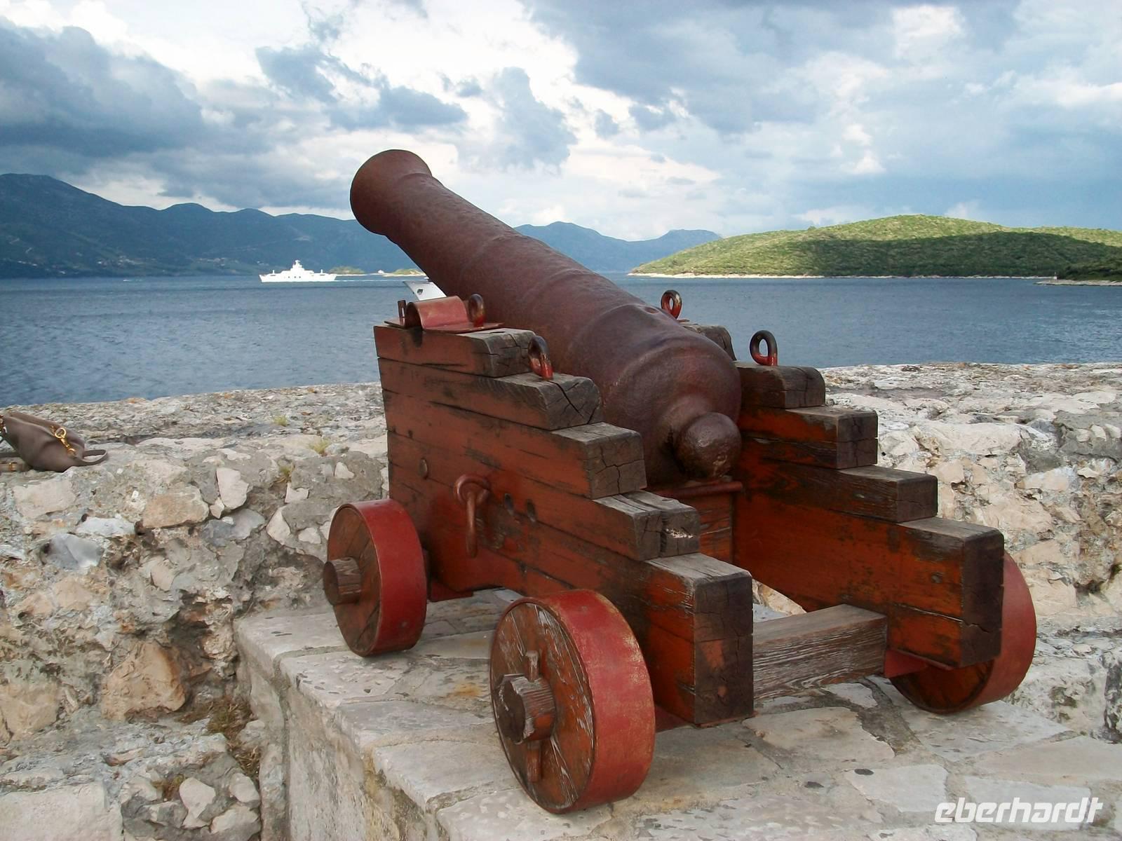 Zunächst sind wir wieder auf der Küstenstraße unterwegs; der Blick geht hinüber zu den Elaphitischen Inseln. Einige Schiffe sind hier unterwegs eine helle Spur von Kielwasser nach sich ziehend. Das Wetter gestaltet sich auch wieder sehr schön; Sonnenschein empfängt uns im Ort Ston, hier legen wir eine erste Pause ein.