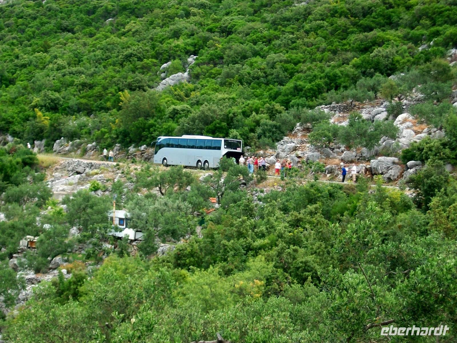 Dann geht die Fahrt weiter; bald erreichen wir wieder das Festland, durchqueren noch einmal das fruchtbare Tal der Neretva um beim Ort Ploce in das Hinterland zu gelangen. Hier gibt es sehr unberührtes Land; zwischen Karstfelsen wächst das Grün der mediterranen Klimazone als plötzlich auf dem Display des Busses ein Warnsignal erscheint. Nun heißt es erst einmal anhalten und nachschauen was los ist! Schnell wird offenbar, dass wir erst einmal nicht weiterkommen; jetzt heißt es telefonieren und Hilfe herbeiholen, während es in den Bergen donnert und leicht regnet.