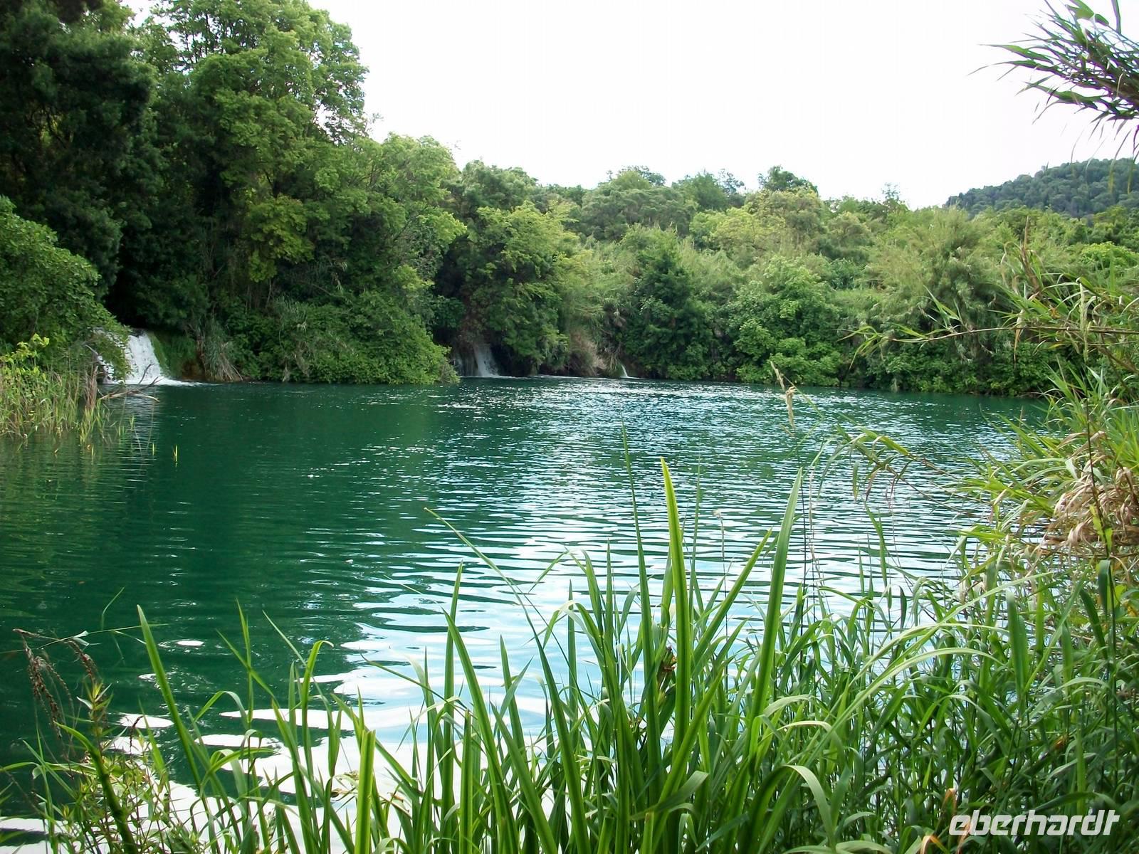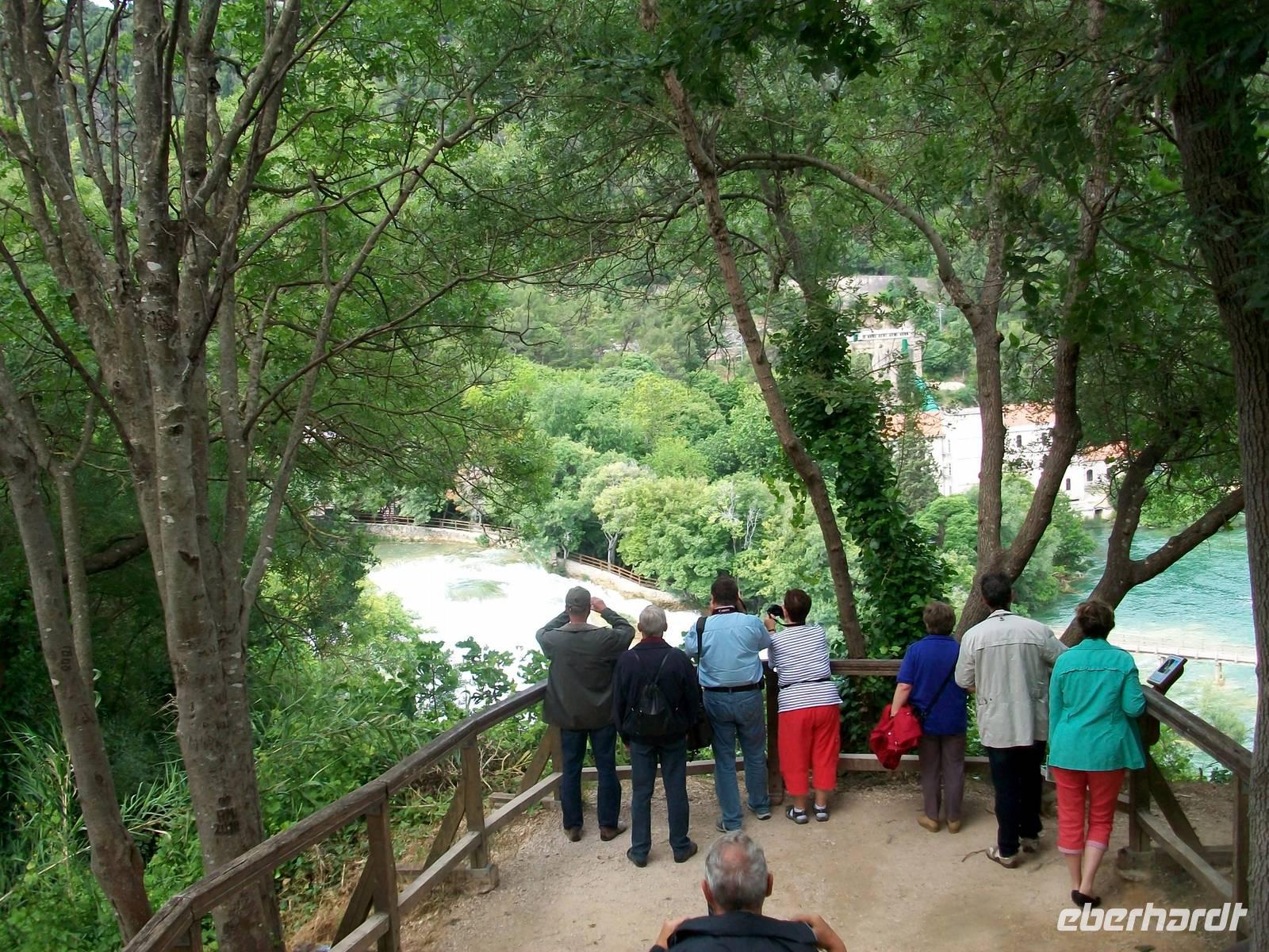 Wir starten auch heute etwas früher um in den ungetrübten Genuss eines der ganz großen Naturwunder Kroatiens zu kommen. Nur eine knappe halbe Stunde Fahrt und wir sind schon am Eingang des Krka- Nationalparks angelangt. Schnell sind die Tickets geholt, dann geht die Fahrt die zahlreichen Serpentinen hinab. Atemberaubend ist schon von oben, der Fluss Krka bildet hier einen großen See der fast bis zum Horizont reicht, der Blick.
