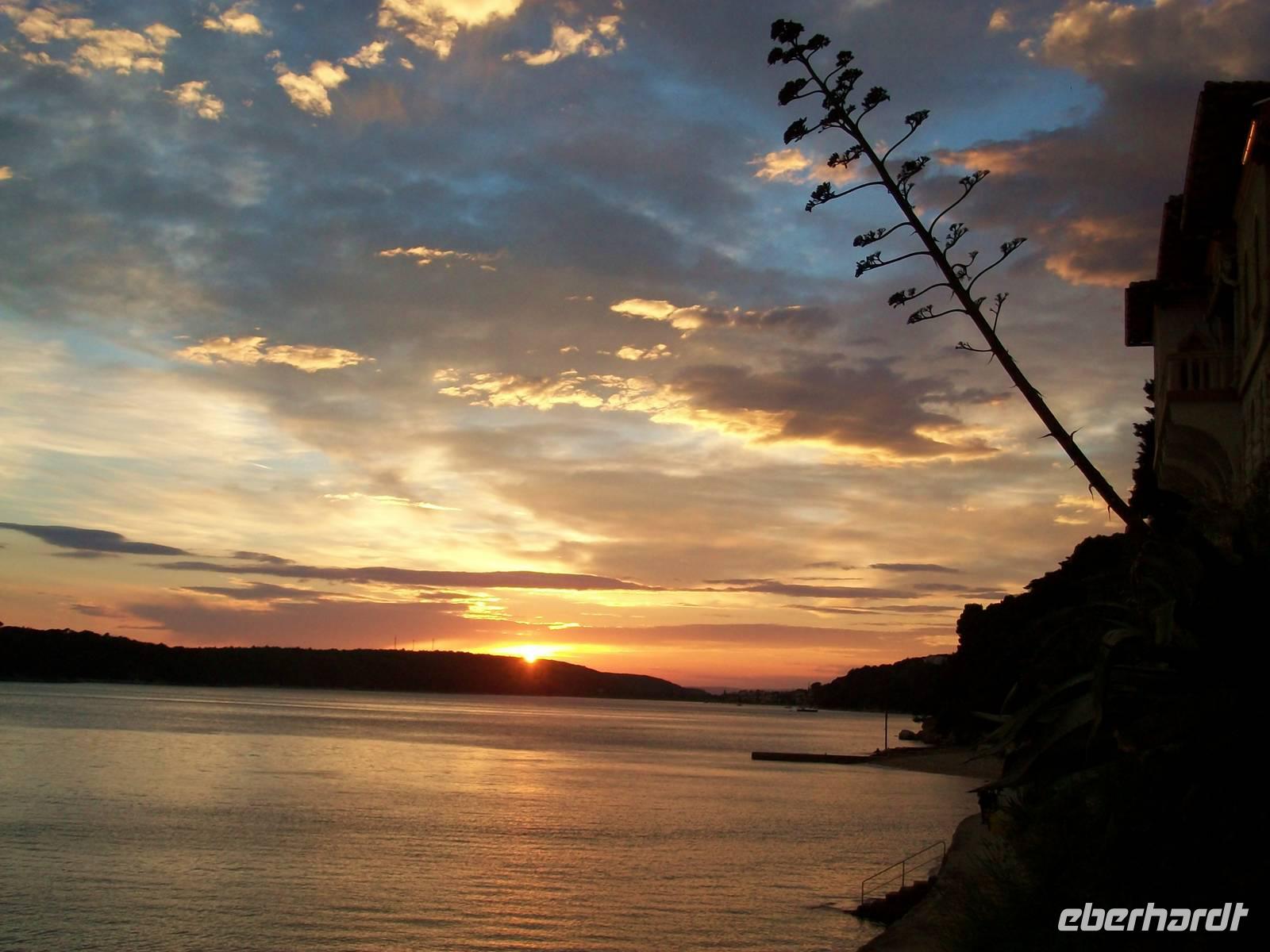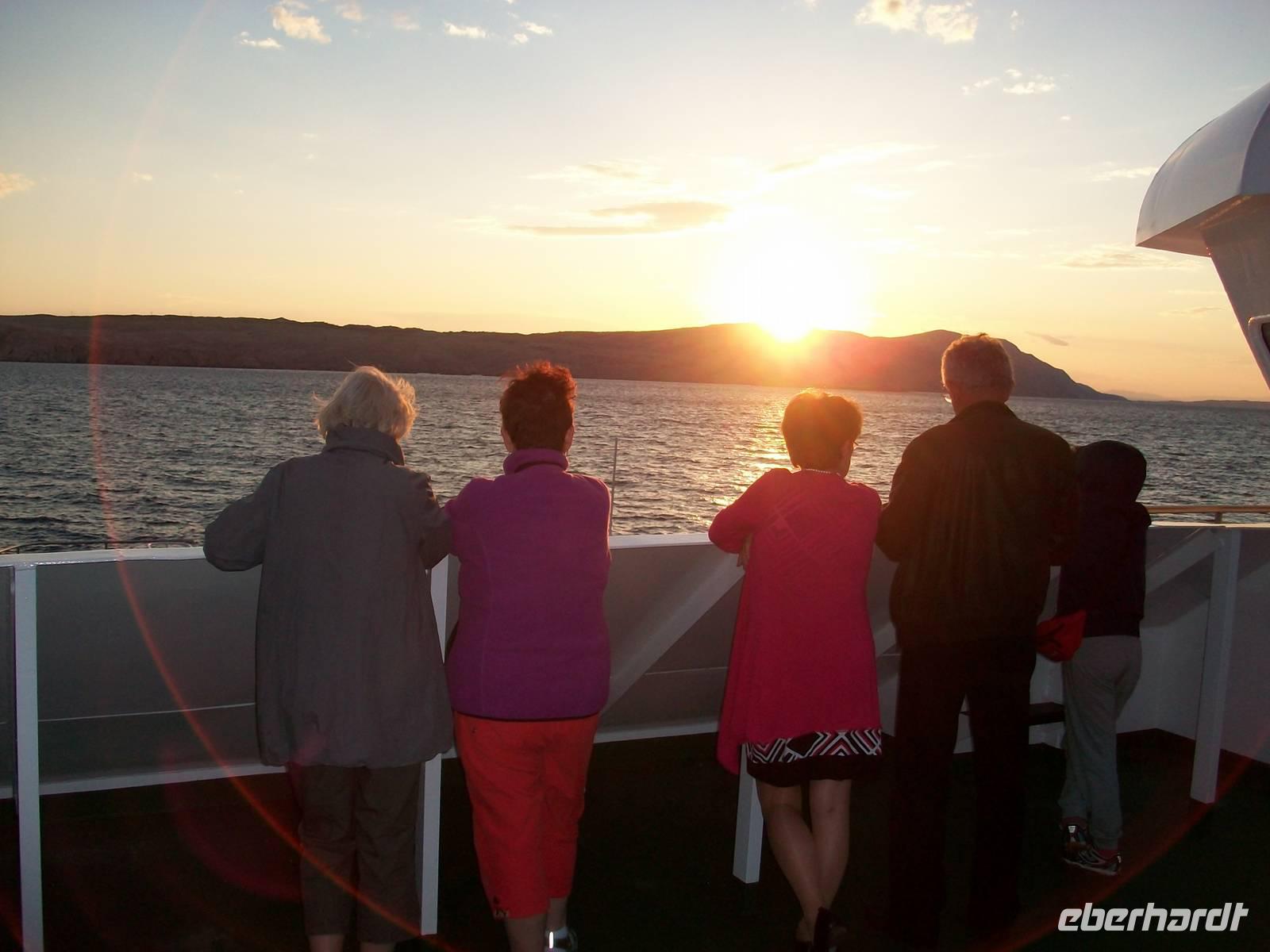 Gegen sieben langen wir am Fähranleger an, unser heutiges Ziel heißt Rab auf der gleichnamigen Insel gelegen. Fast pünktlich legt die Fähre ab; als wir dann zu unserem Hotel unterwegs sind, fahren wir noch einem besonderen Erlebnis entgegen. Direkt vor uns versinkt der glutrote Ball der Sonne im Meer und lässt uns die letzten Minuten vor der Hotelankunft noch zum Genuss werden.