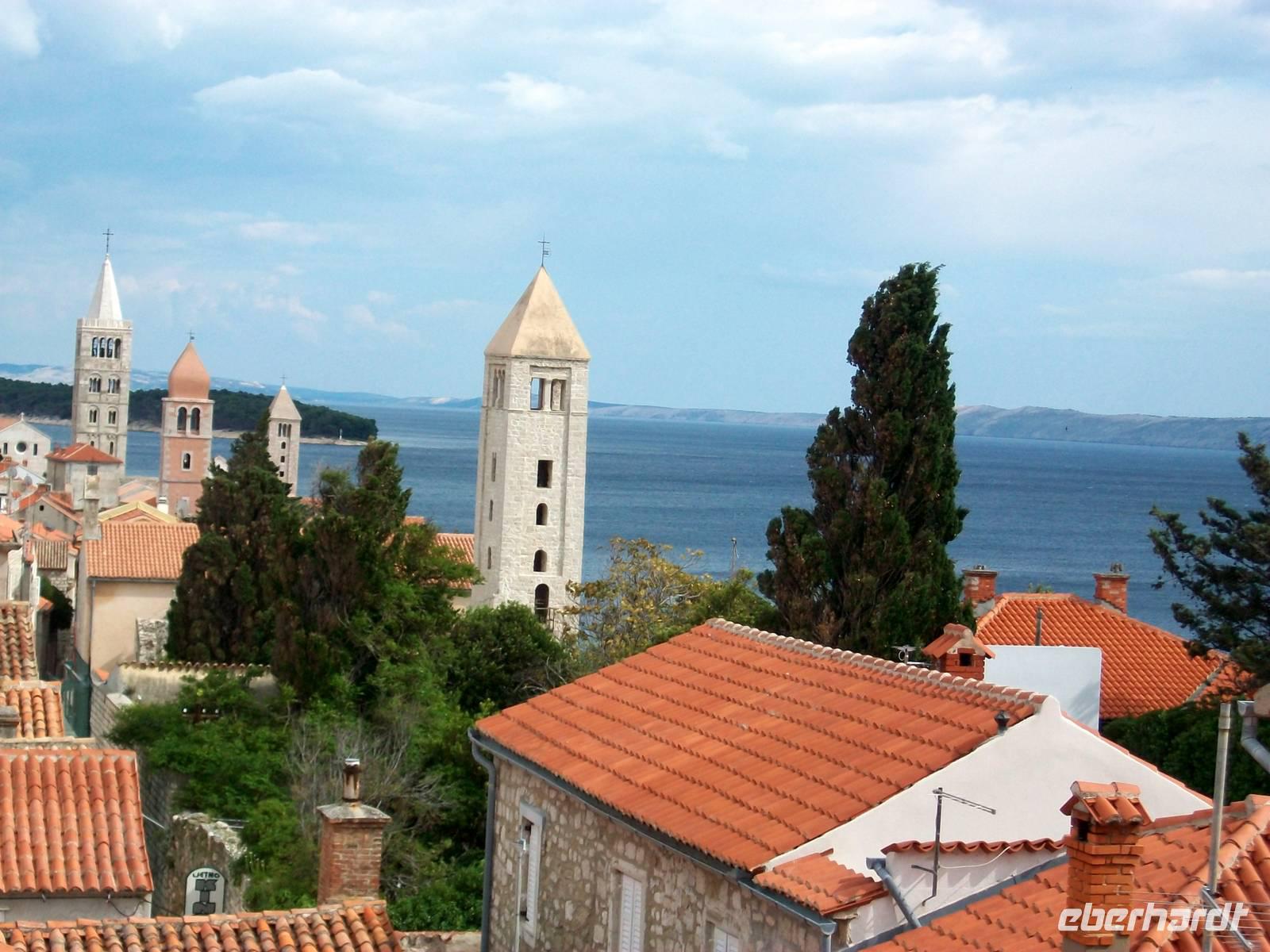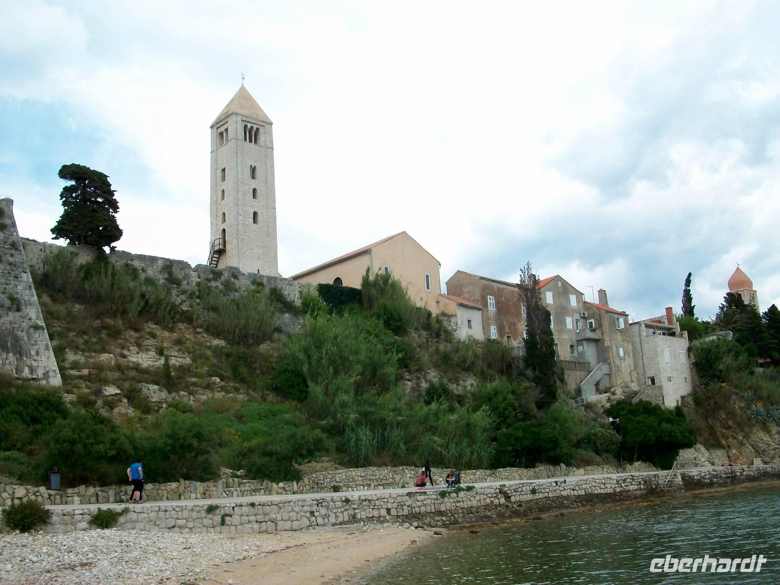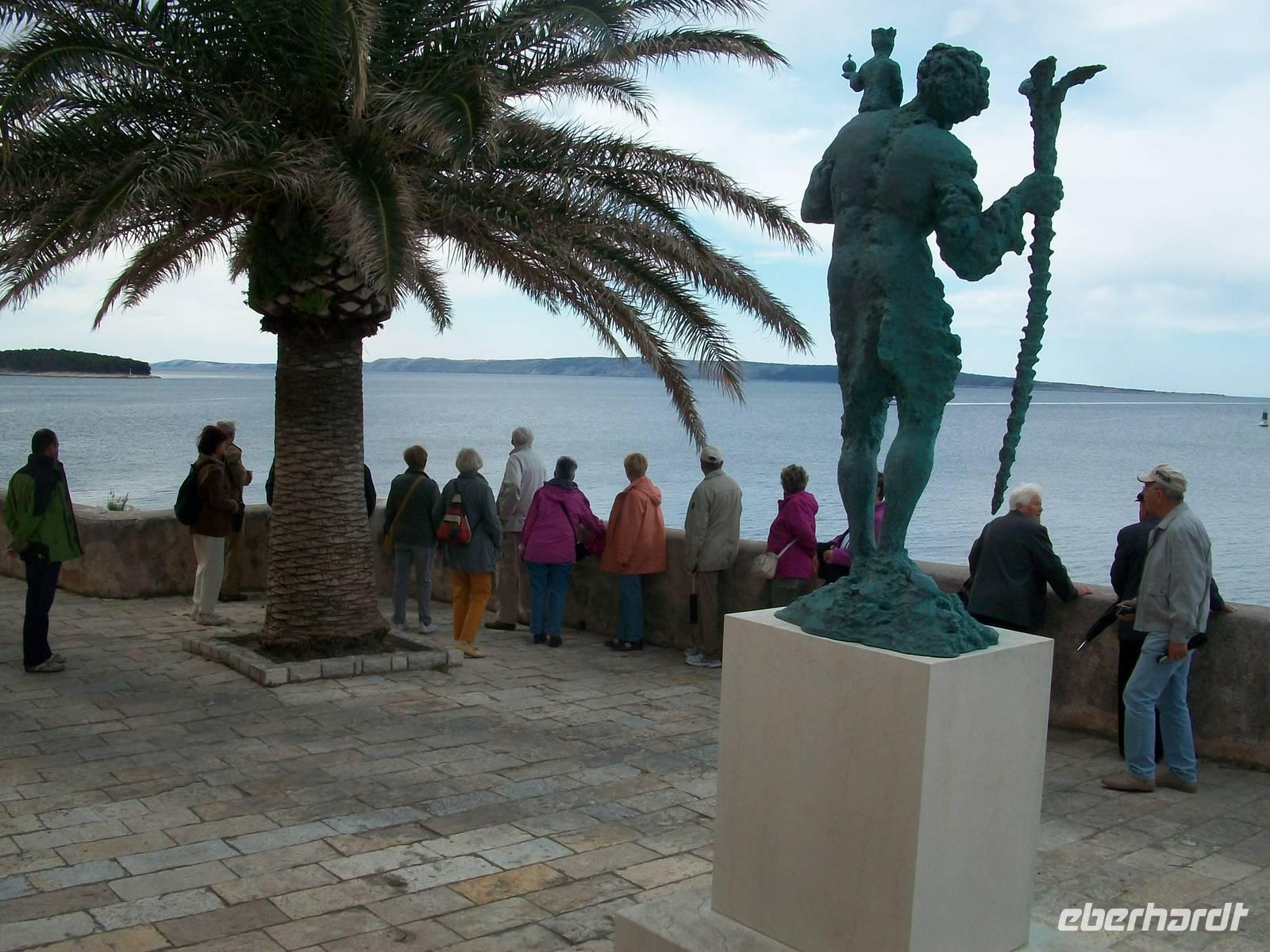 Wir gelangen über die Stufen die vom Hotel hinunter führen an das Hafenbecken von Rab. Hier sind viele Ausflugsboote festgemacht, unser Weg führt aber hinauf zur Altstadt. Entlang der unteren Gasse führt uns der Spaziergang entlang zahlreicher Souvenirbuden, schön ist aber auch hier die Architektur anzuschauen. Am hinteren Ende der Stadt sehen wir das Denkmal von Marin, er begründete einst den Ort San Marino, er stammt von hier. Der Weg führt uns aufwärts; wir kommen an den Klöstern vorbei, erblicken die Kathedrale und da heute Sonntag ist, sehen wir die Gläubigen zur Heiligen Messe gehen. Am Aussichtspunkt mit der Freiheitseiche schauen wir auf das Meer und die Inseln und erleben solcherart einen schönen Vormittag.