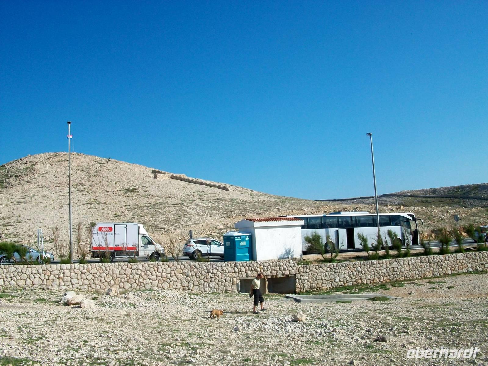 Etwas später als geplant, aber mit einem reparierten Bus, verlassen wir Zadar und gelangen zum Velebitgebirge. Direkt am Fuße der mächtigen Berge verläuft unsere weitere Fahrt; wunderbar ist die Inselwelt anzuschauen, hin und wieder treffen uns Stöße des Bora- Windes, sie können aber heute nicht gefährlich werden.