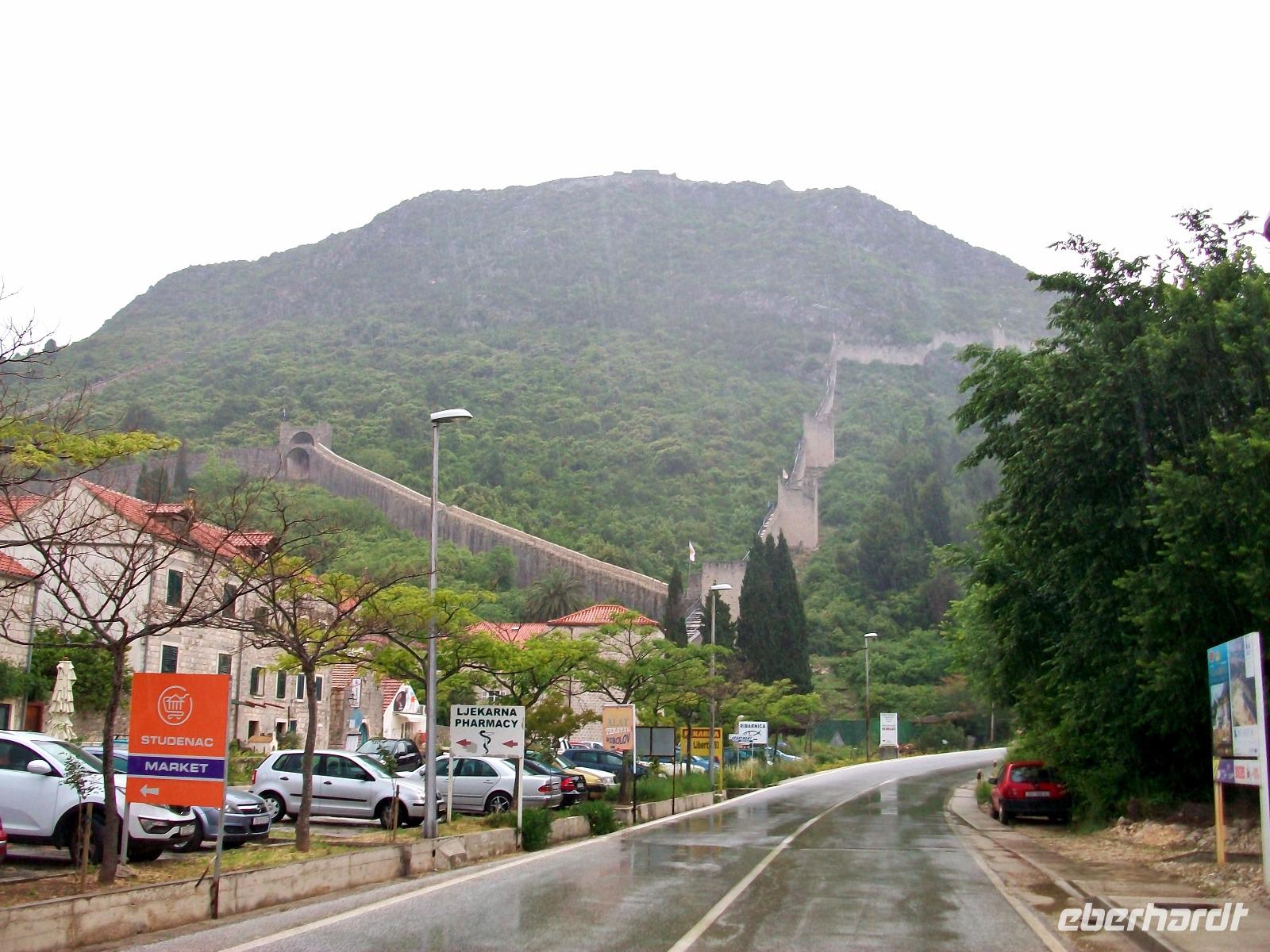 Wir verlassen die Uferstraße und erreichen die Halbinsel Pelješac. Gleich am Anfang bewundern wir den Ort Ston mit den mächtigen Schutzmauern, sie sicherten einst die Salzgewinnung von Dubrovnik. Leider lässt es Petrus gerade hier wieder stark regnen, aber beim Vorbeifahren sehen wir die Anlage der Salinen und im Hintergrund auch die mächtigen Schutzmauern.