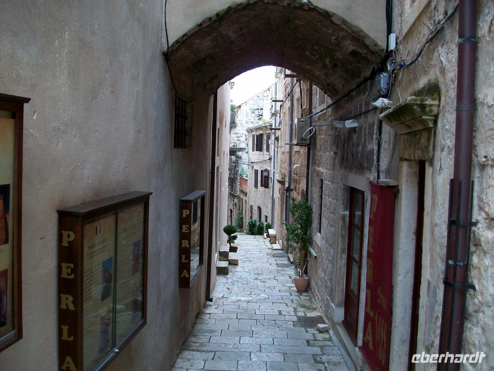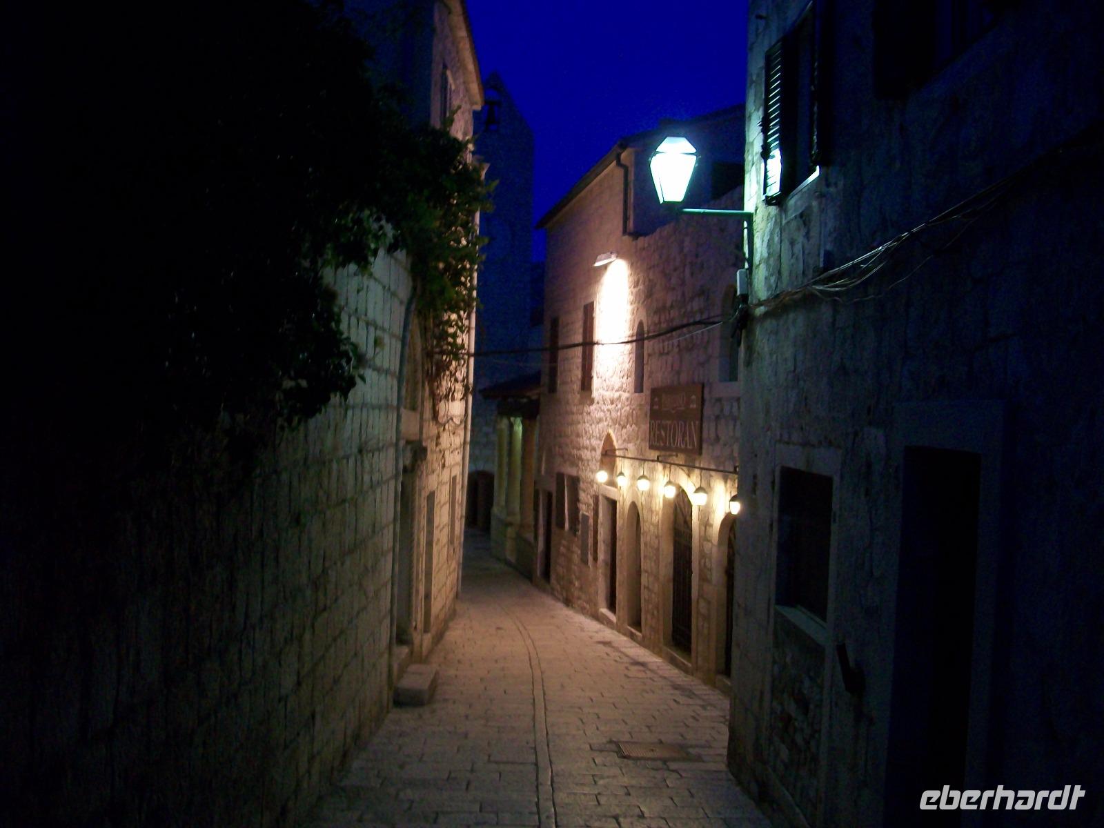 Am Nachmittag erreichen wir dann unser erstes Ziel, die Stadt Trogir. Sie blieb weitestgehend im Originalzustand erhalten, deshalb genießt der Ort auch den besonderen Schutz der UNESCO. Wir gehen erneut auf eine Zeitreise. Unsere Phantasie bringt uns wieder in eine längst vergangene Epoche zurück; wir erahnen das Leben der venezianischen Kaufleute, die Intrigen von Adel und Klerus in einer Zeit die für das einfache Volk recht schwer war. Still sind die heimlichen Gassen, turbulent wird es am Hauptplatz mit der Kathedrale und den Palästen. Besonders gemütlich können wir den Cappuccino auf der sonnendurchfluteten Promenade genießen, die hier festgemachten Schiffe und Jachten schaukeln leise auf den Wellen.