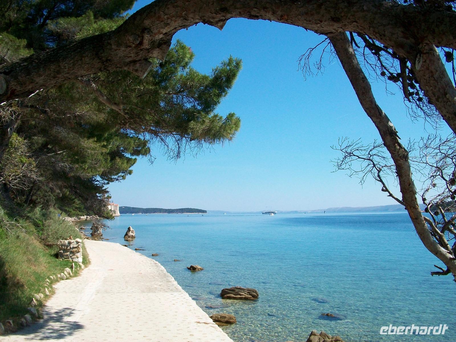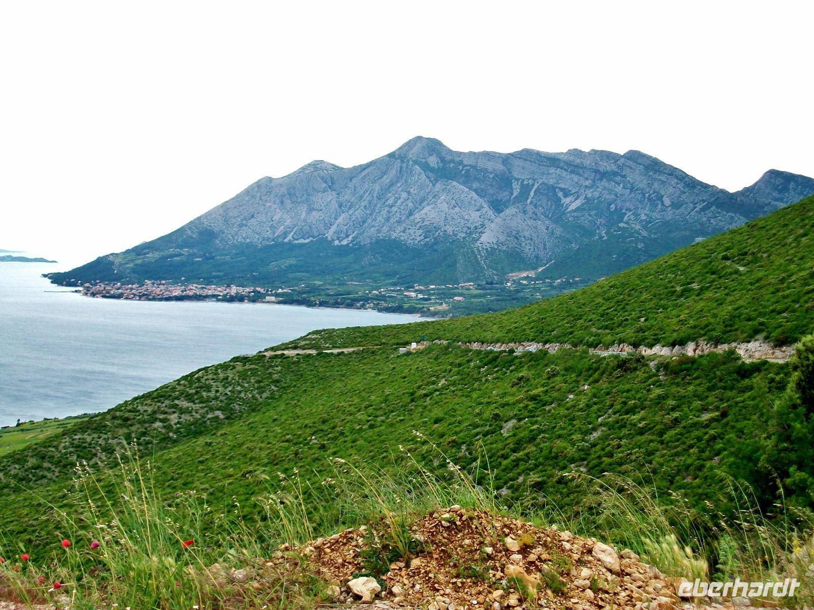 Bei unserer Fahrt sehen wir die vorgelagerten Inseln, an einer Bucht sprudeln unterseeische Süßwasserquellen empor und zu unserer Linken erheben sich die mächtigen Berge des Biokovogebirges, manche haben sich eine Wolkenmütze aufgesetzt.