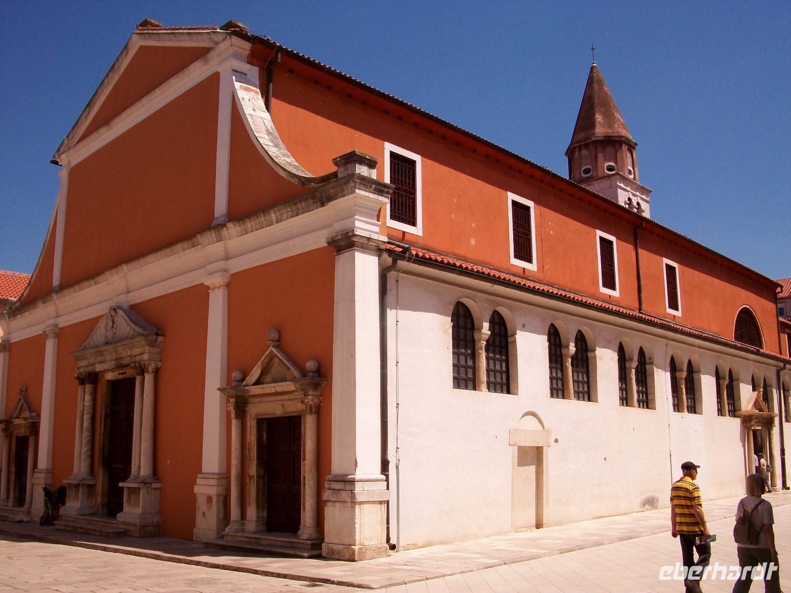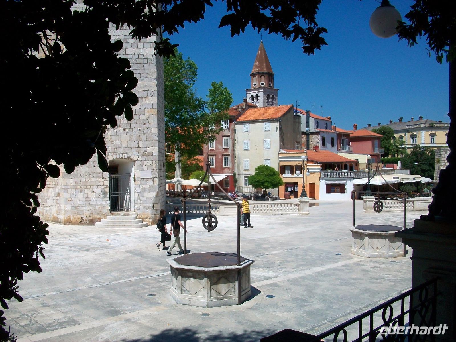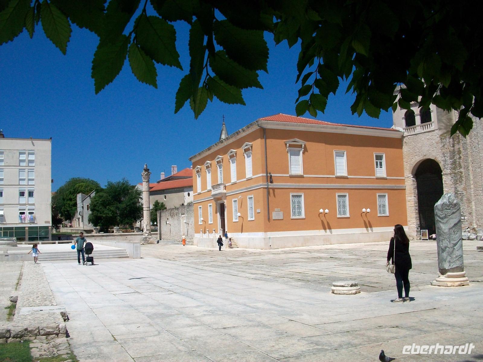 Auf dem großen Platz sind gleich mehrere wichtige Sehenswürdigkeiten der verschiedenen Epochen vereint. Da wäre das Forum Romanum, dahinter die Rotunde der Donatskirche und im Hintergrund der Turm der Kathedrale, viele Jahrhunderte sind hier in Stein verewigt.