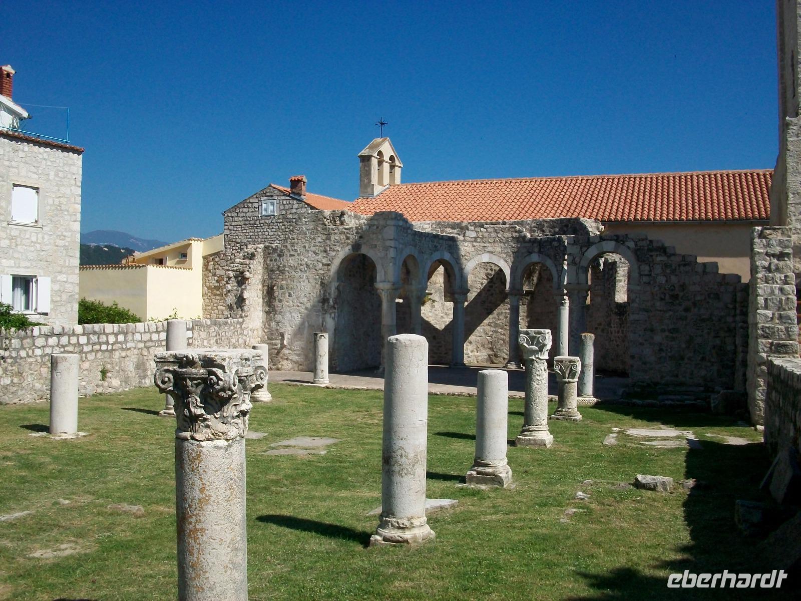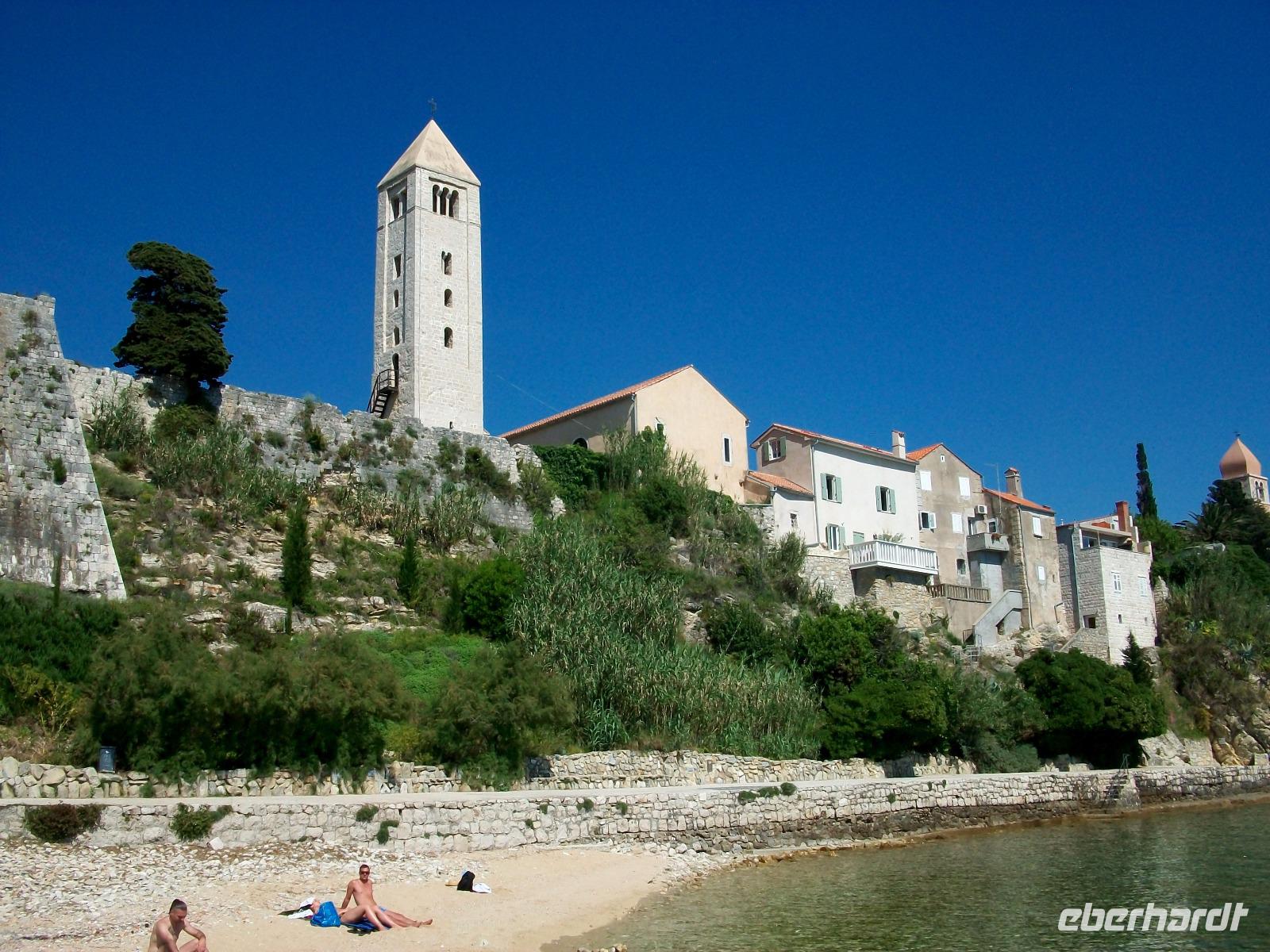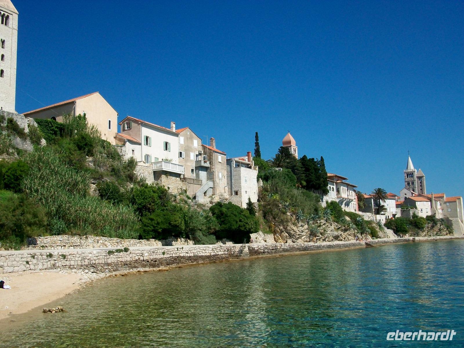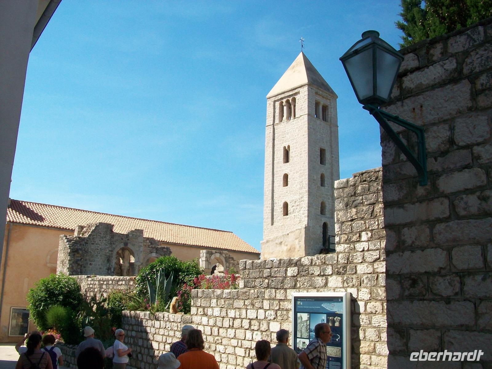 22.5.2016. Pünktlich um neun hat sich Robert eingestellt, er wird unsere Gruppe heute betreuen und wir haben uns einiges vorgenommen. Uns steht ein weiterer sonniger Tag bevor und wir beginnen mit einem gemütlichen Spaziergang durch die Altstadt von Rab. Vom Hotel sind es nur wenige Meter bis zum kleinen Hafen und gleich hier tauchen wir in die reizvollen Gassen dieses gepflegten Ortes ein. Bald sind wir auf der oberen Gasse und genießen den Blick auf das Meer und die gegenüberliegende Halbinsel, im Hintergrund ist auch die Insel Lošine zu sehen. Wir staunen über das glasklare Wasser, über das Glitzern der Sonnenstrahlen auf den Wellen und erfreuen uns an den schönen Häusern aus längst vergangenen Zeiten. Vorbei an Kirchen und kleinen Klöstern gelangen wir wieder zum Hafen, hier endet vorerst die Führung.