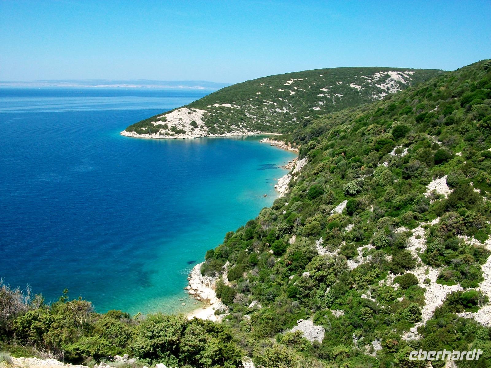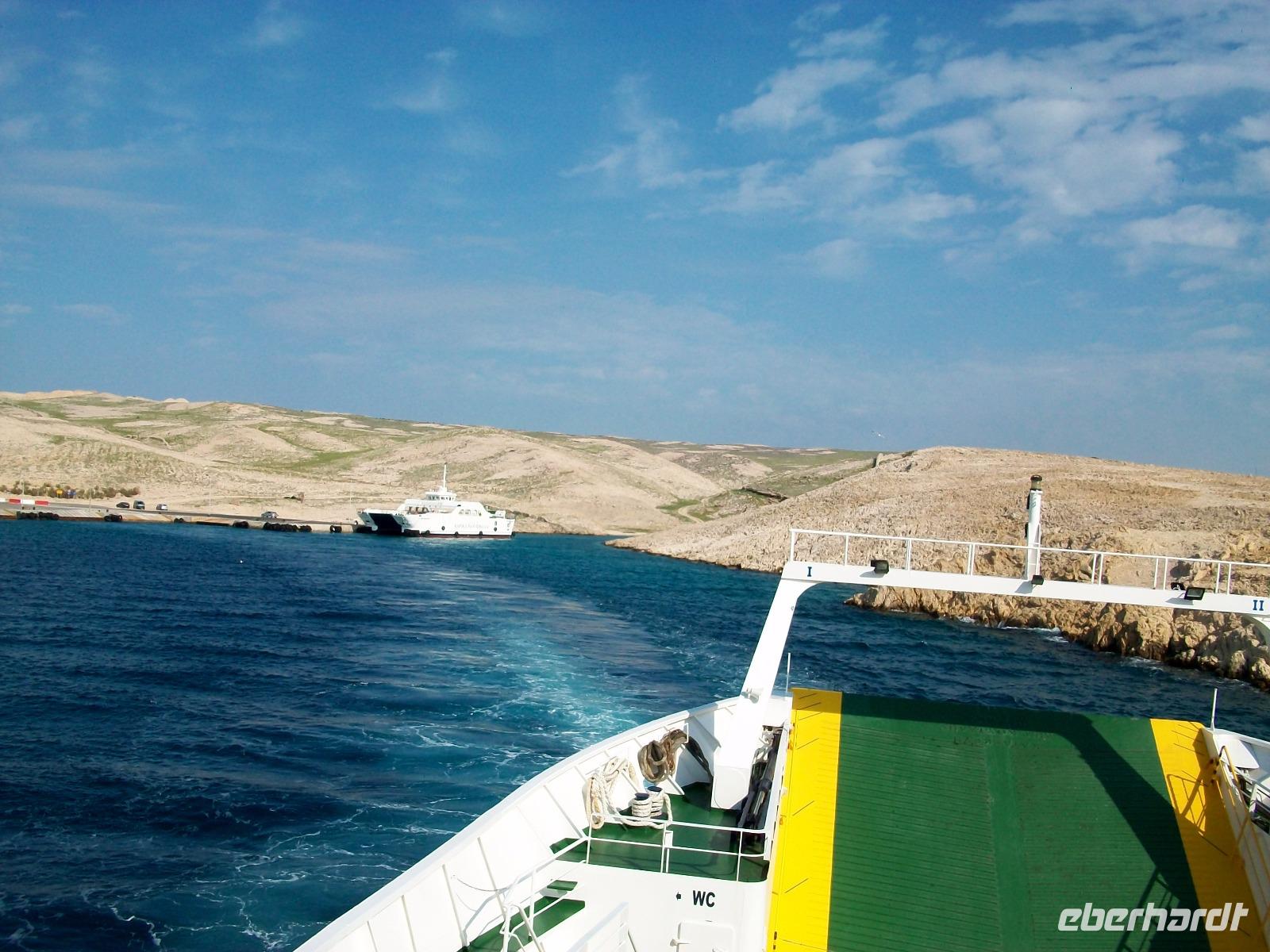 Die Wetterfrösche haben einen Umschwung prognostiziert, aber wir starten bei noch schönem Wetter. Die Fähre bringt uns wieder an das Festland und wir folgen dem Verlauf der Uferstraße. Die kahlen Inseln werden von der Morgensonne beschienen und bilden mit ihrem leuchtenden Weiß einen einmaligen Kontrast zum tiefblauen Wasser der Adria.